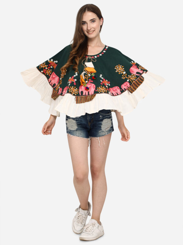 Elephant Embroidered Deep Green Khadi Circular Poncho