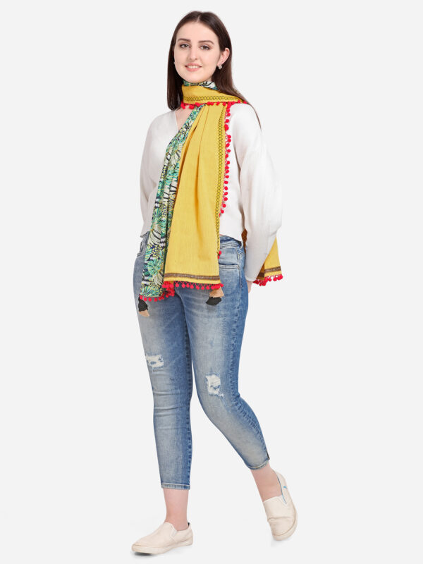 Tropical Print Yellow Khadi Tomato Pompom Dupatta