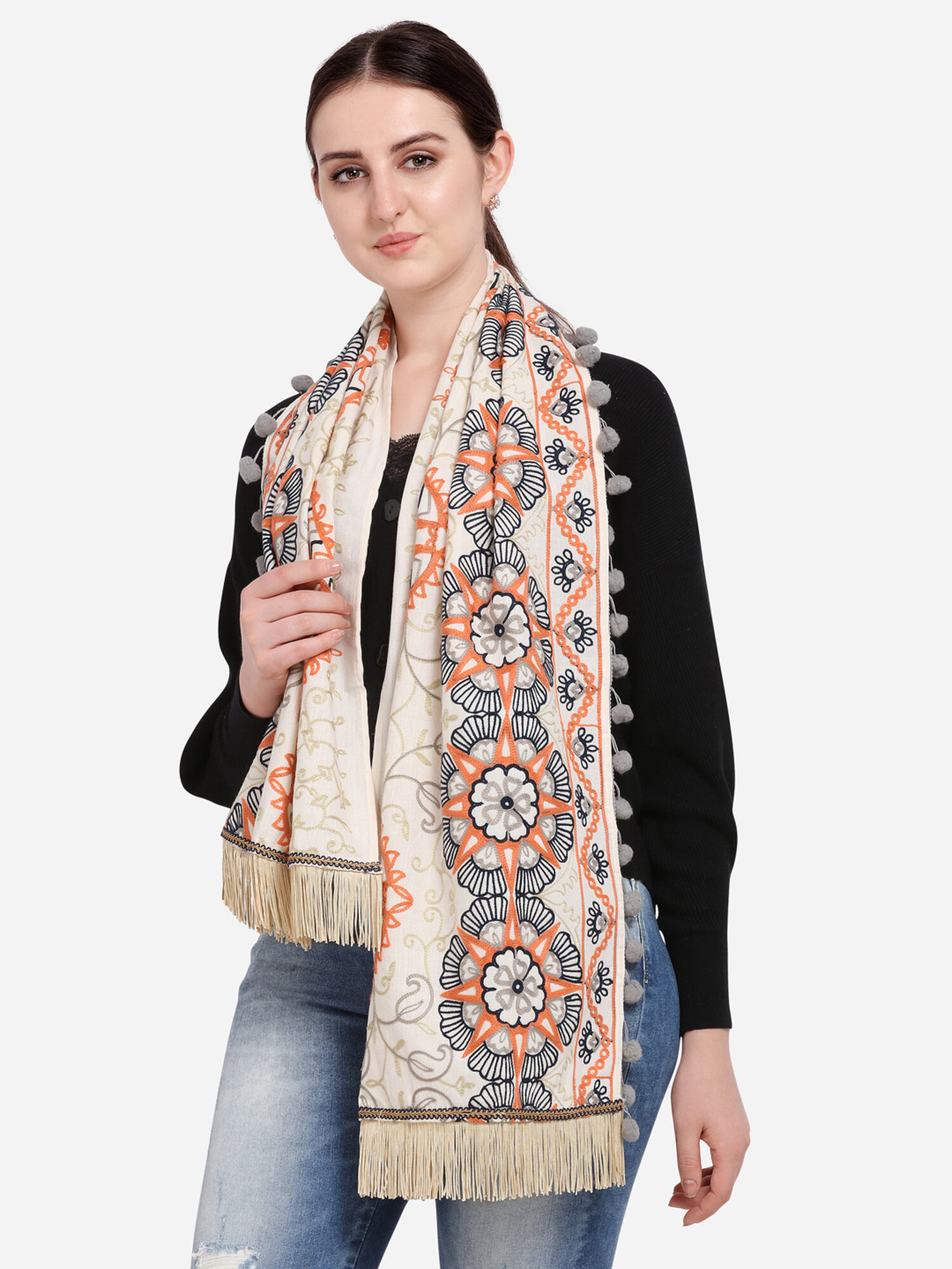 This off white muffler is crafted in 100% khadi cotton fabric. It is fully embroidred with minute aari work in different circular motifs fenced with embroidered border. It is embellished with fancy fringe lace and dyed big pom pom lace. The muffler is Perfect for your casual outfit. its a multi seasonal stole can be wore in any season on any outfit. The khadi fabric gets softer after every wash this makes it special.