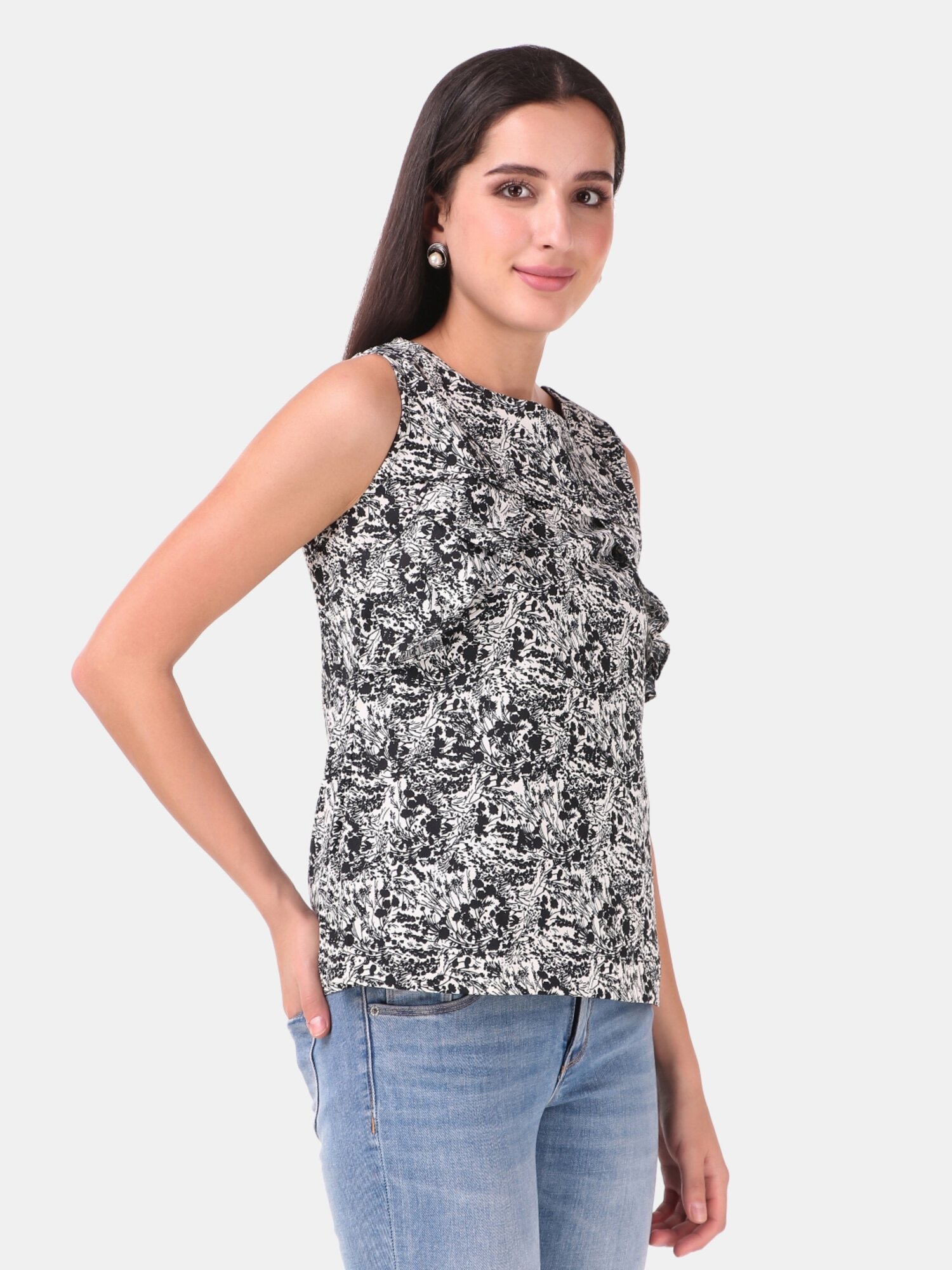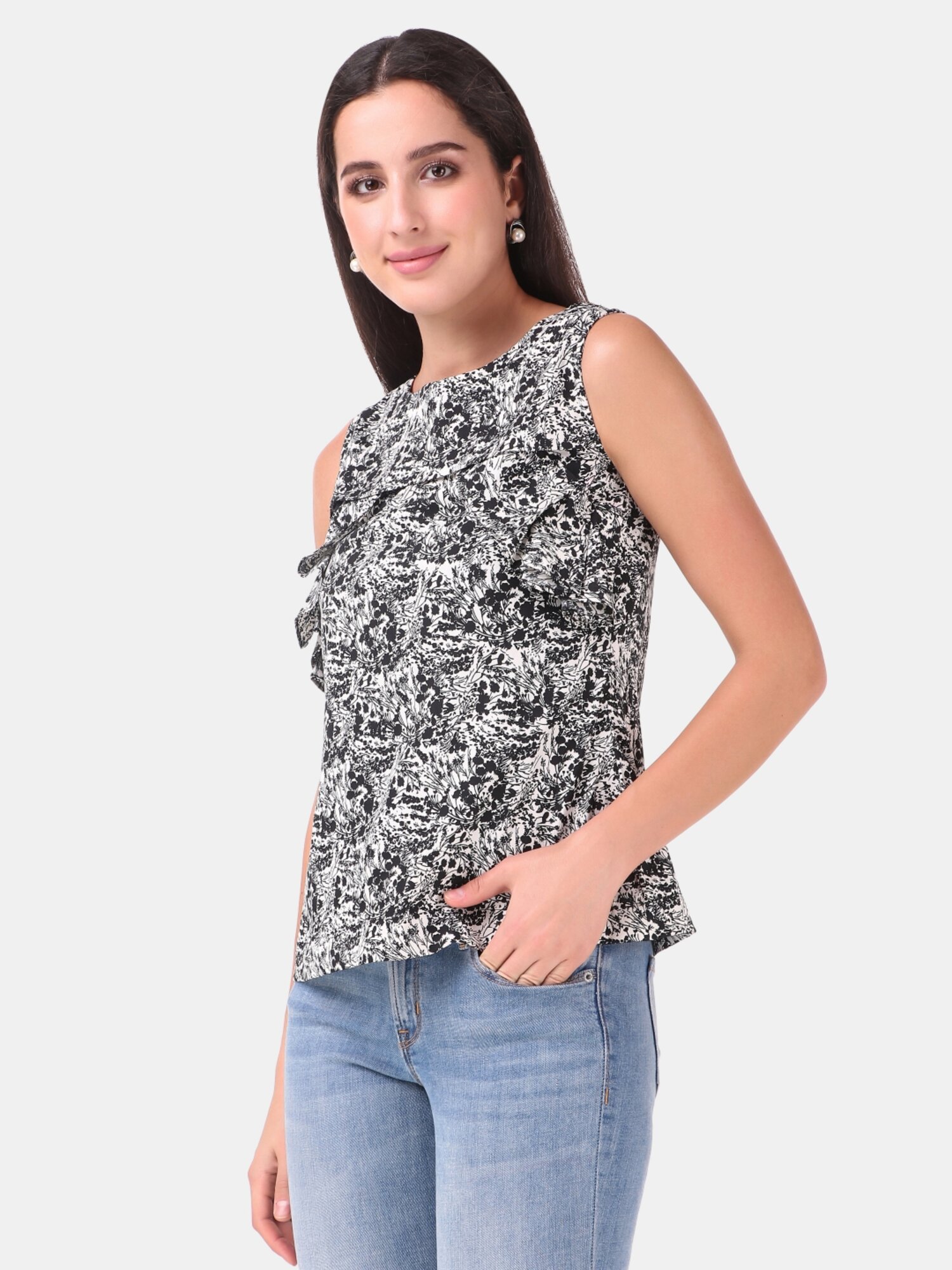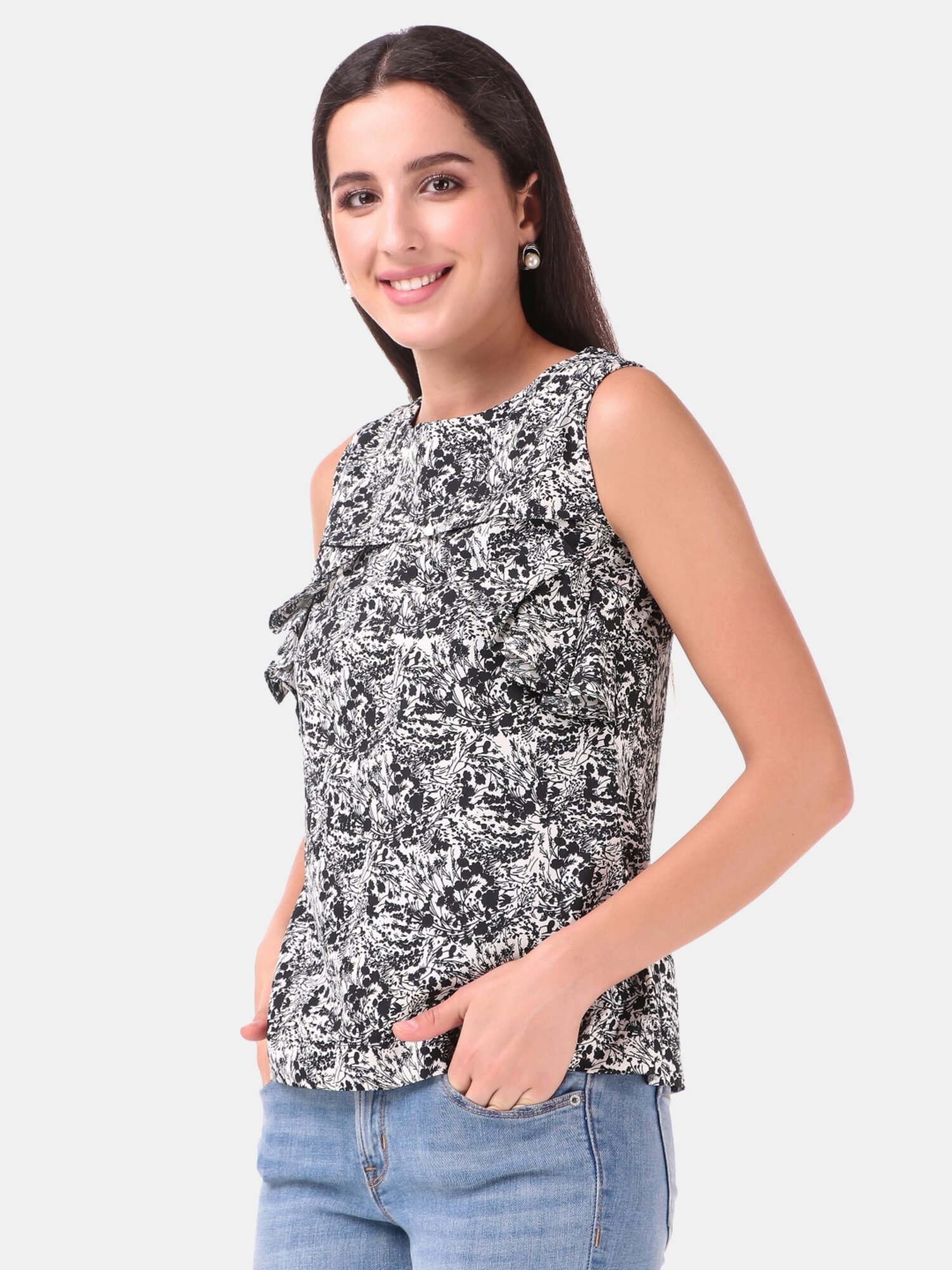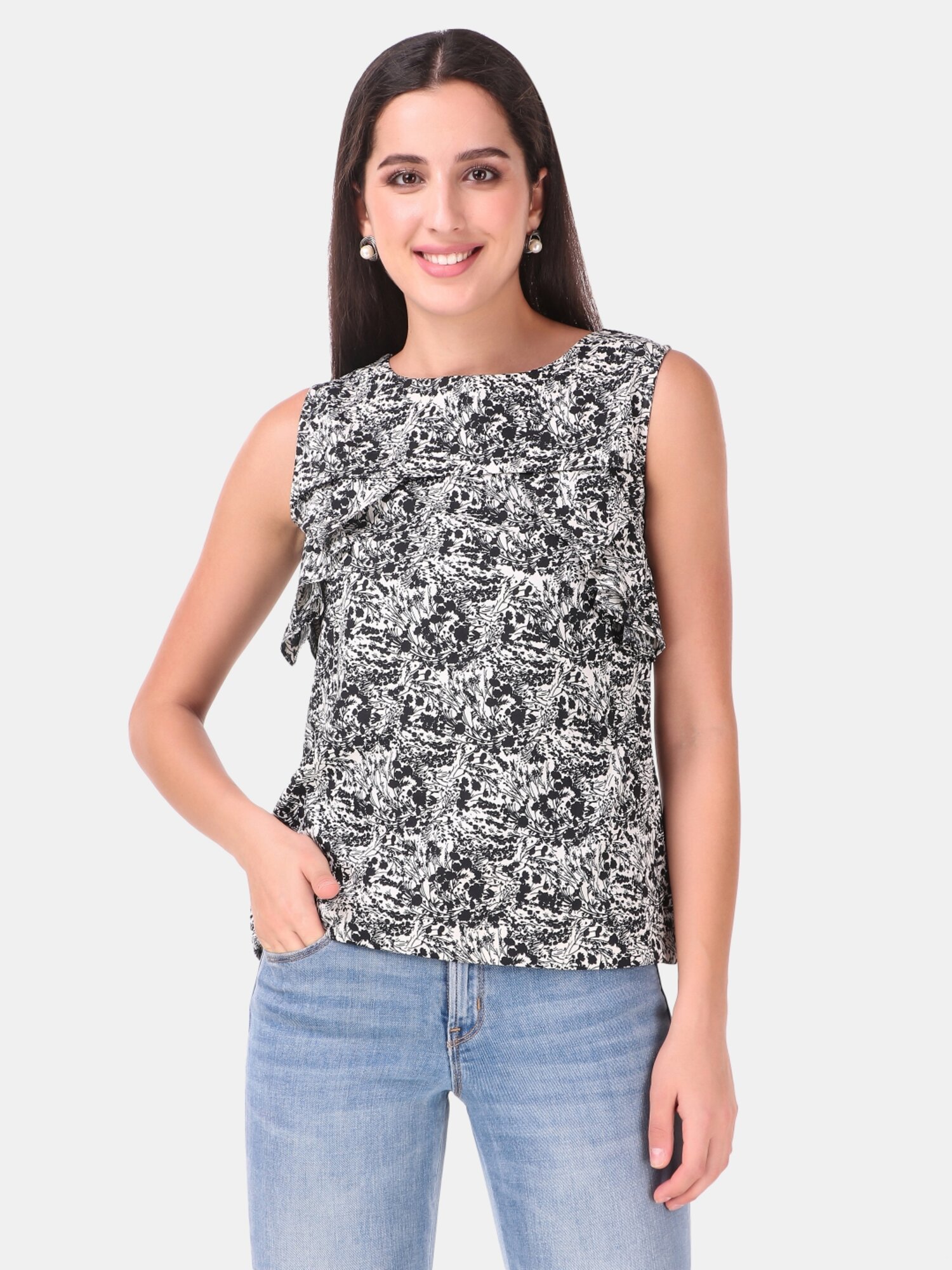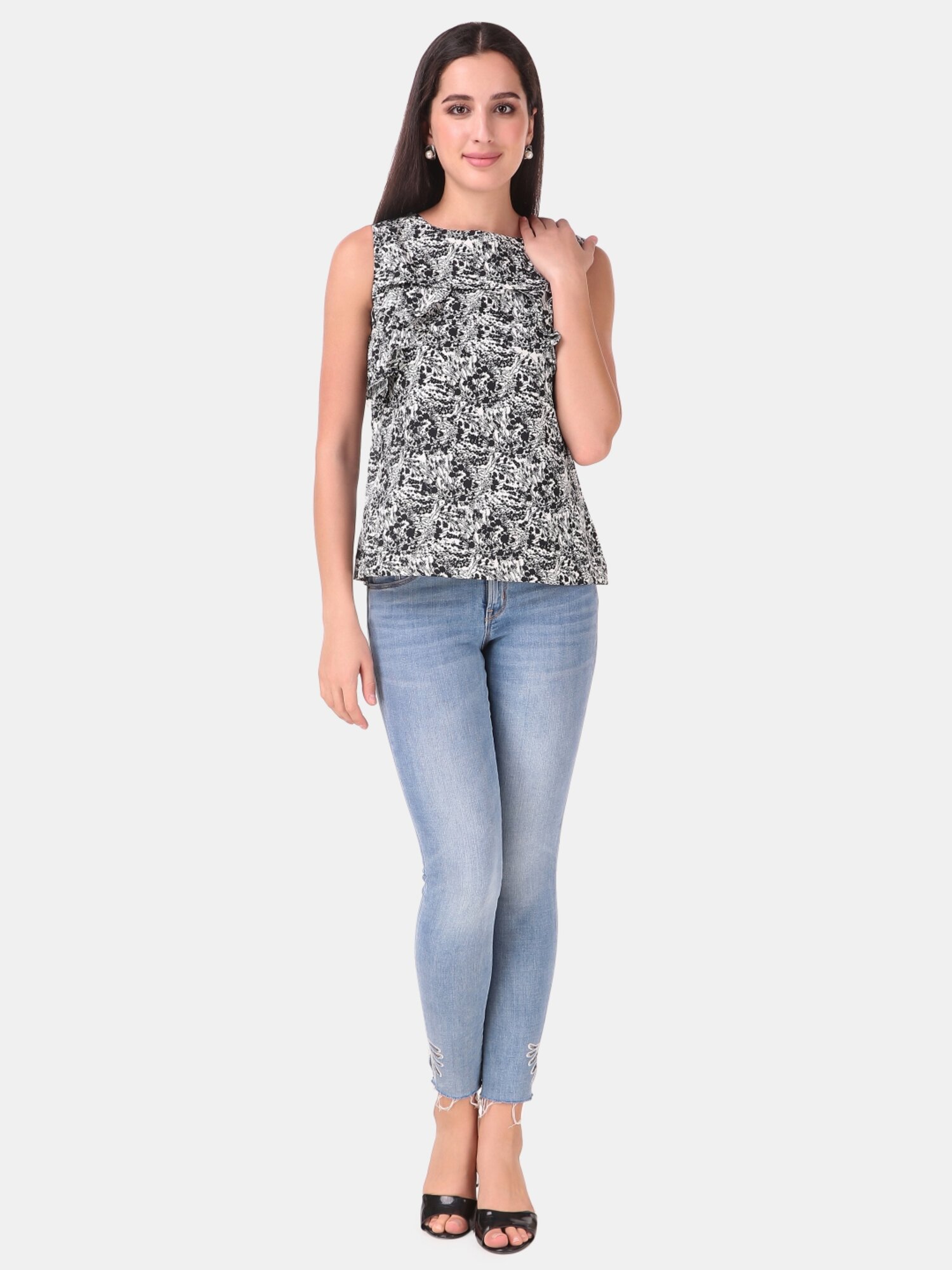 This black and white top is perfect to wear in summers, it has sleeves with round neckline, with front frill pattern. A perfect top to wear in summers .