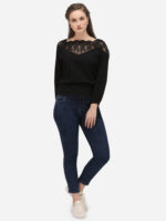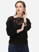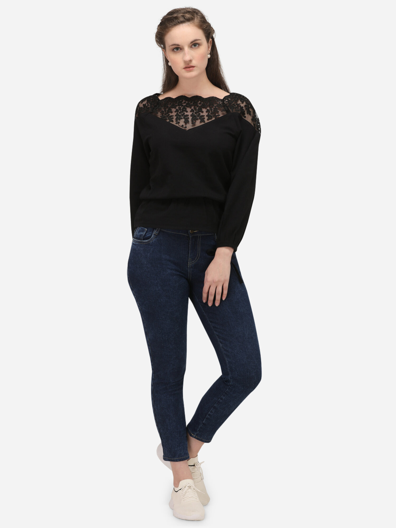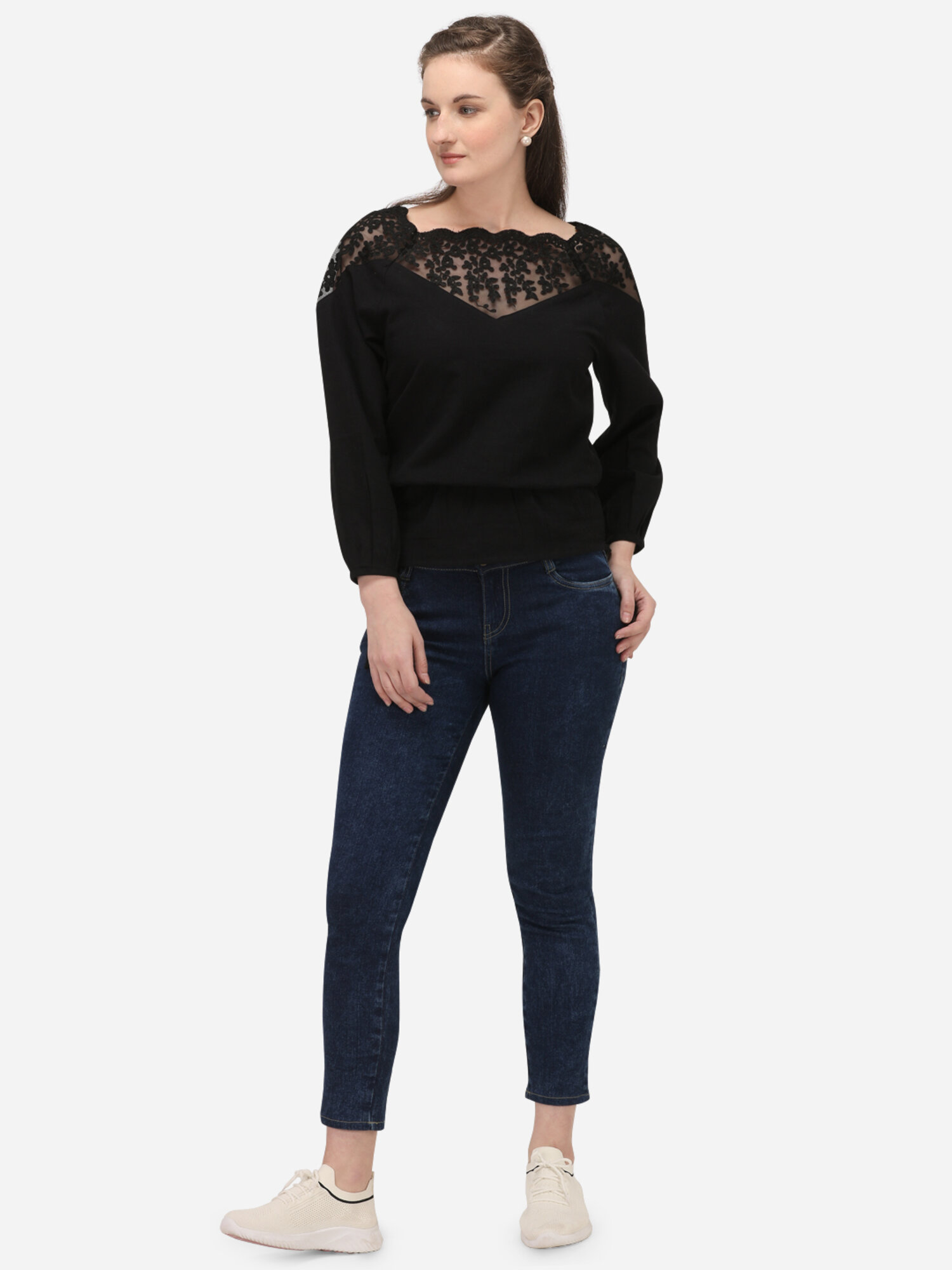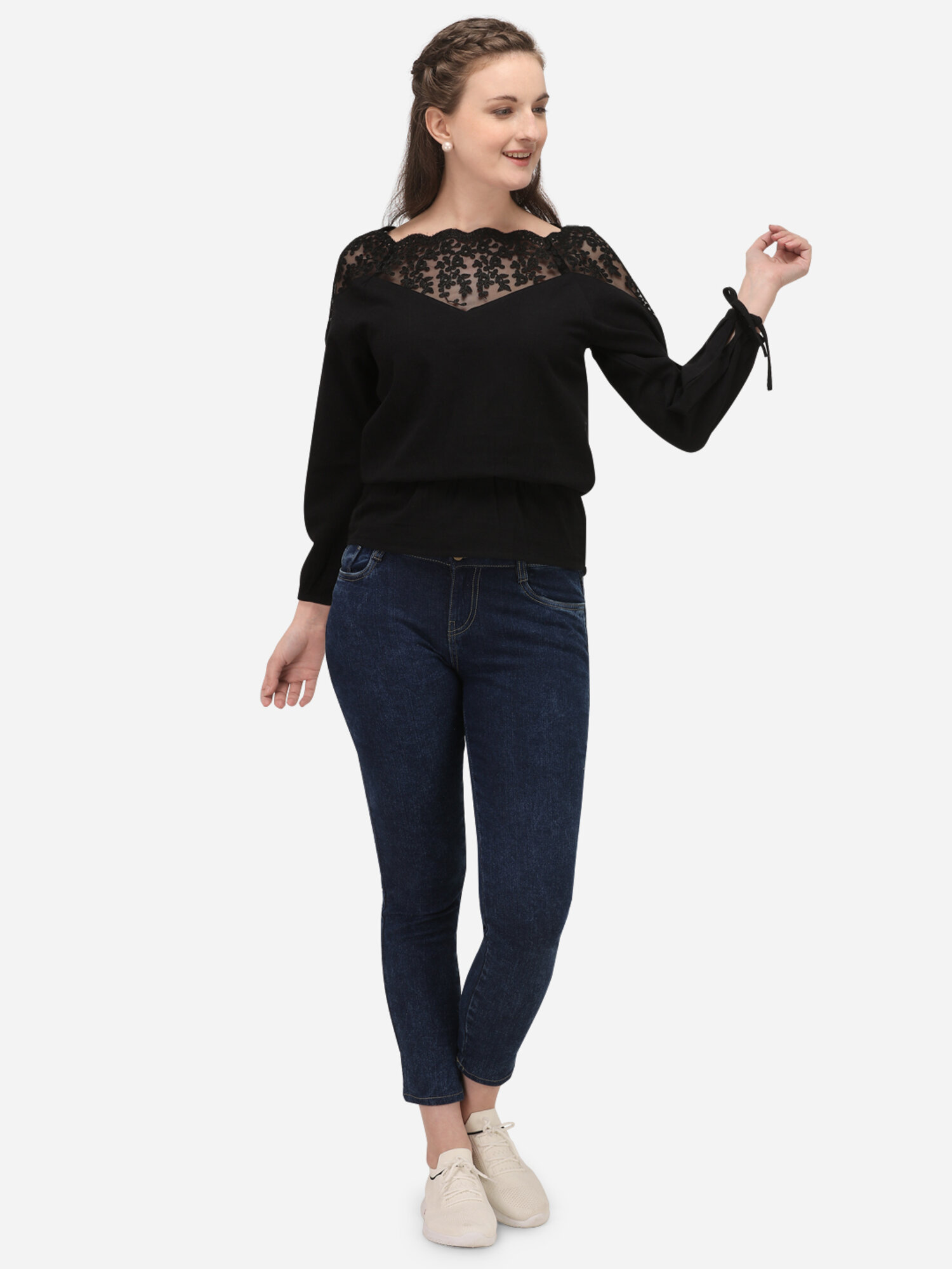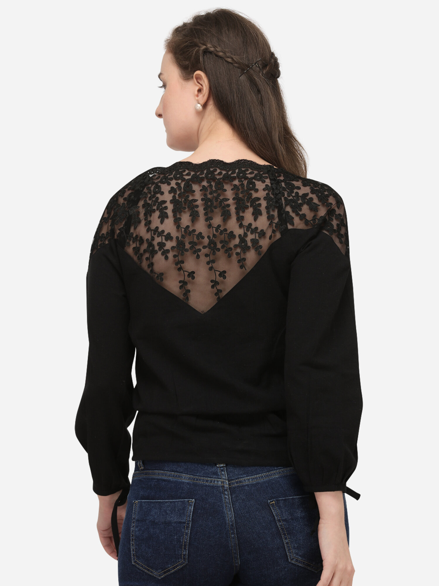 Solid black top with embroidered net and reglan sleeves which can be paired with jeans for parties and various meet-ups or any other events.