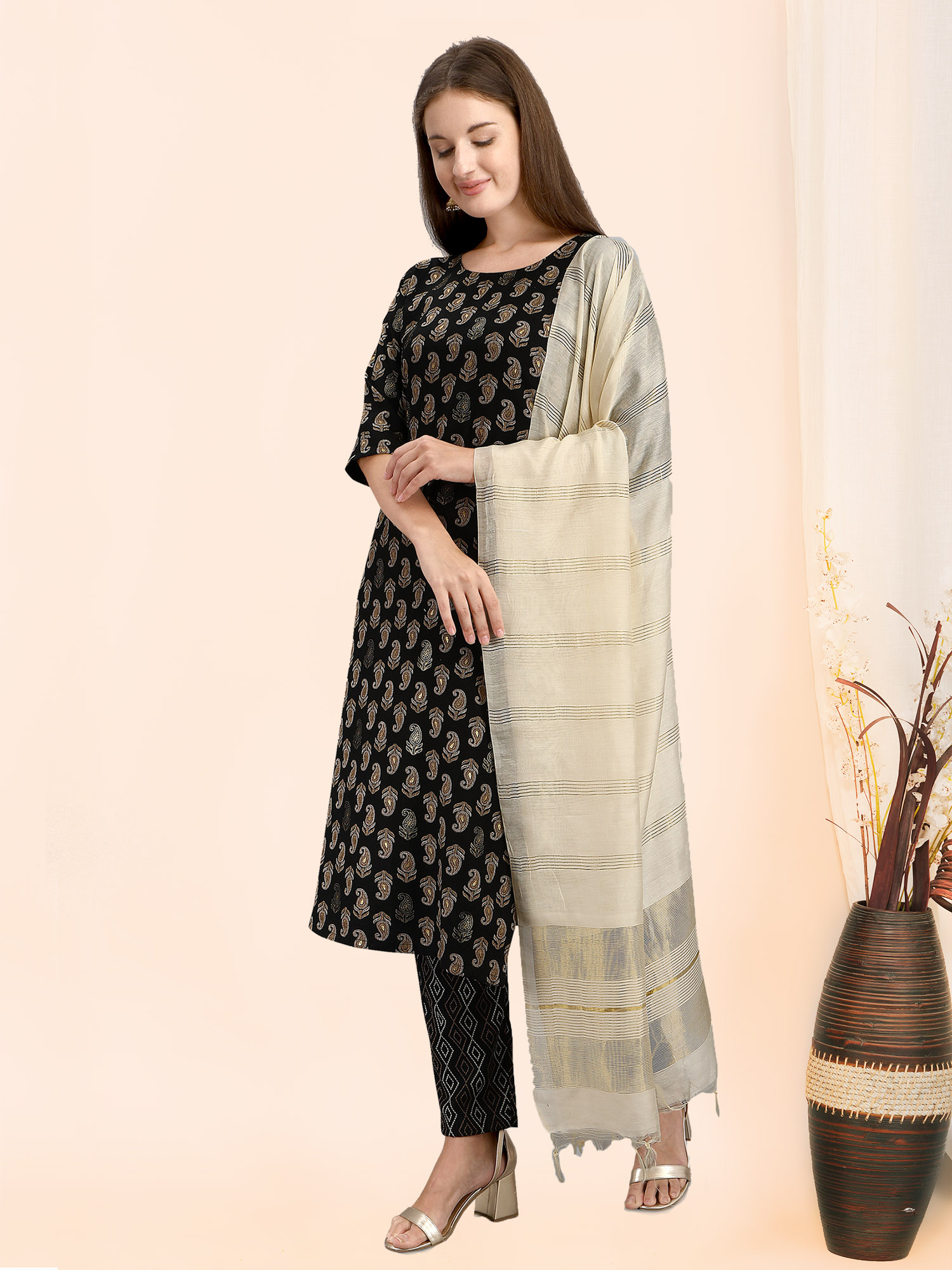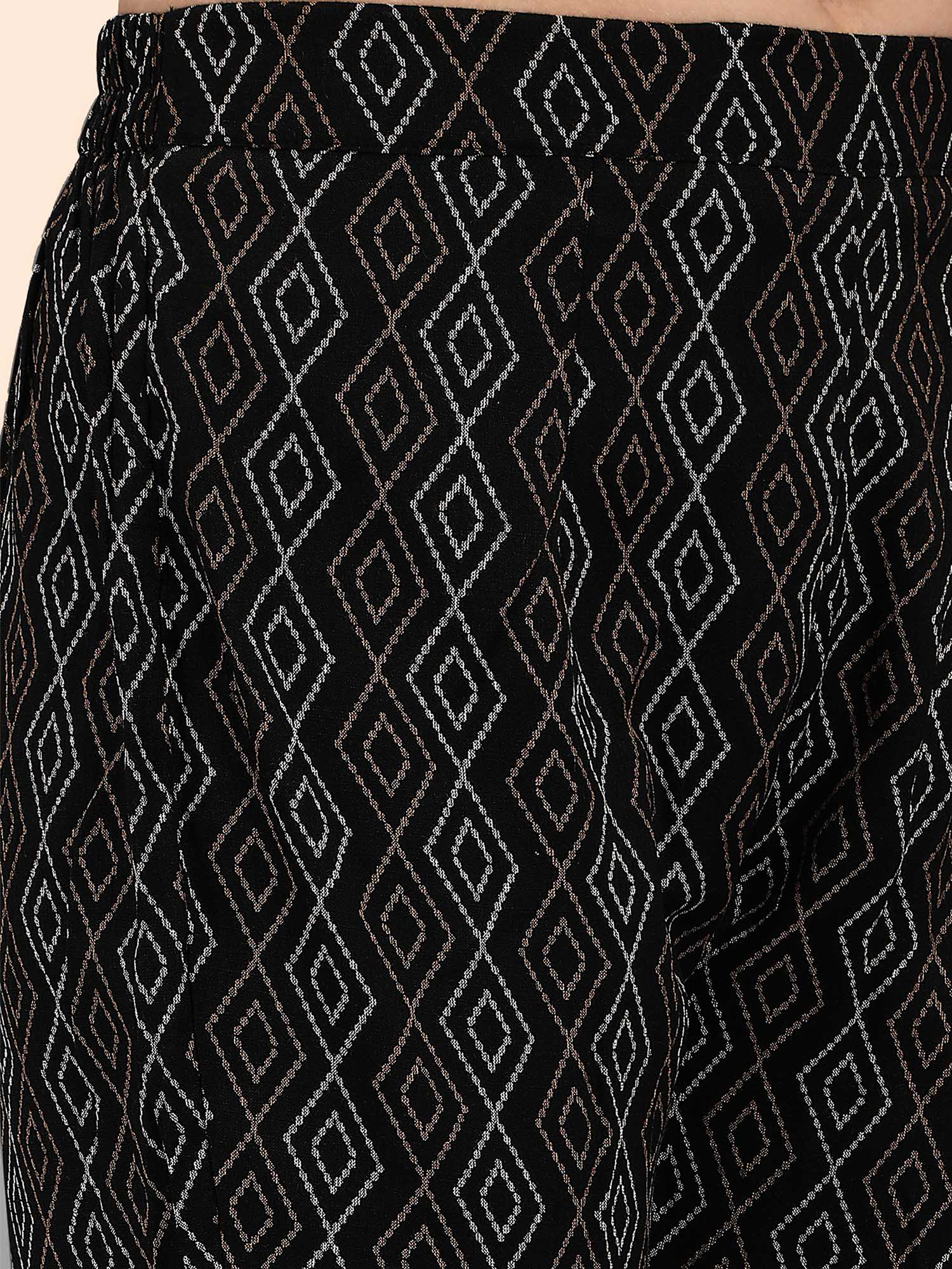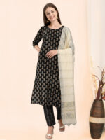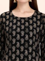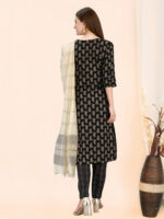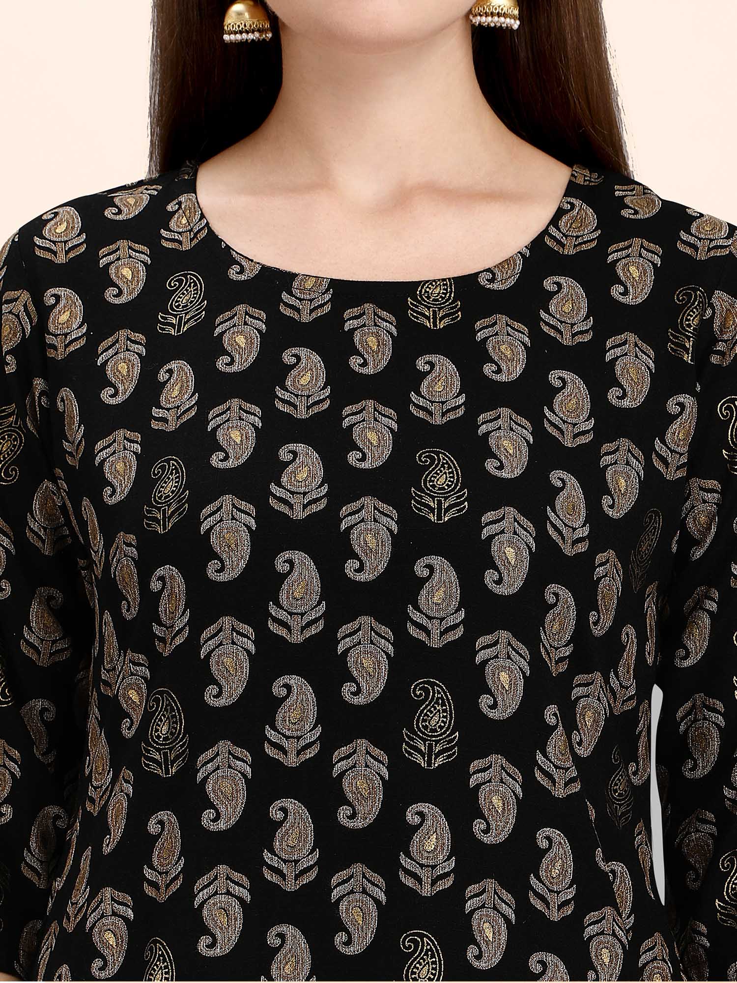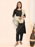 Black rayon kurti with capsule print . It has 3/4 sleeves and round neck . Paired with straight capsule printed pant and silk dupatta . The pant has all over elastic at the waist .