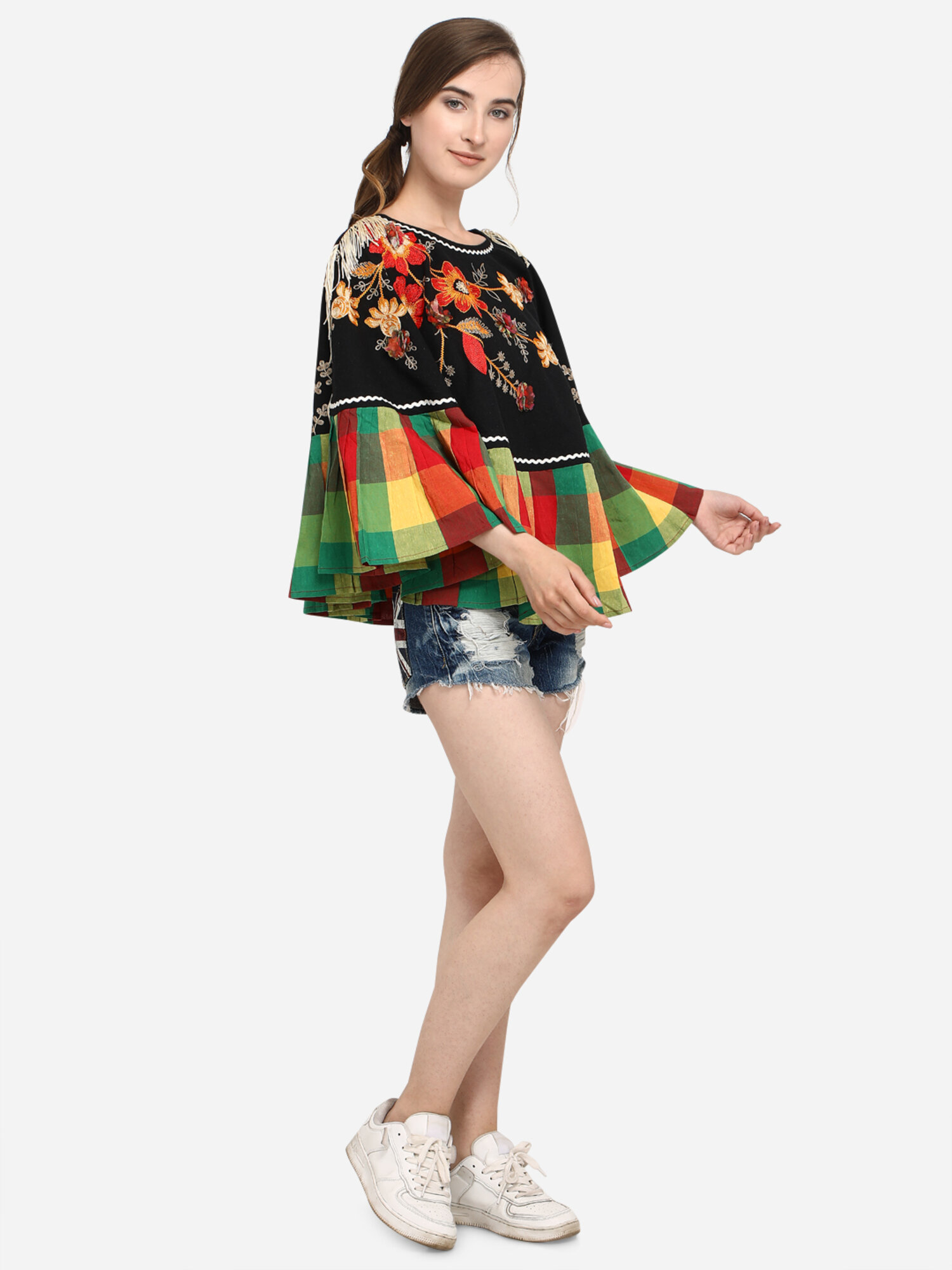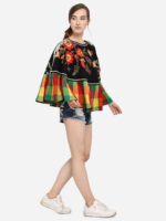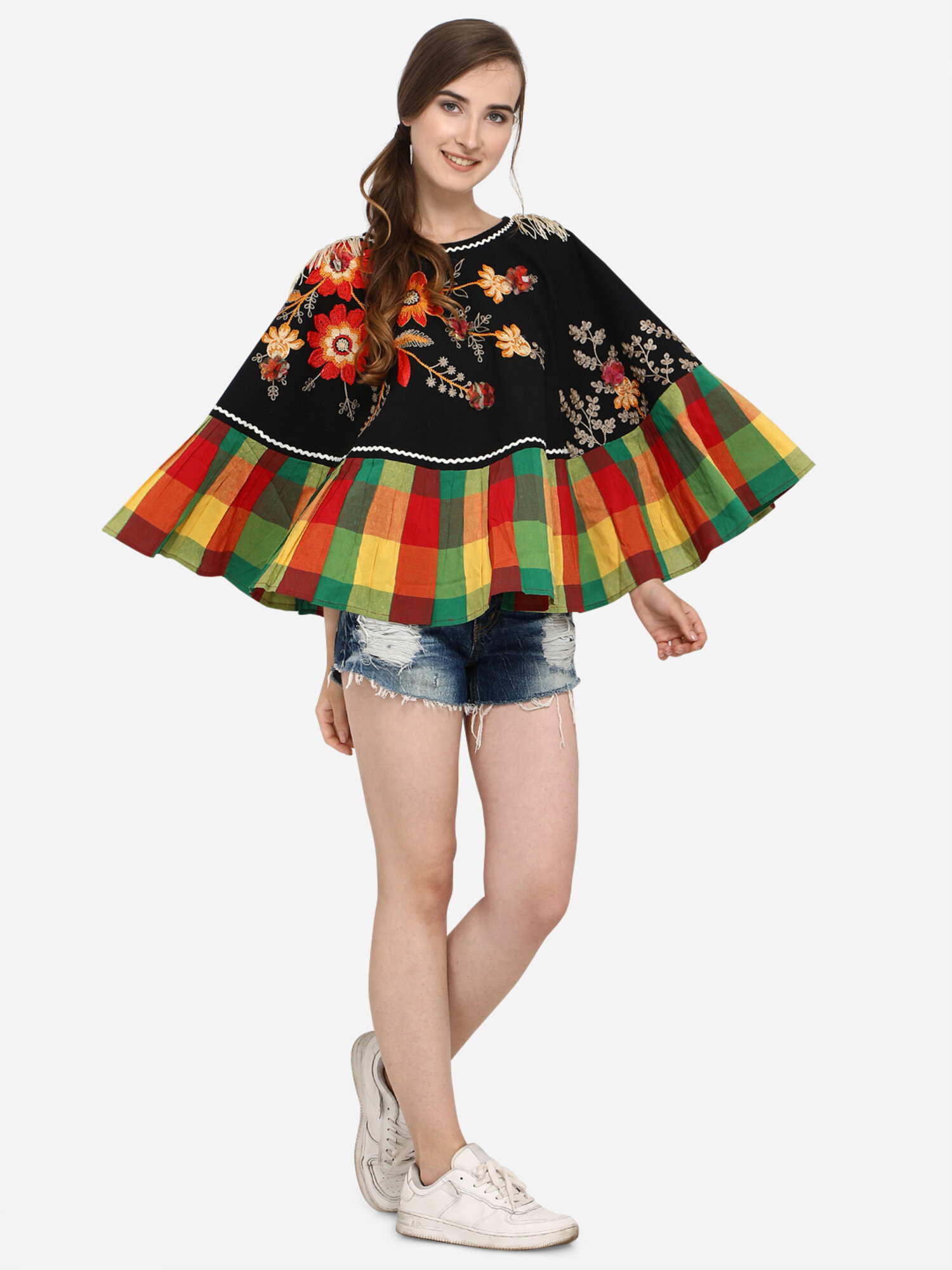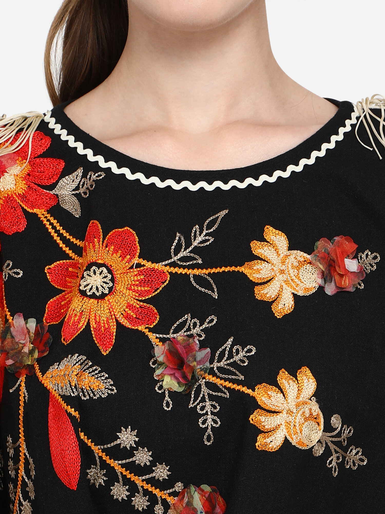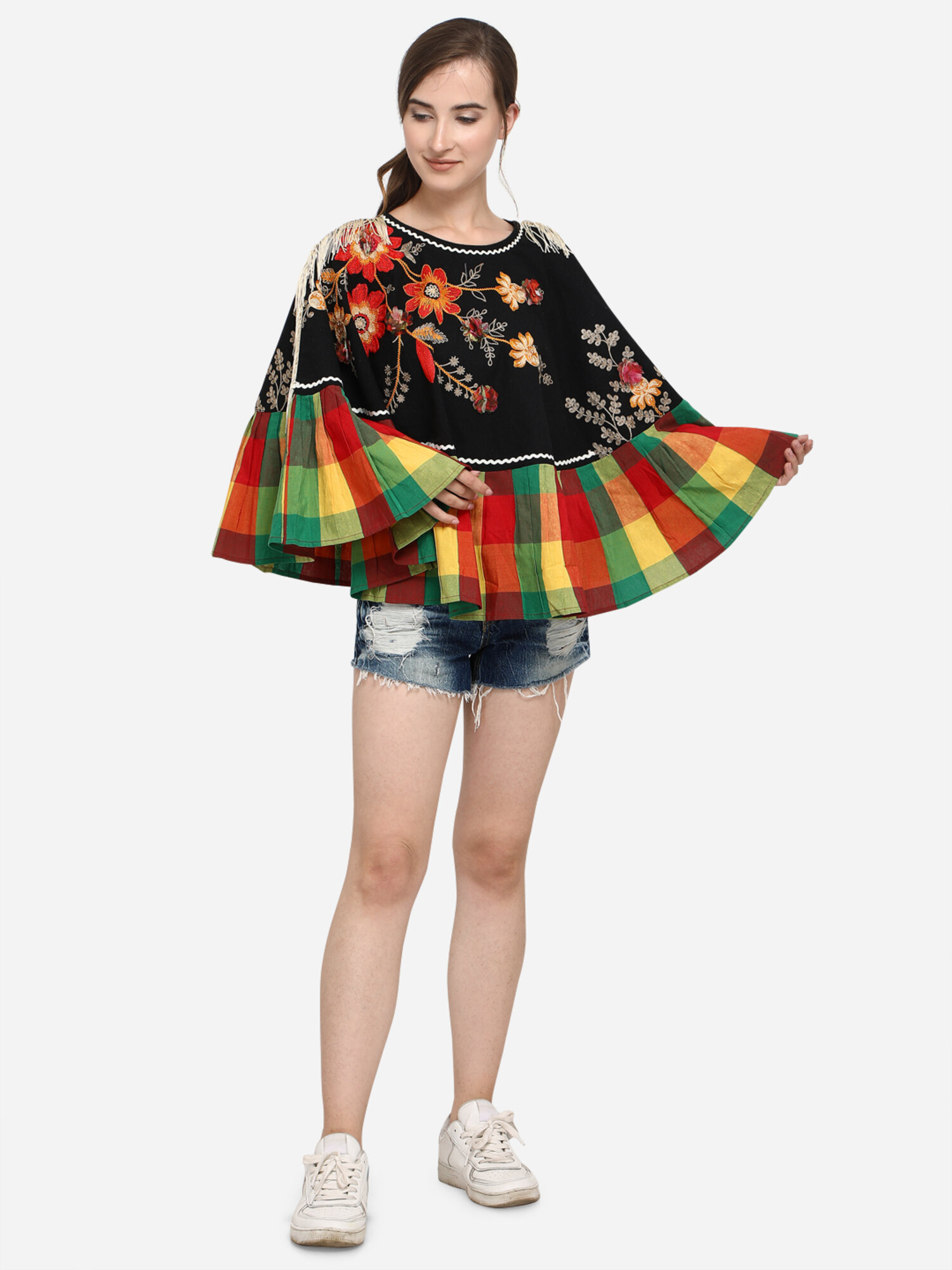 Now Forget your regular Tops and try MESMORA’S unique RANGEELA RE colourful embroidered ponchos? Minute woollen and jute embroidery, both front and back decorated by Dazzling laces and *3D flowers. 100% khadi that keeps you warm in winters and cool in summers.?Wear it on your regular top as winter poncho, on a gown as a style element, and on beaches and holidays . 28″ long? circular ponchos with front and back embroidery? and fits up to 46″ chest size.