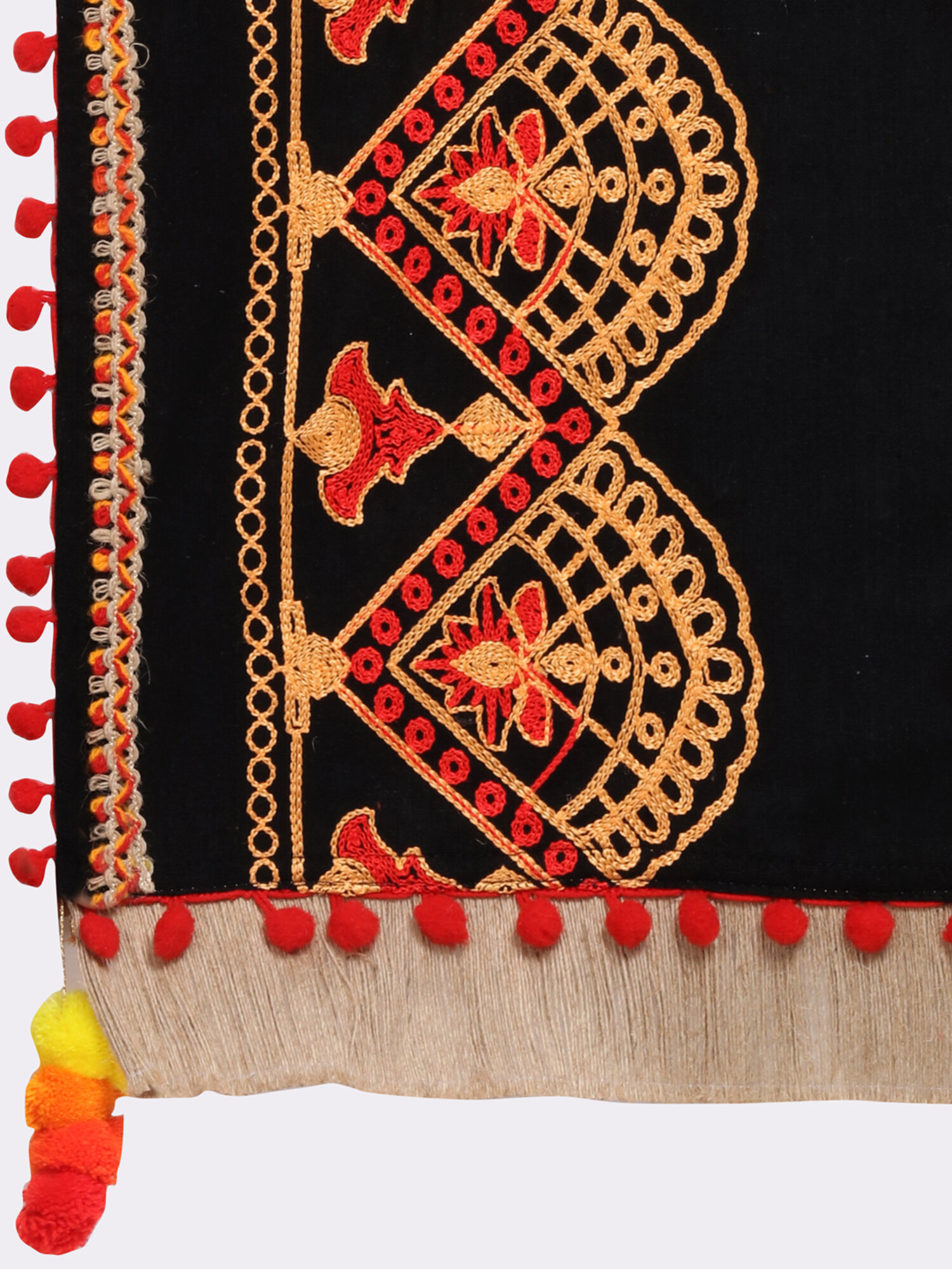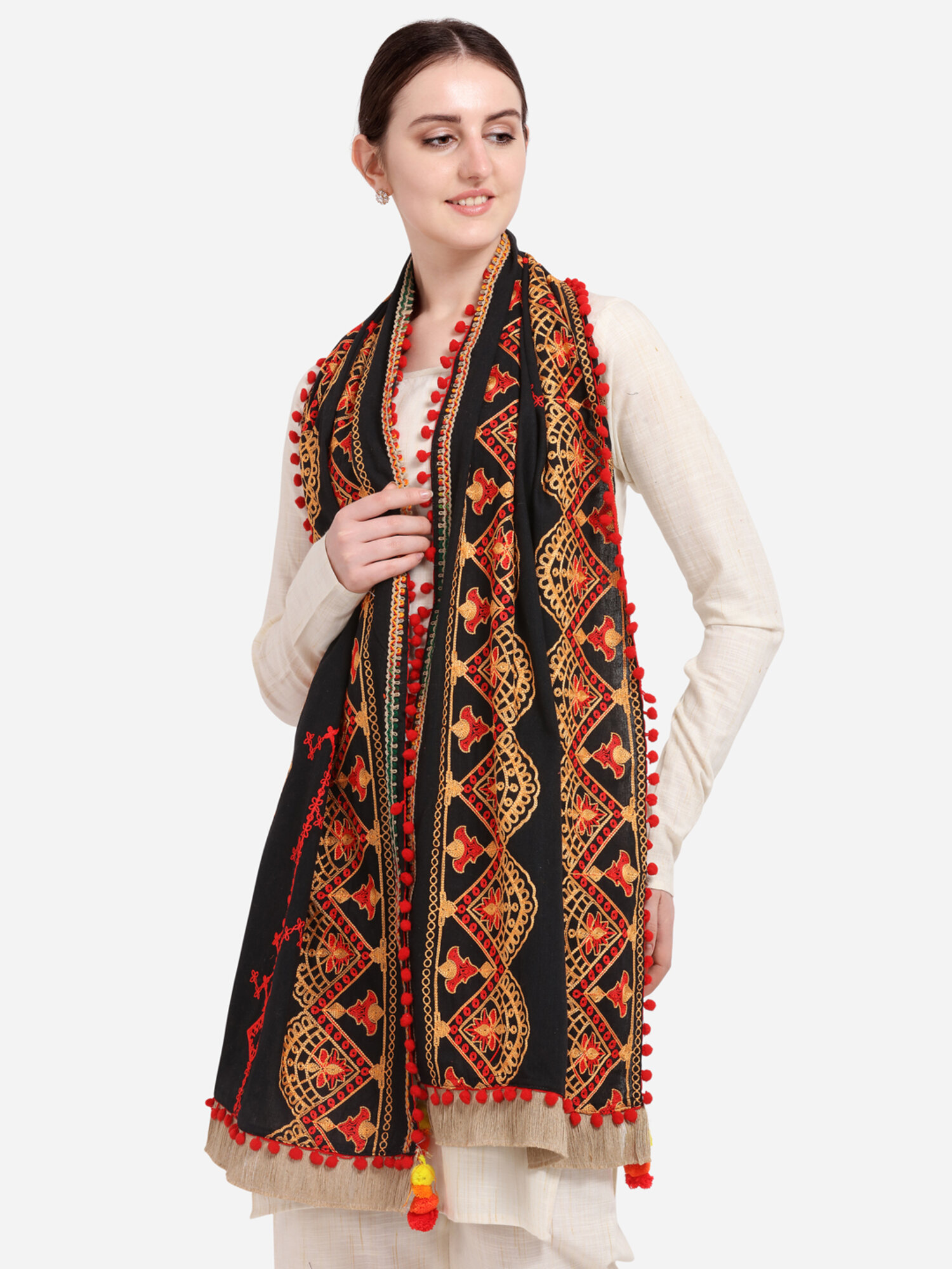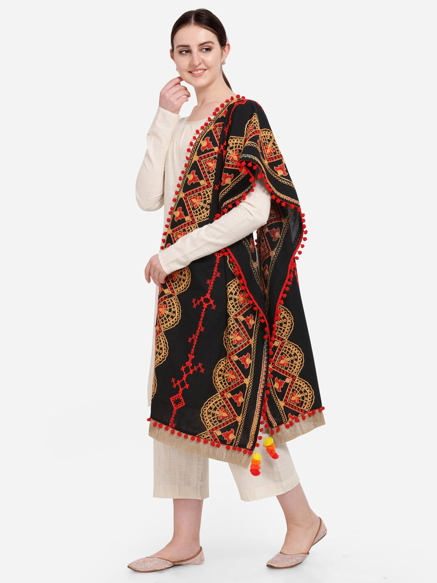 This black dupatta is crafted in organic khadi cotton. It is embroidered with minute aari work in different motifs. It is embellished with dyed pom pom lace and jute tassel lace. It has pom pom latkans at its edges. This beautifull dupatta is perfect for your festive ocassion wear