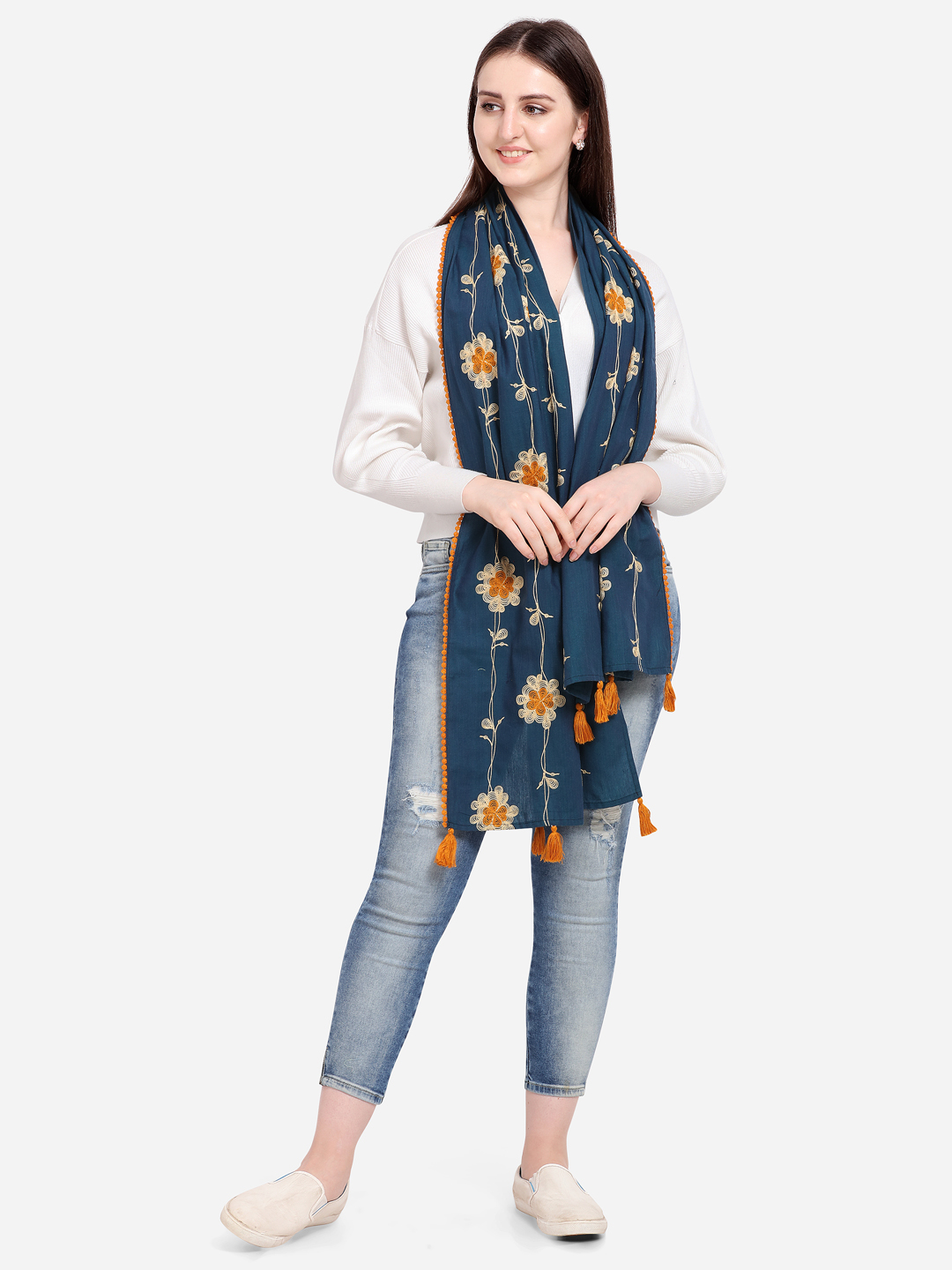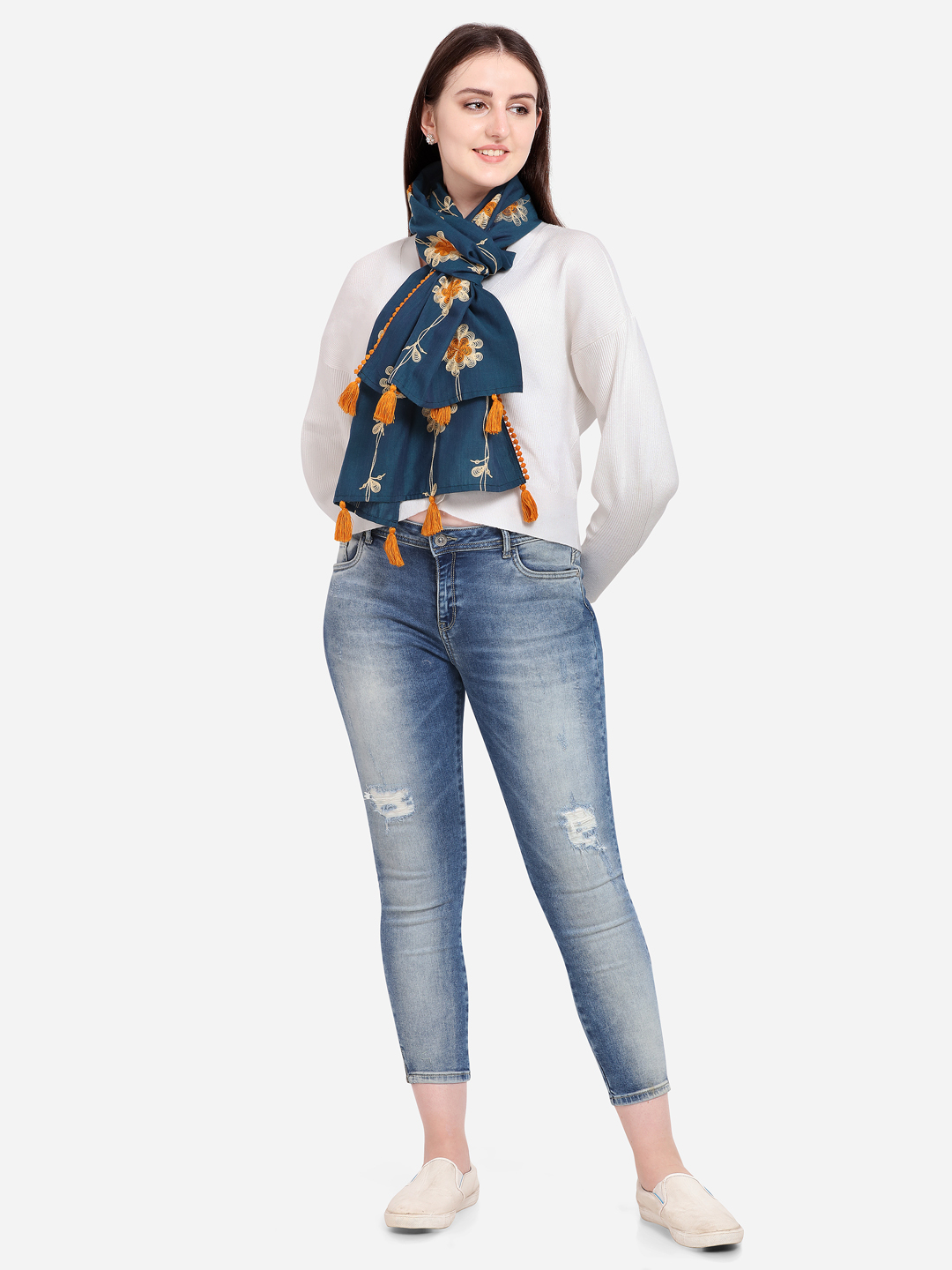 Embelished with hand made tassels tucked on both the ends. The stole is perfect for you casual out fit .it can be wore in any seasons this makes it multi purpose stole for every season.