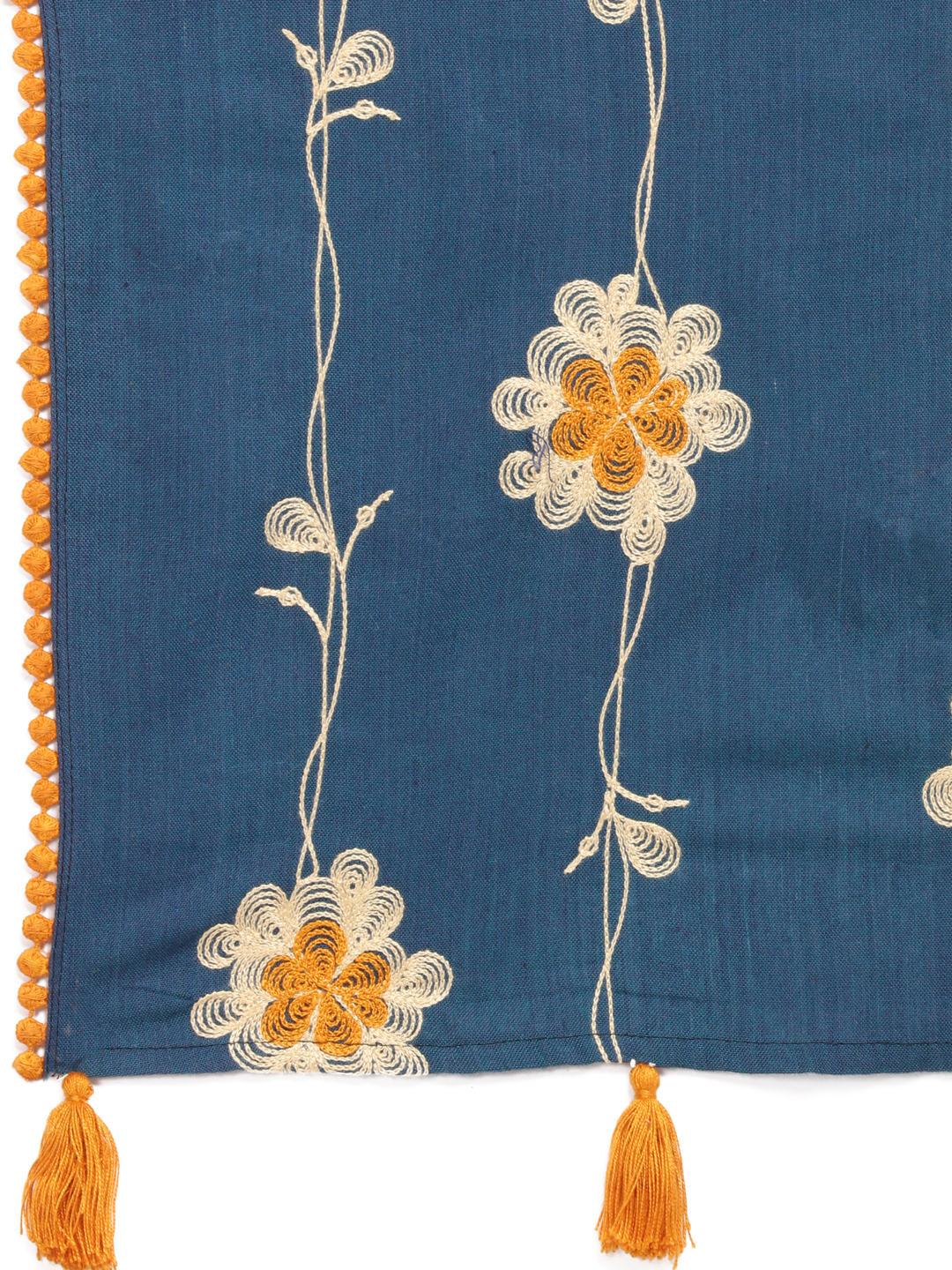 The twotone turquoise khadi cotton stole/scarf is embroidered with big hypnotizing flower motif arranged in a row unevenly all over. It is fenced from one side with cotton dyed bundi lace.