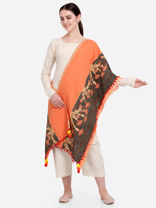 This gray slub dupatta is crafted in organic khadi cotton. It is embroidered with minute aari work in big flower bunch motif. It is embellished with dyed pom pom laces and fring lace. This cute fresh dupatta is perfect for your festive occassion.