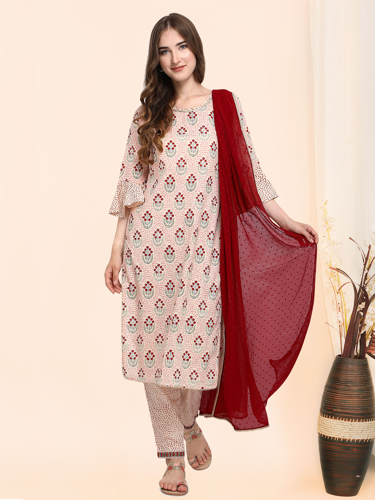 Celebrate your festivals with this beige floral bunch kurta set with a boat neckline and polka printed pants.The bell sleeves are a true attraction with an elbow straight sleeves. This classic dress is clubed with maroon chiffon butti dupatta fenced with gota lace. a perfect festive ocassion wear