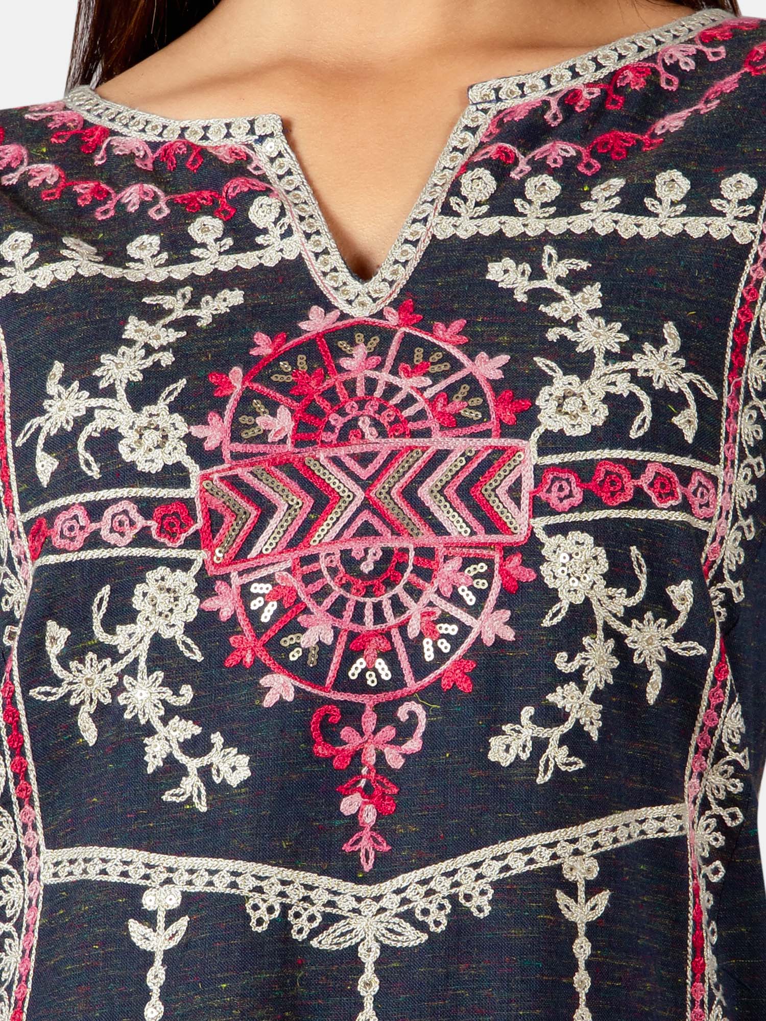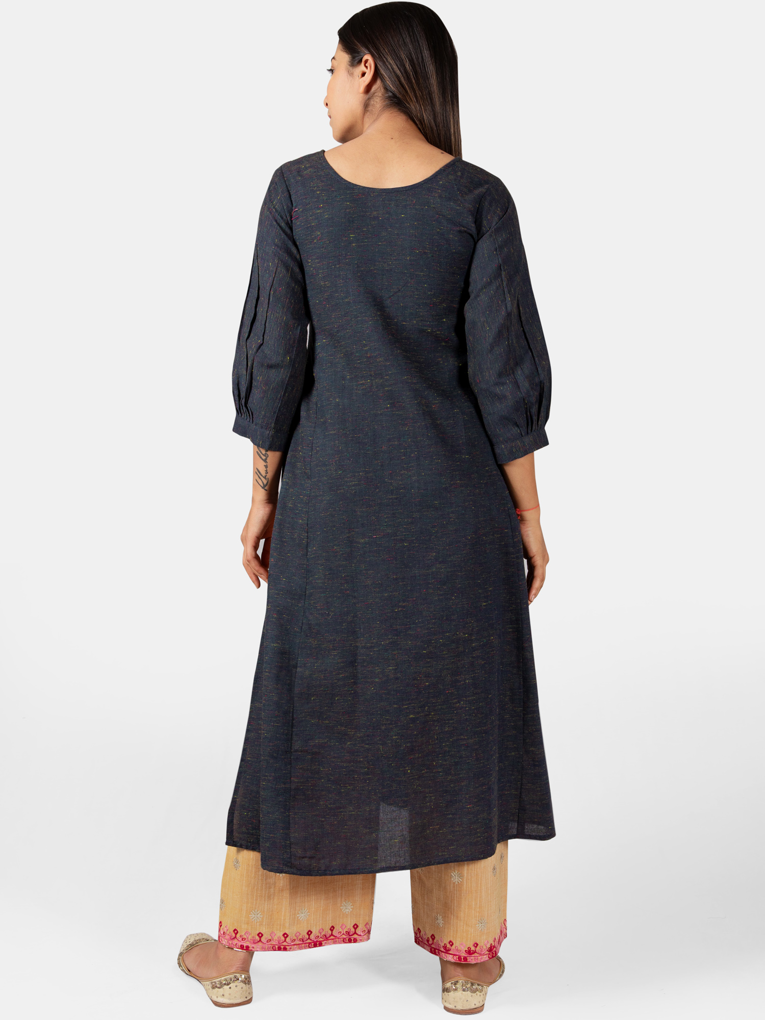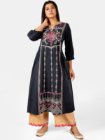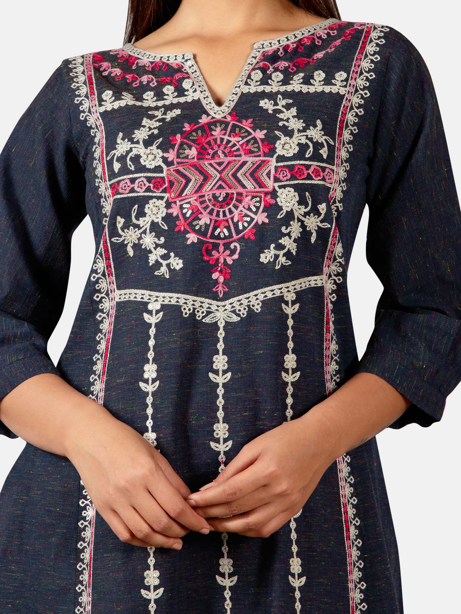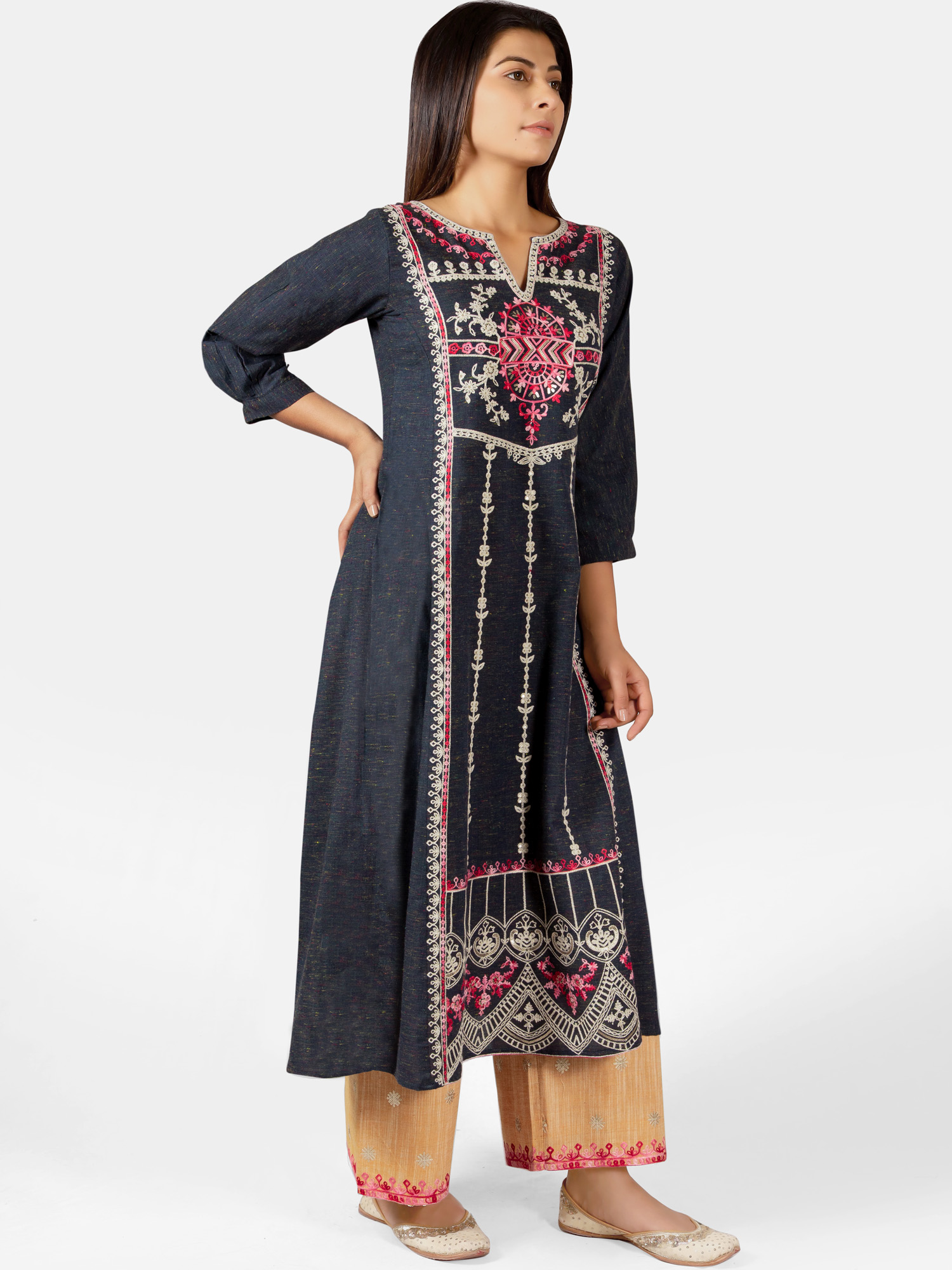 Deep navyblue khadi kurta blended with colorful cotton threads embroidered with cotton zari thread in front panel with aari work. The front rich minute embroidery enhances its beauty . The fabric is very soft, comfortable to wear, organic and skin friendly. It gets softer after every wash. The beautiful long kurta is paired with dusty yellow slub fabric palazzo pant embellished with twinkling squence bitties fenced with two tone thread border. This makes a complete remarkable look for your occassion .All the dresses will have armhole princes and are as per standard shoulder sizes and fit differs as per pattern (order one size bigger recommended)