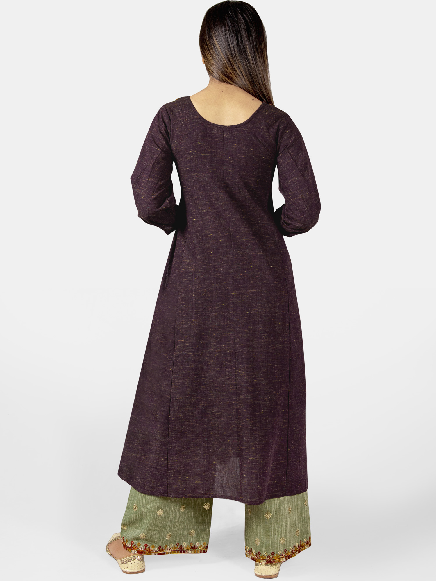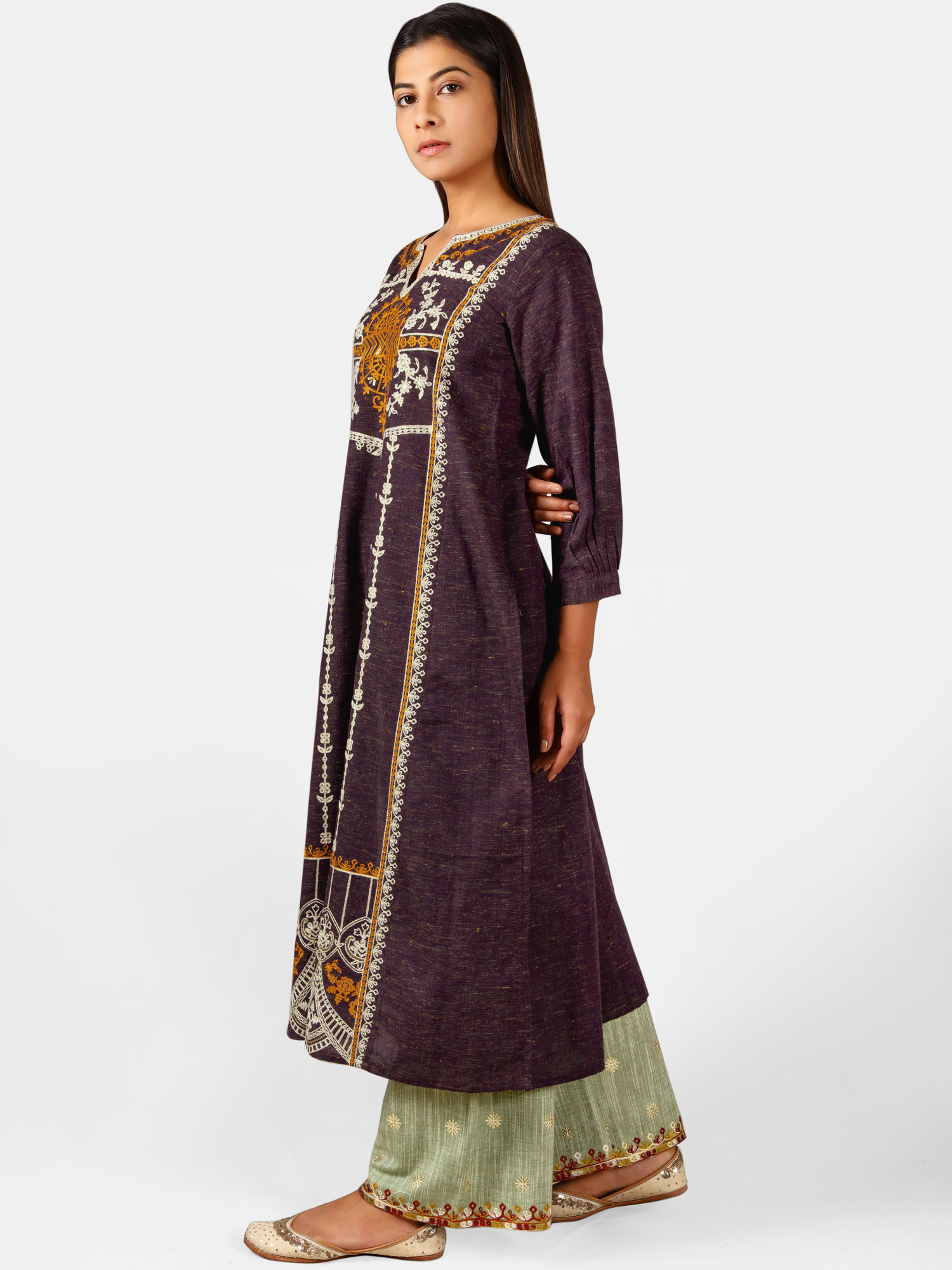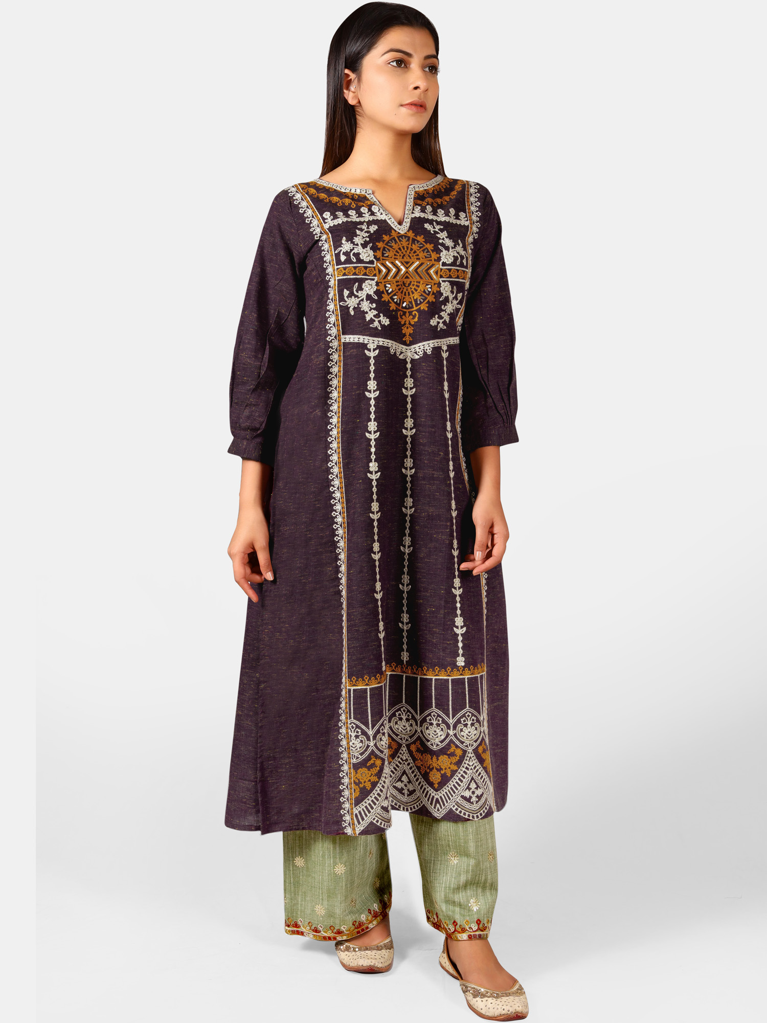 Deep Purple Heavy Panel Embroidered Slub Khadi Kurta set