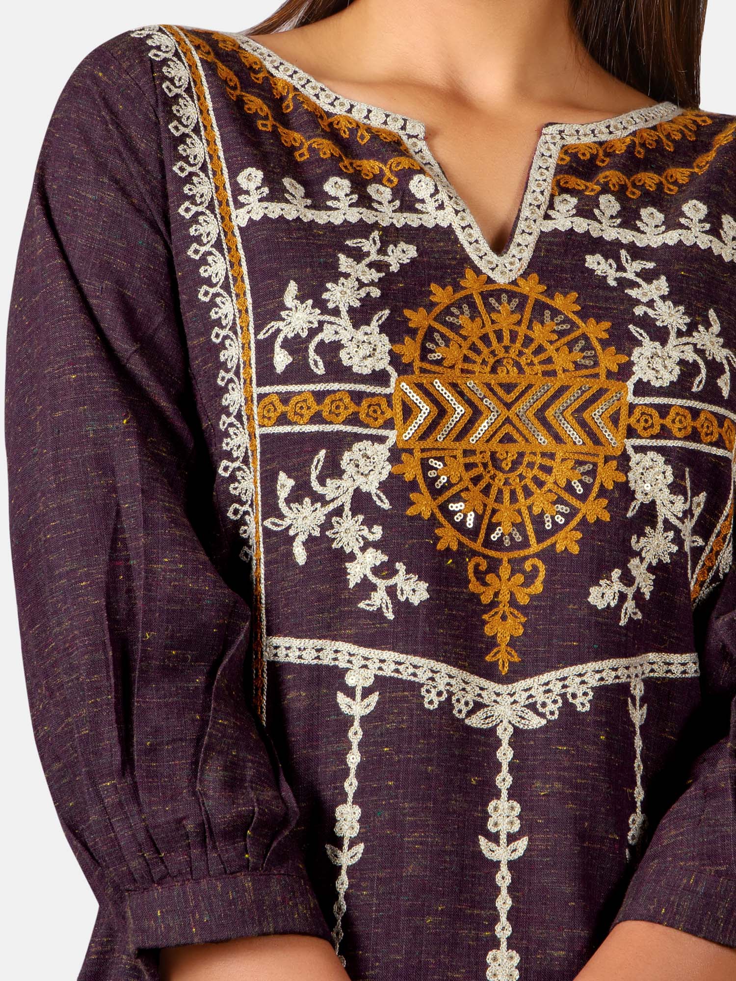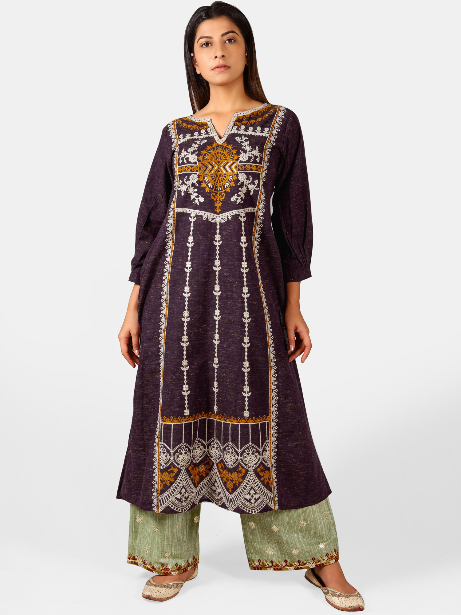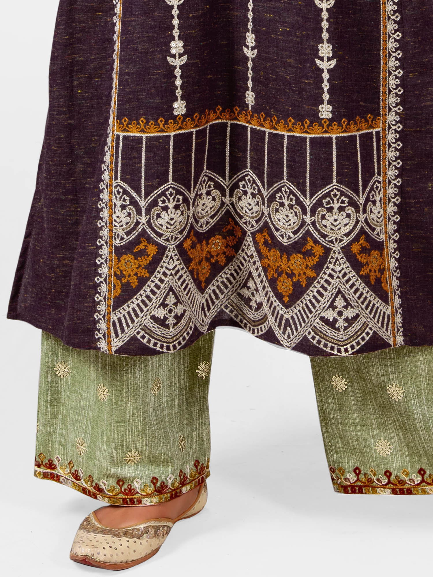 Deep Purple Heavy Panel Embroidered Slub Khadi Kurta set