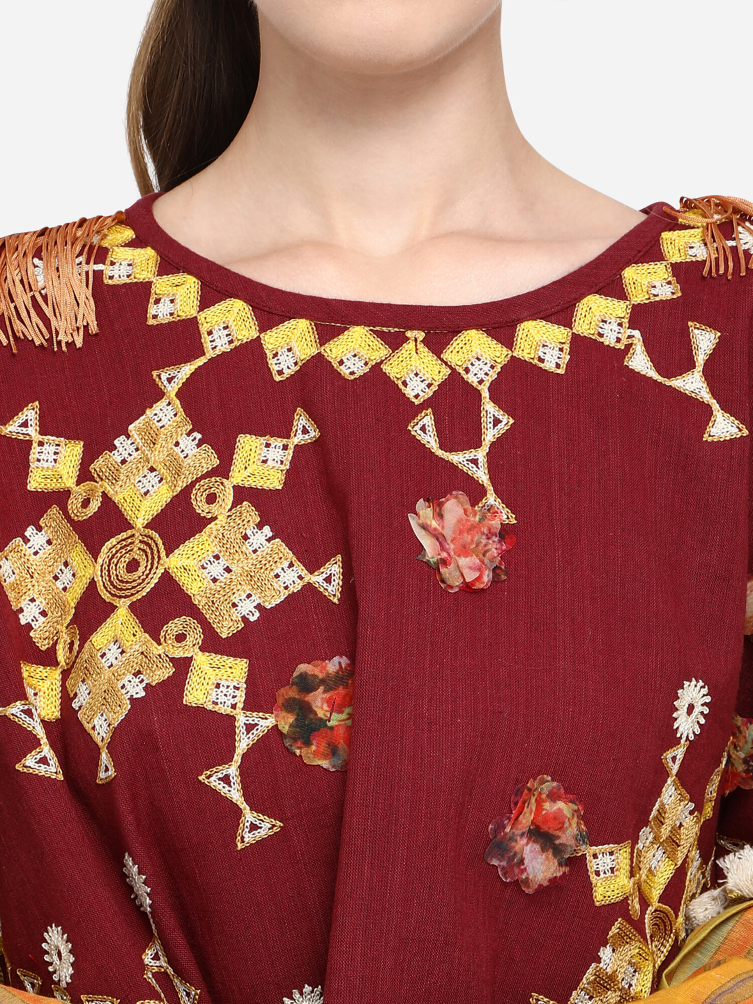 Now Forget your regular Tops and try MESMORA’S unique RANGEELA RE colourful embroidered ponchos? Minute woollen and jute embroidery, both front and back decorated by Dazzling laces and *3D flowers. 100% khadi that keeps you warm in winters and cool in summers.?Wear it on your regular top as winter poncho, on a gown as a style element, and on beaches and holidays . 28″ long? circular ponchos with front and back embroidery? and fits up to 46″ chest size.