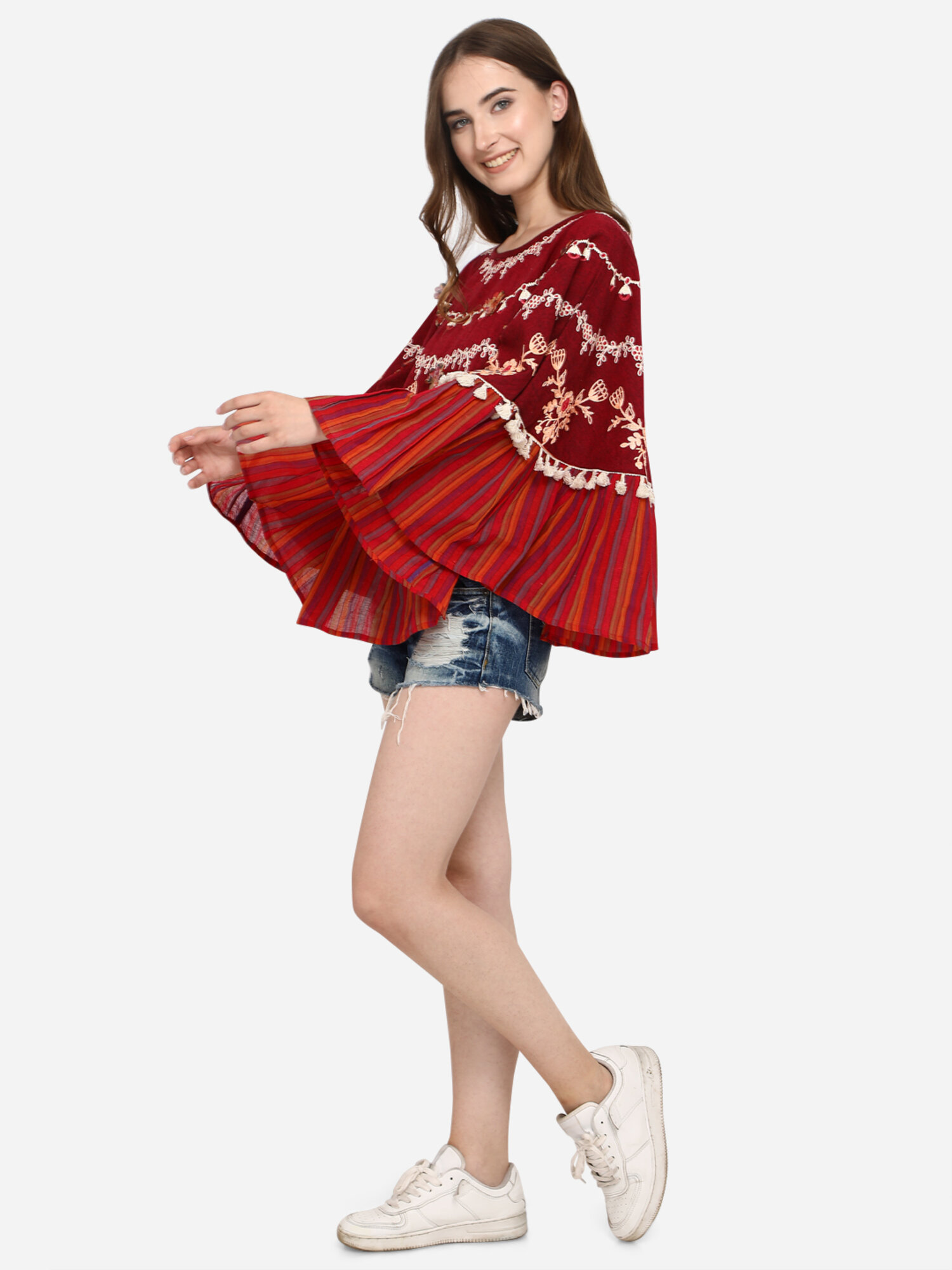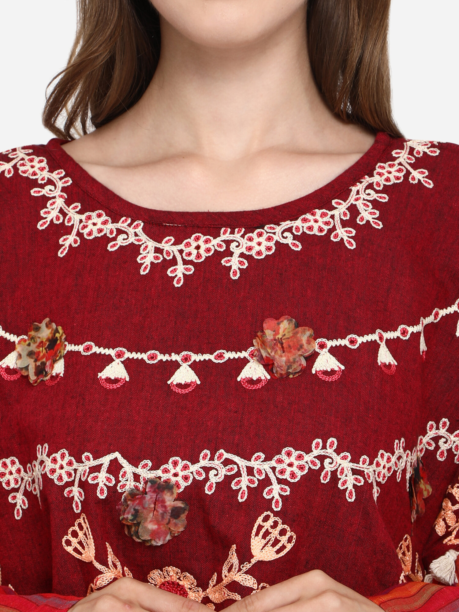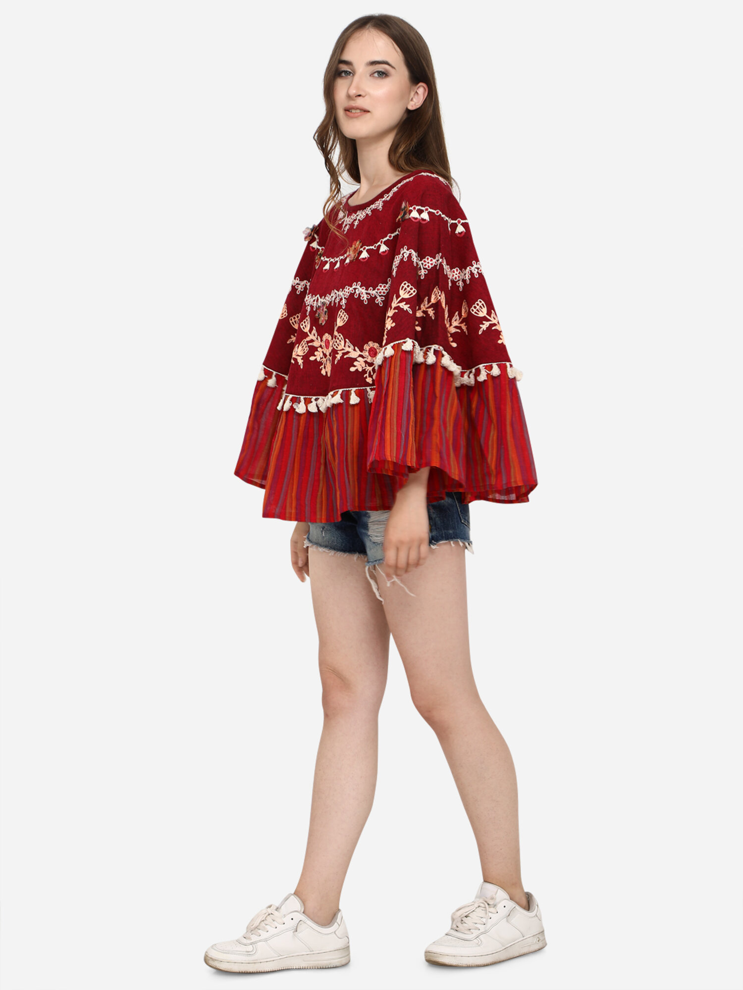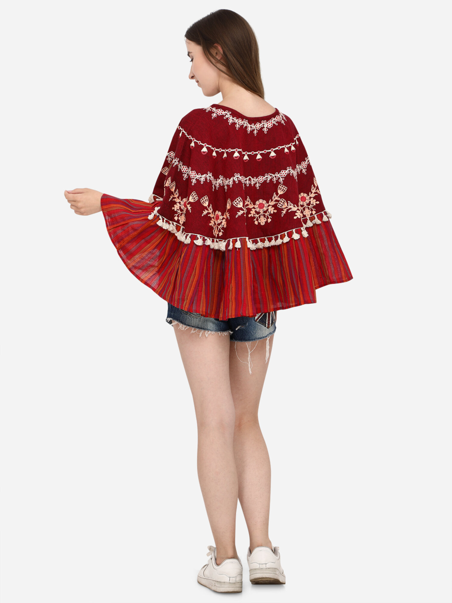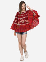 Now Forget your regular Tops and try MESMORA’S unique RANGEELA RE colourful embroidered ponchos? Minute woollen and jute embroidery, both front and back decorated by Dazzling laces and *3D flowers. 100% khadi that keeps you warm in winters and cool in summers.?Wear it on your regular top as winter poncho, on a gown as a style element, and on beaches and holidays . 28″ long? circular ponchos with front and back embroidery? and fits up to 46″ chest size.