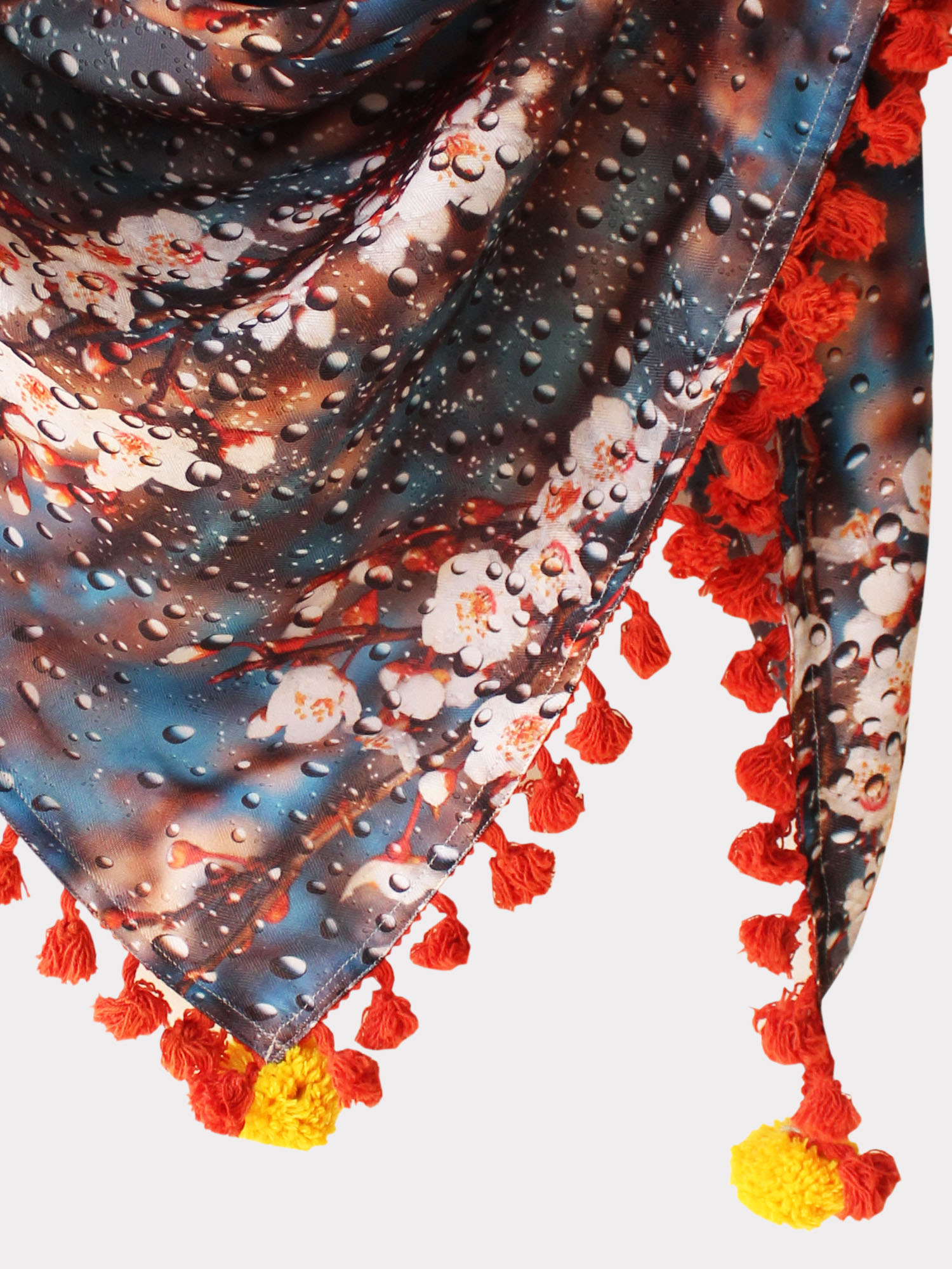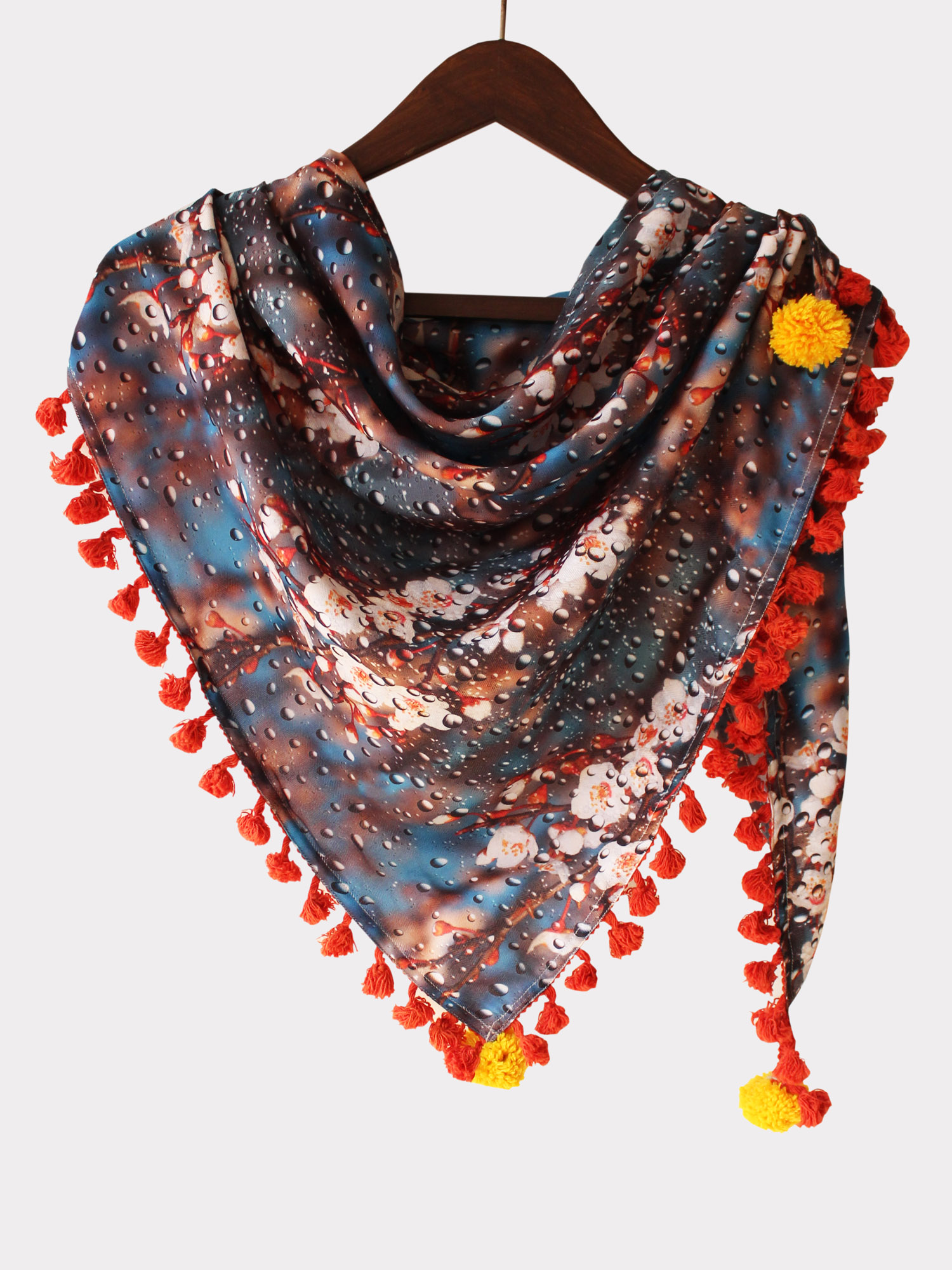 Due Drop on floral bunch Digital Printed traingular stole/scarf crafted on warm pashmina fabric for winters. It is embellished With dyed Cotton Tassel Lace. Added with handmade pom poms on all three corners. It is a flowy triangular stole. This stole can be draped on your casual outfit a perfect element for your daily use.
