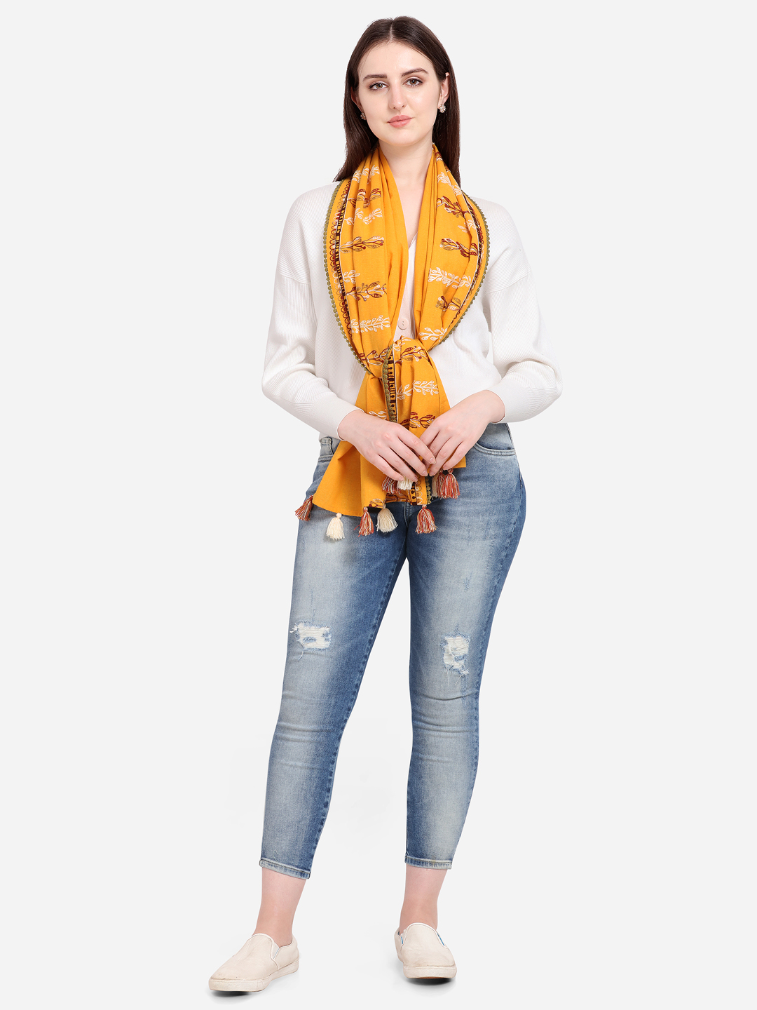 embelished with hand made tassels tucked on both the sides. The stole is perfect for your casual outfit. it can be wore in any seasons this makes it multi purpose stole for every season.
