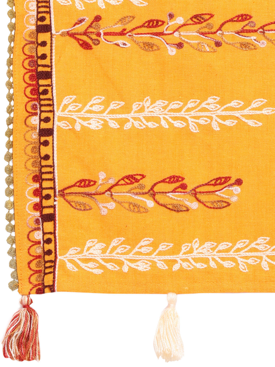 Mustured yellow khadi cotton scarf/stole embroidered with two tone thread in earthy grassroot motif on one side . It is fenced from one side with cotton dyed bundi lace.