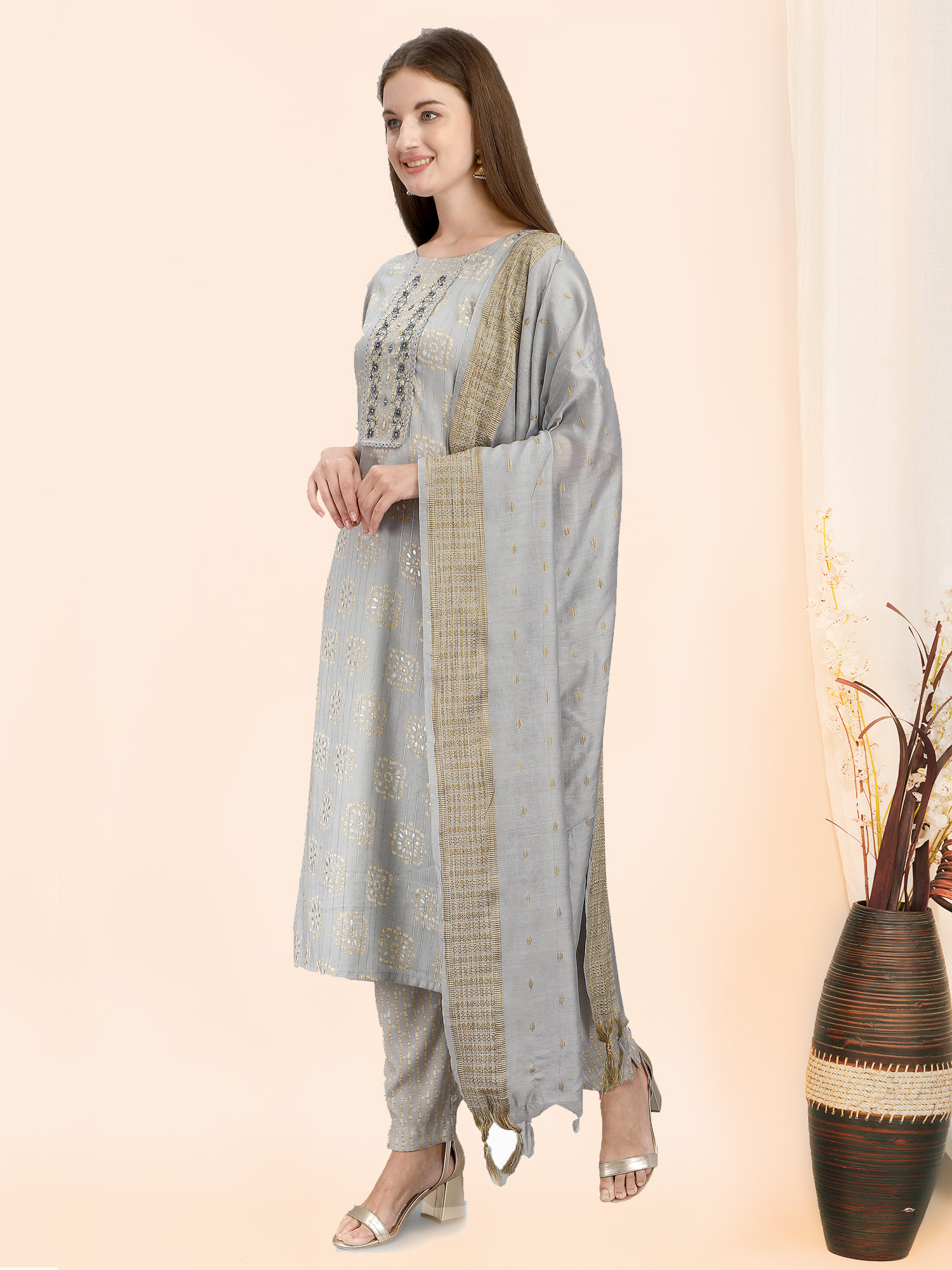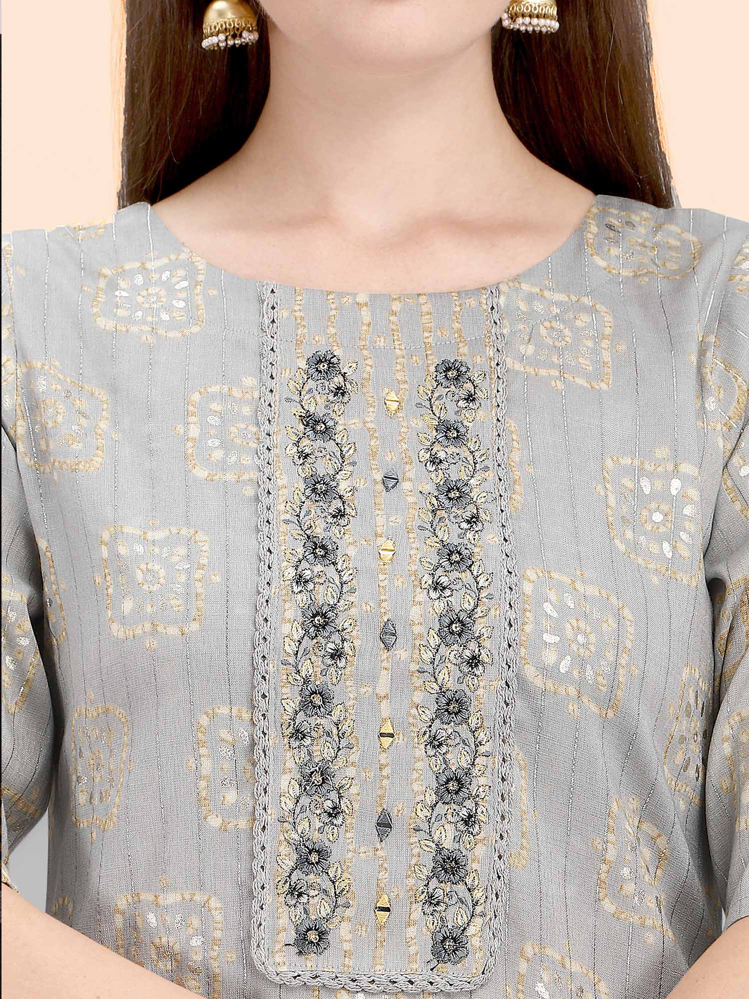 Grey kurti with embroidered neck and capsule print narrow pant . It has 3/4 sleeves and paired with silk dupatta . The pant has all over elastic at the waist .