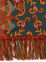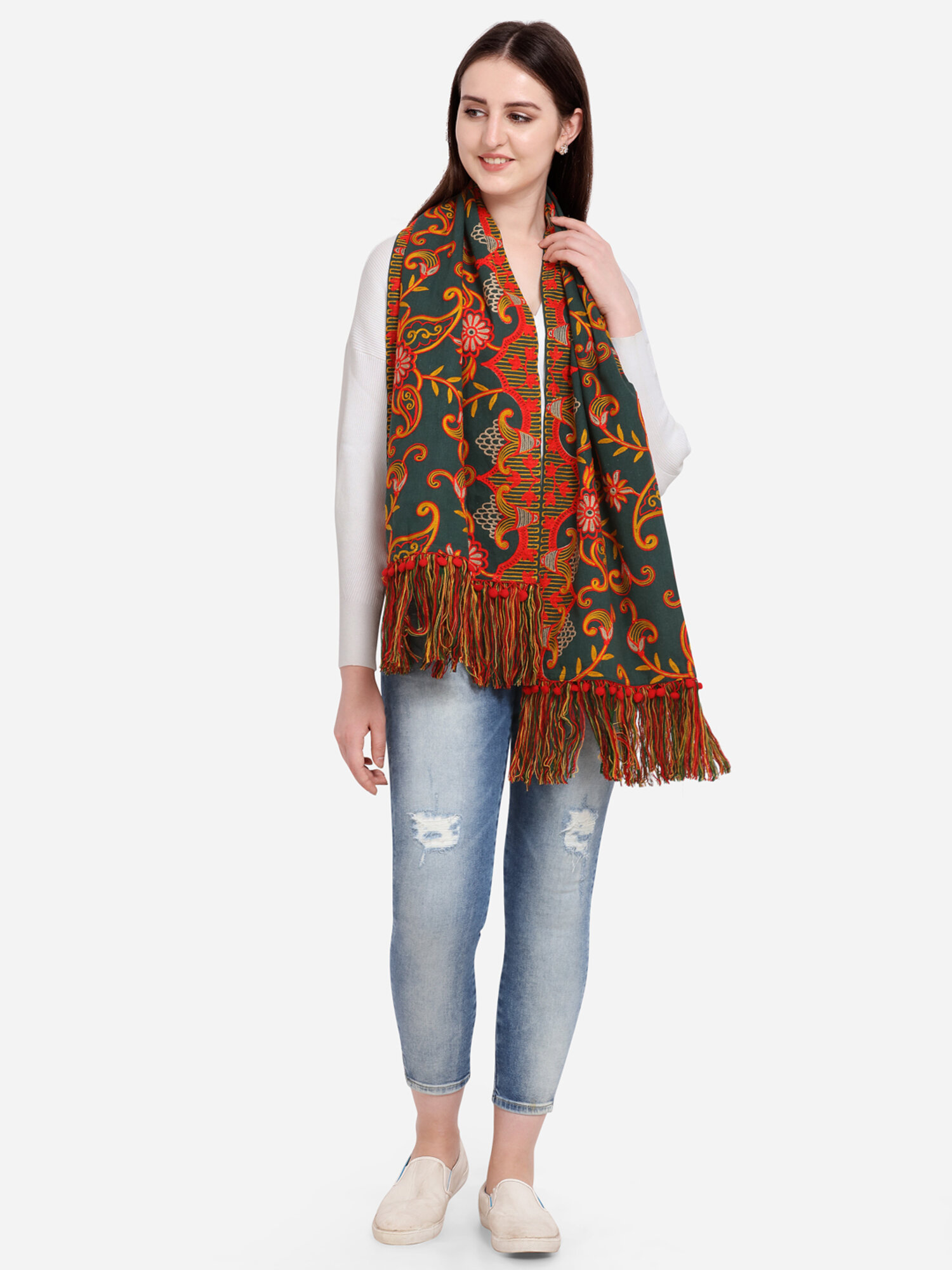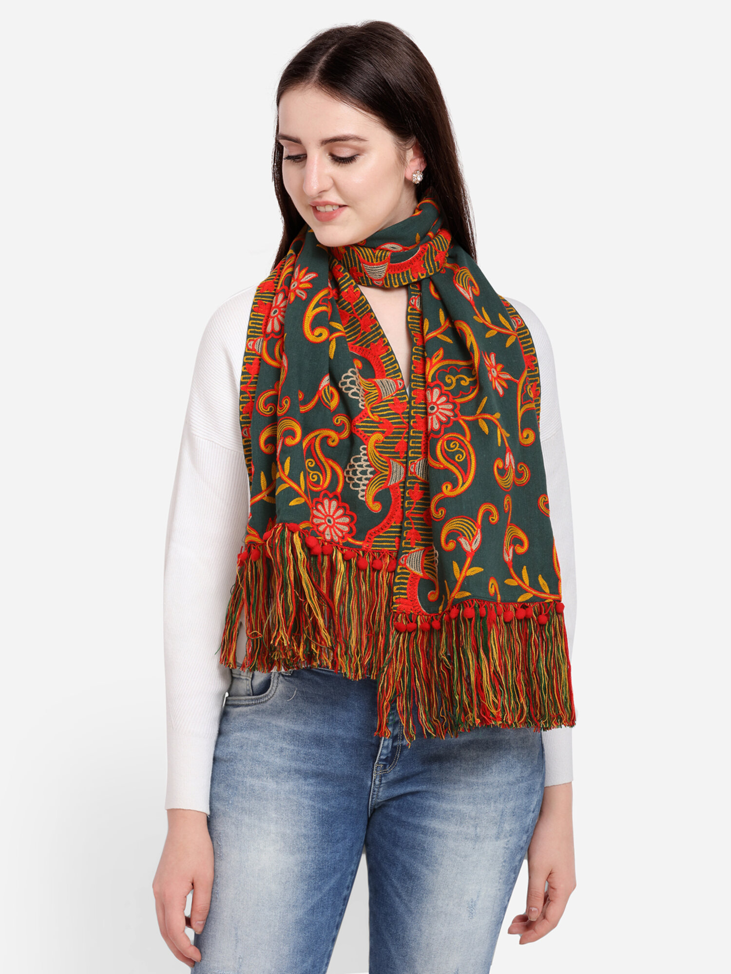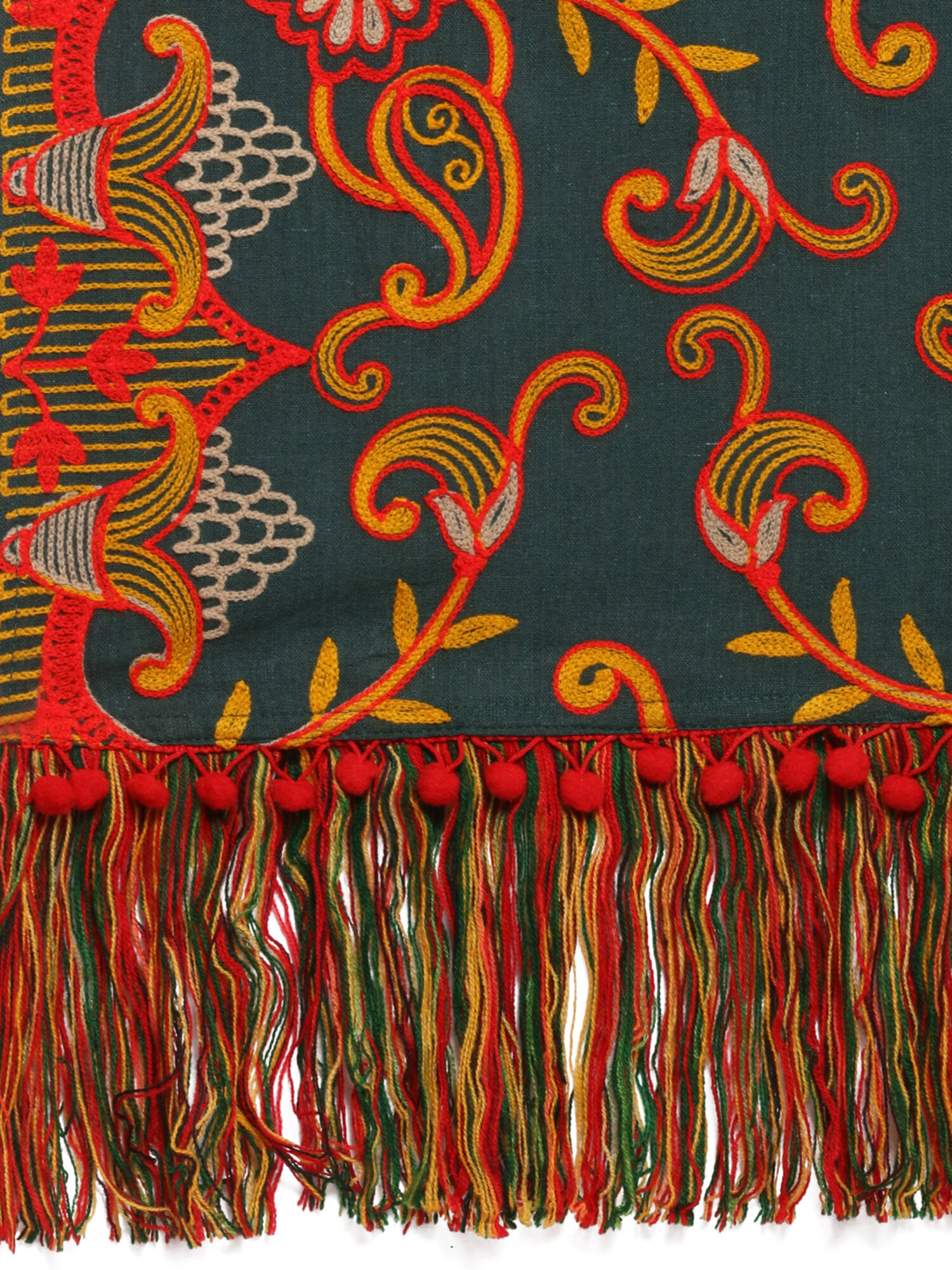 This Deep green muffler is crafted in 100% khadi cotton fabric. It is fully embroidred with minute aari work in different fancy motifs with two tone woollen thread. It is embellished with fancy wollen long tassel lace and pom pom lace. The muffler is Perfect for your casual outfit. its a multi seasonal stole can be wore in any season on any outfit. The khadi fabric gets softer after every wash this makes it special.