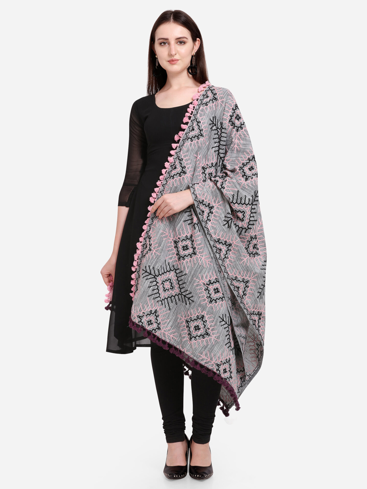 This geay shawl/dupatta is crafted in organic khadi cotton fabric. It is Heavily aari Embroidered with different tribal motif. It is fenced with dyed baby pink cotton tassel lace. For winters it is perfect as a fancy shawl to feel warmand for festive it is perfect to carry on your fancy outifit.
