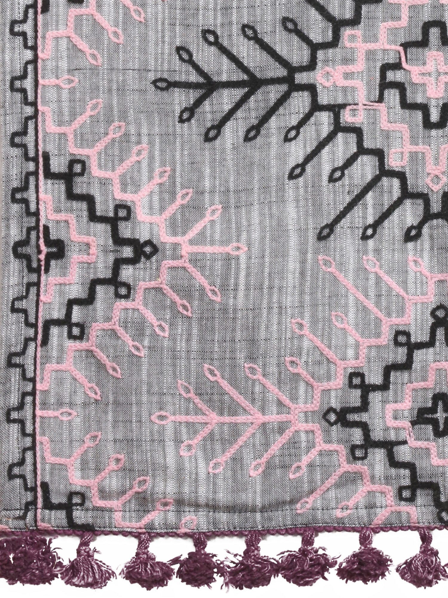 Grey Tribal Aari Embrodiered Slub Khadi Shawl/Dupatta With Baby Pink Cotton Lace