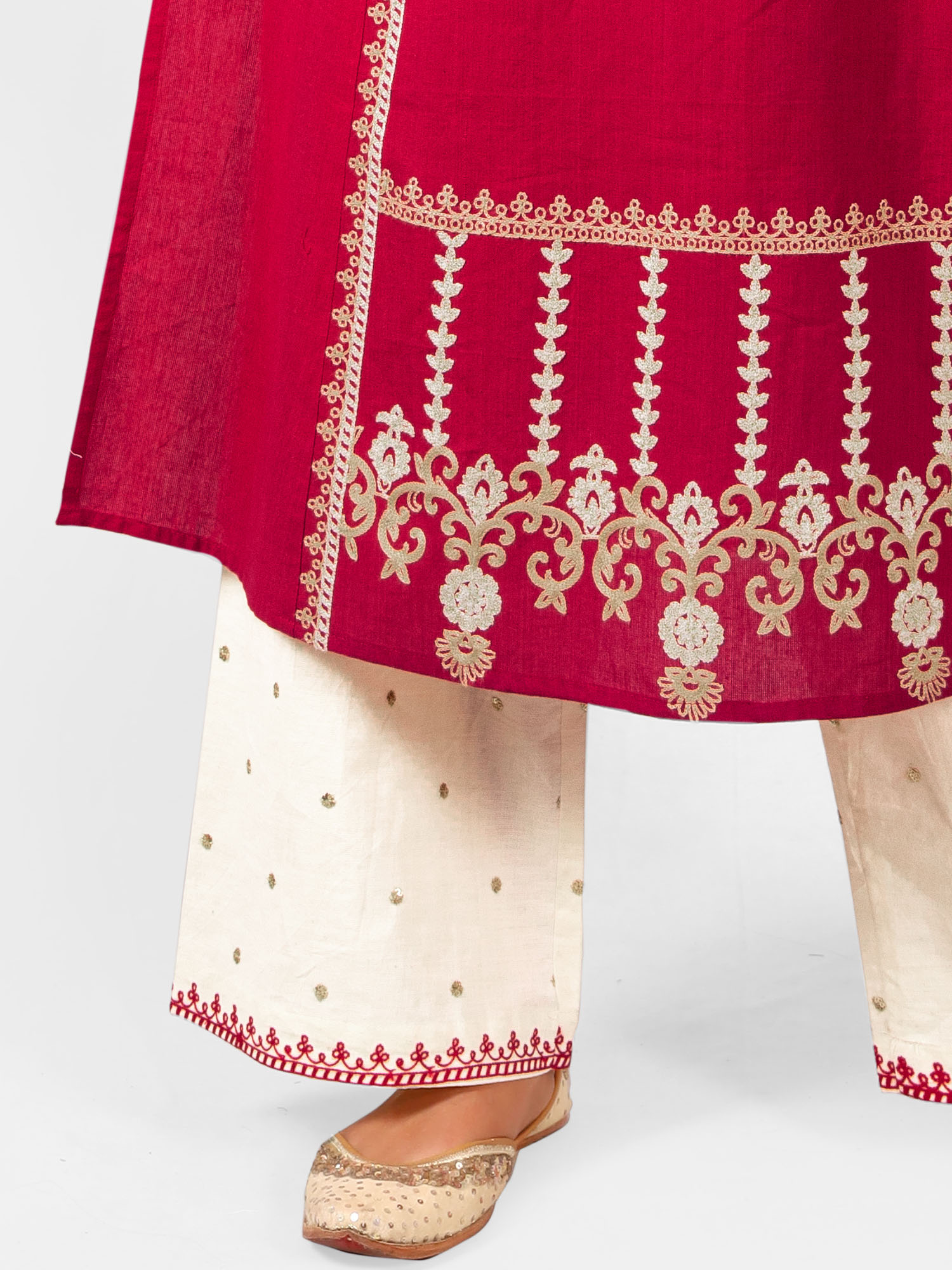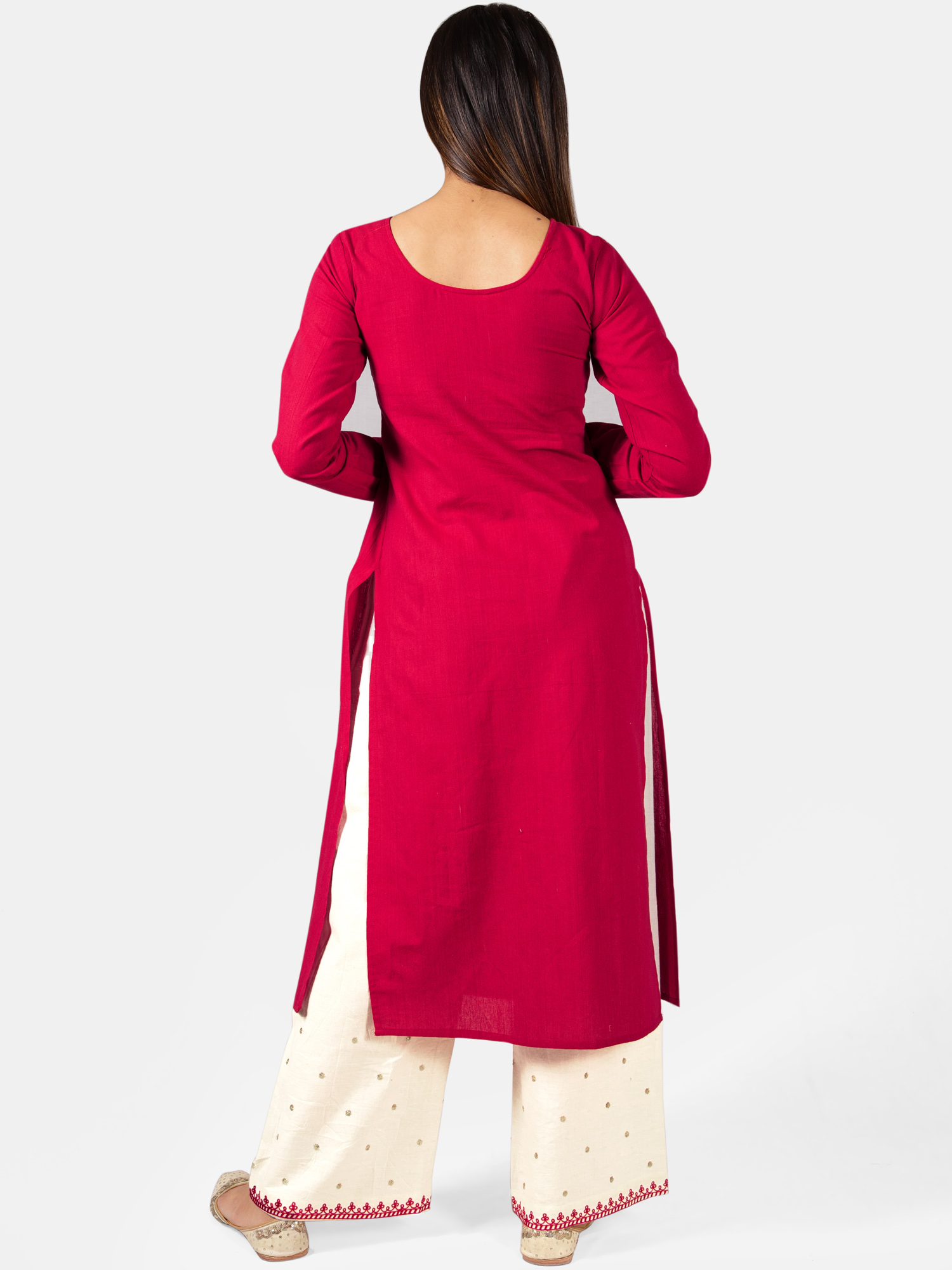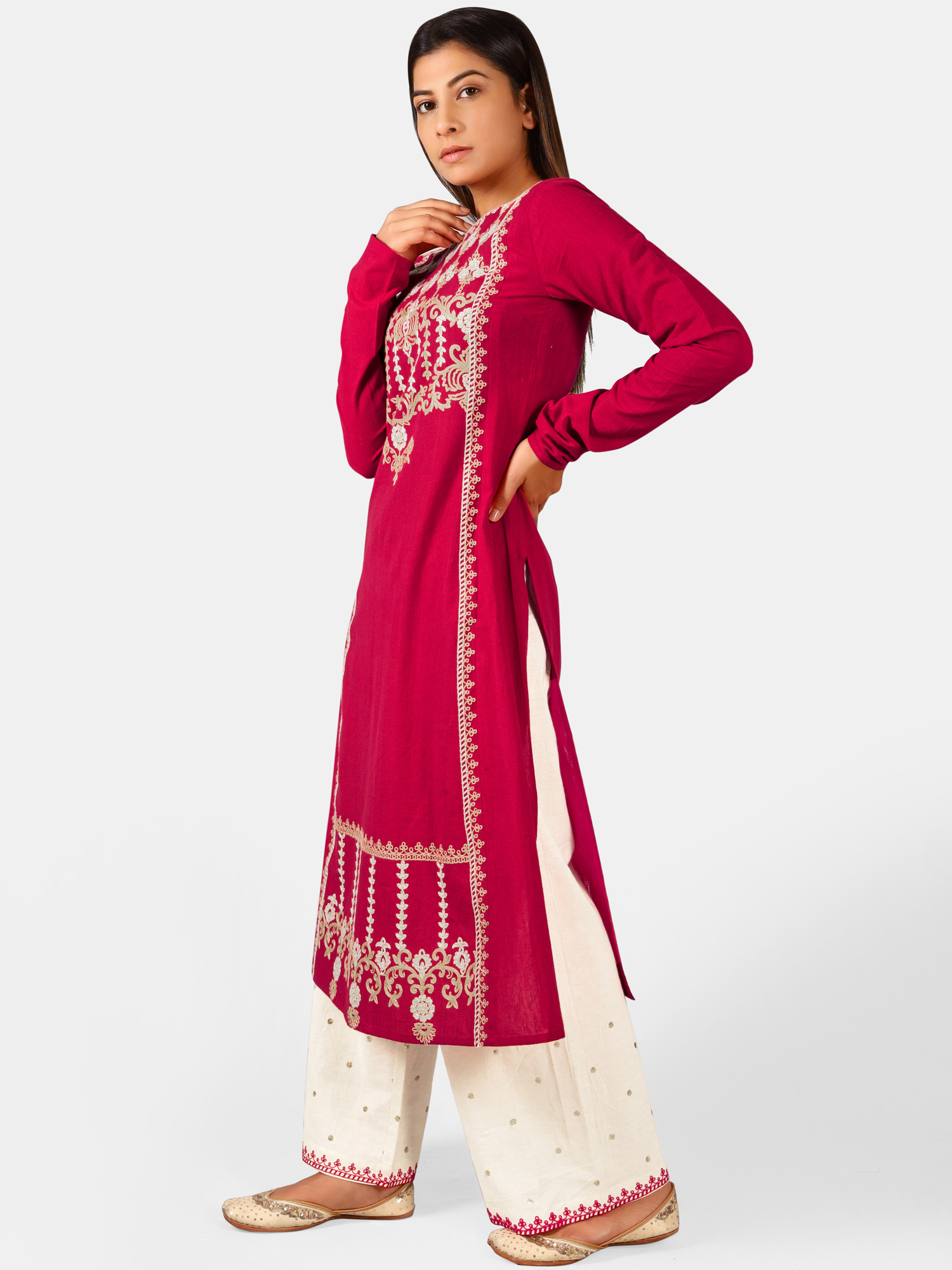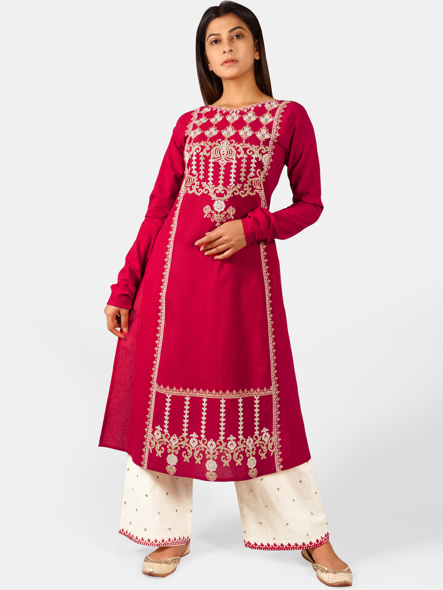 Crimson red khadi cotton kurta is heavily embroidered with cotton zari thread in front panel with aari work . Its is Featured with round neckline and long full gathered sleeves. The front rich minute embroidery enhances its beauty . The fabric is very soft, comfortable to wear, organic and skin friendly. It gets softer after every wash. The beautiful long kurta is paired with off white palazzo pant embroidered with sequence butti fenced with fancy border. This makes a complete remarkable look for your Occassion.All the dresses will have armhole princes and are as per standard shoulder sizes and fit differs as per pattern (order one size bigger recommended)