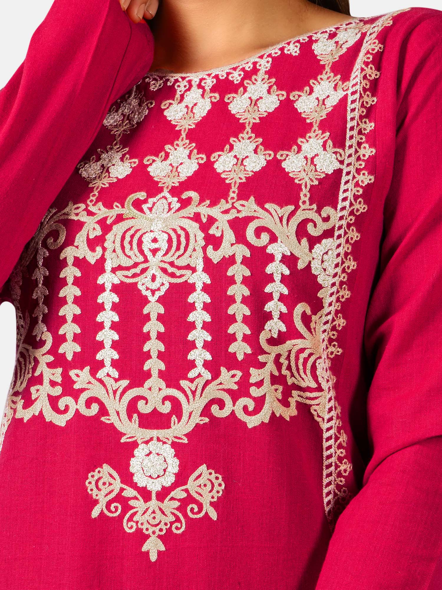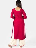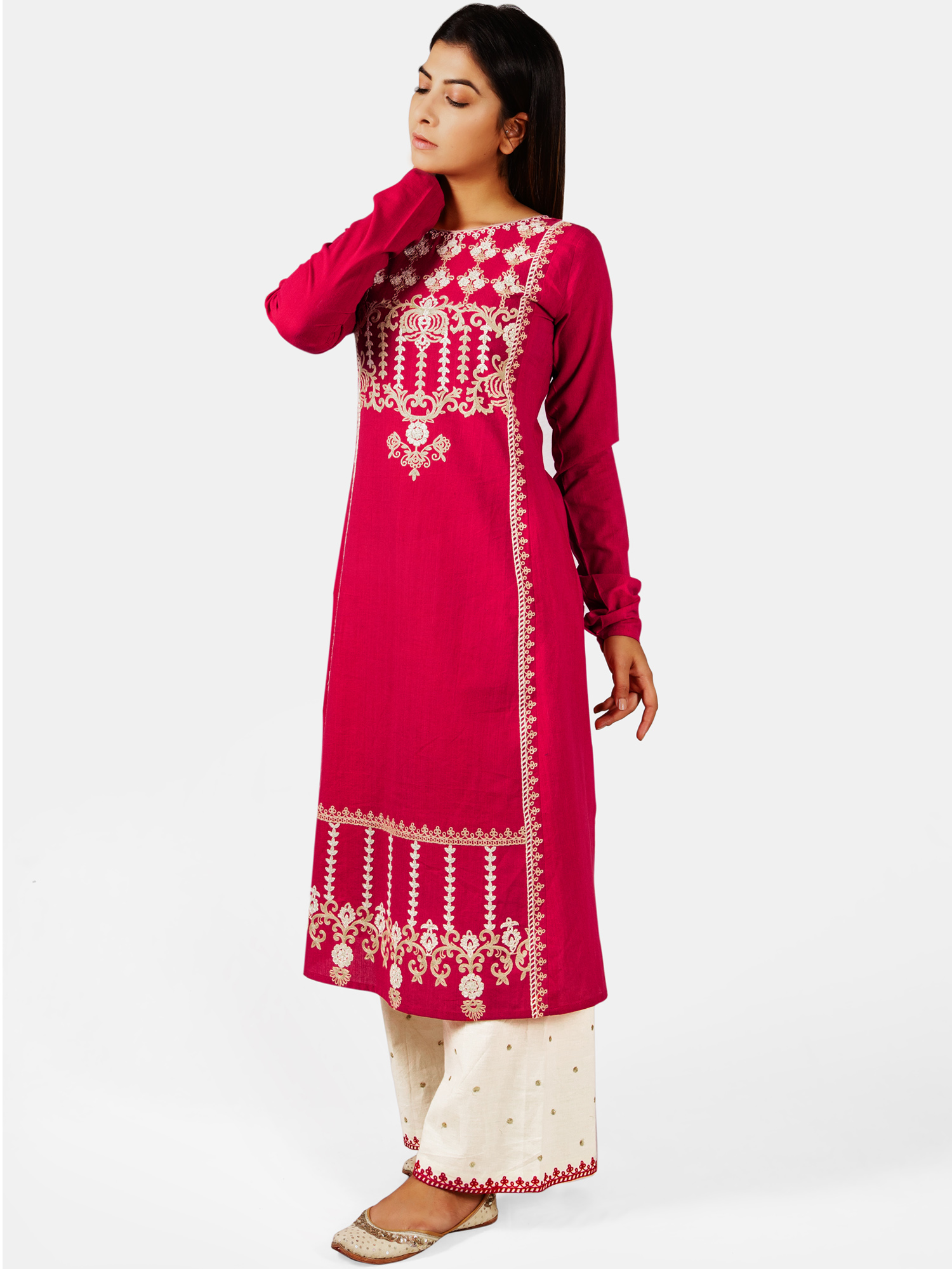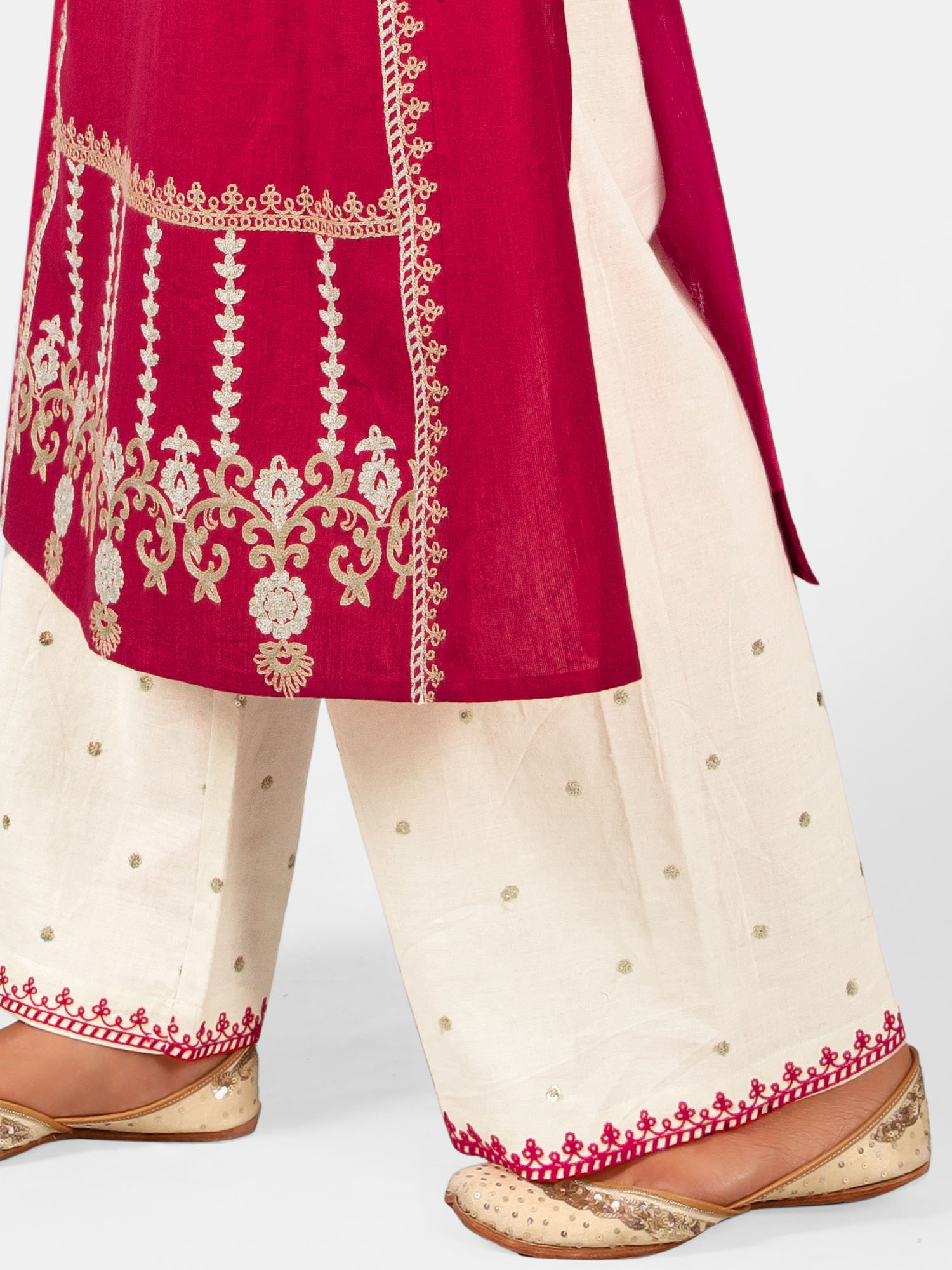 Crimson red khadi cotton kurta is heavily embroidered with cotton zari thread in front panel with aari work . Its is Featured with round neckline and long full gathered sleeves. The front rich minute embroidery enhances its beauty . The fabric is very soft, comfortable to wear, organic and skin friendly. It gets softer after every wash. The beautiful long kurta is paired with off white palazzo pant embroidered with sequence butti fenced with fancy border. This makes a complete remarkable look for your Occassion.All the dresses will have armhole princes and are as per standard shoulder sizes and fit differs as per pattern (order one size bigger recommended)