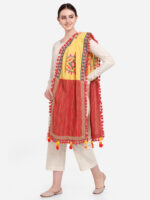 This yellow and red lining dupatta is crafted in organic khadi cotton. It is embroidered with circular motif. This dupatta is attached with panels on both the sides. It is embellished with fancy laces and dyed cotton tassel laces.This pretty dupatta is perfect for your festive occassion.