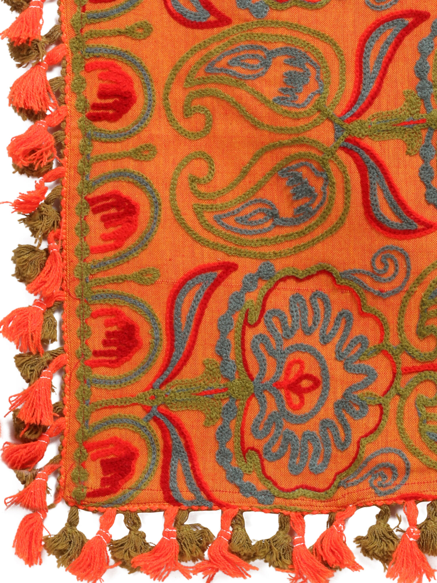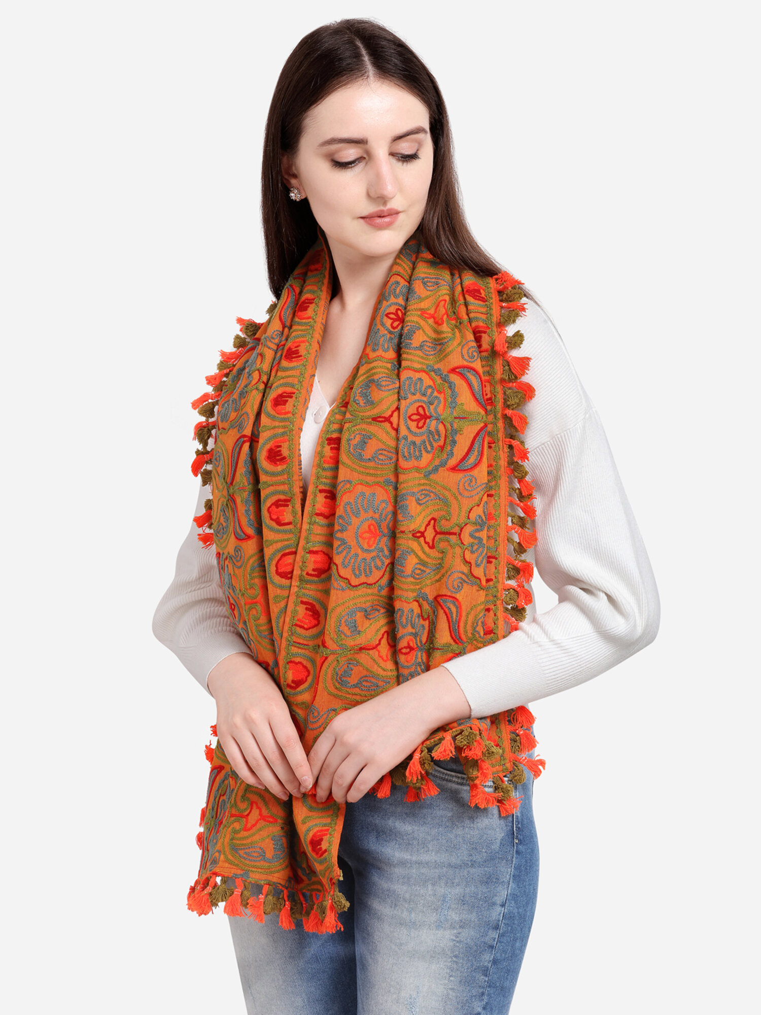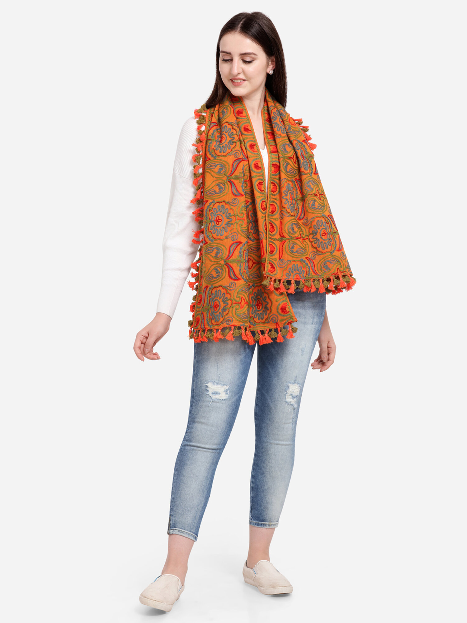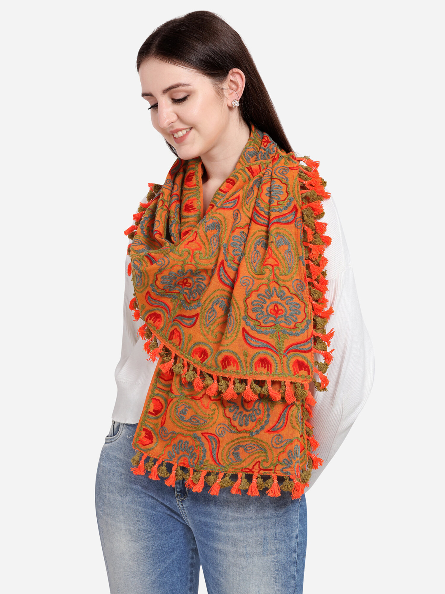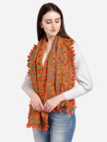 This two tone orange muffler is crafted in 100% khadi cotton fabric. It is fully embroidred with minute aari work in different floral motifs formed with two tone woollen threads. It is embellished with fancy tassel lace and dyed cotton tassel lace. The muffler is Perfect for your casual outfit. its a multi seasonal stole can be wore in any season on any outfit. The khadi fabric gets softer after every wash this makes it special.
