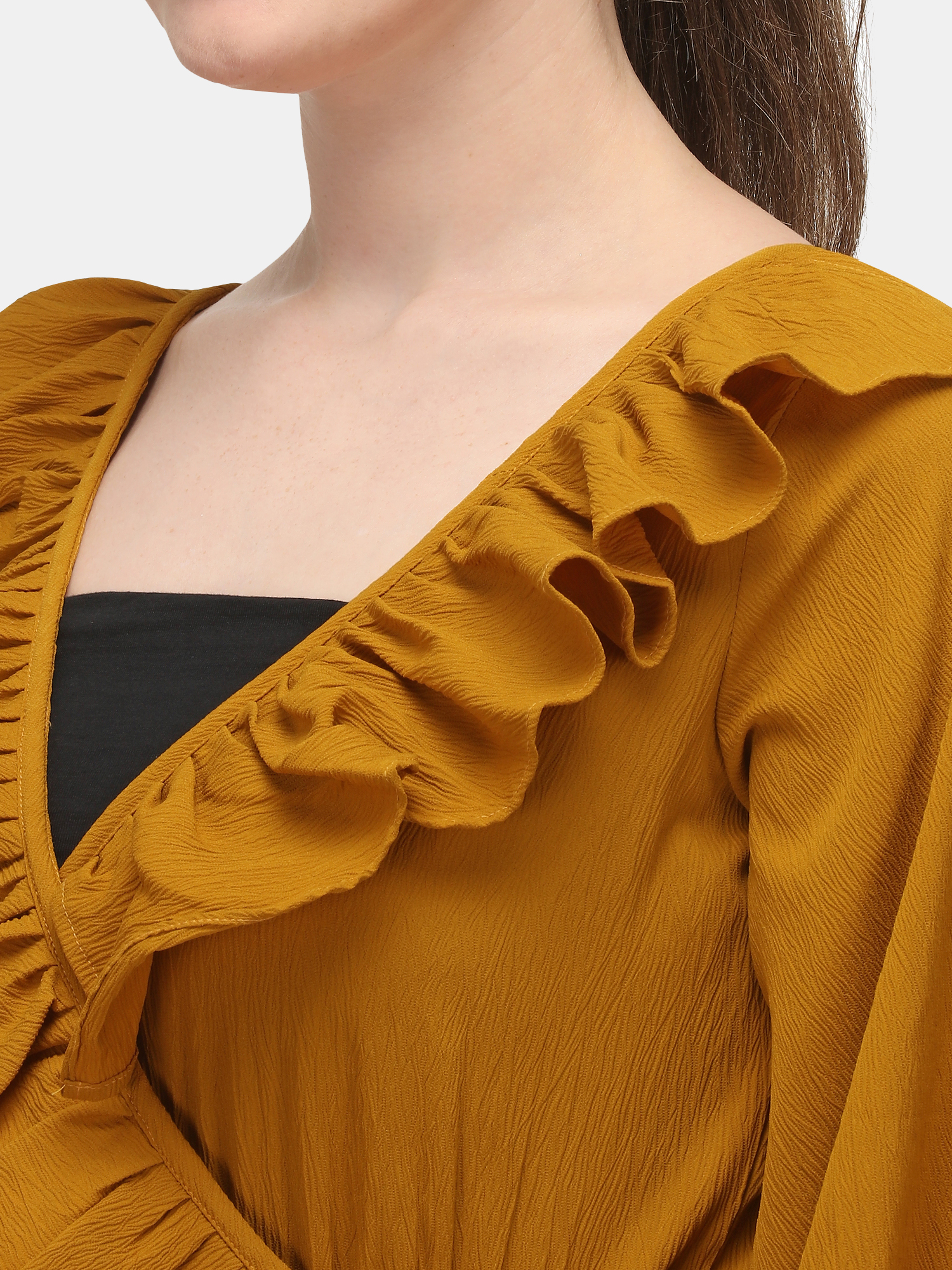 SHORT MUSTURD TUNIC DRESS IS MADE WITH HEAVILY WEAVED CRINKLED FABRIC. IT HAS A WRAP UP PATTERN WITH RUFFLE AT THE NECK LINE, AND PUFFY SLEEVES.