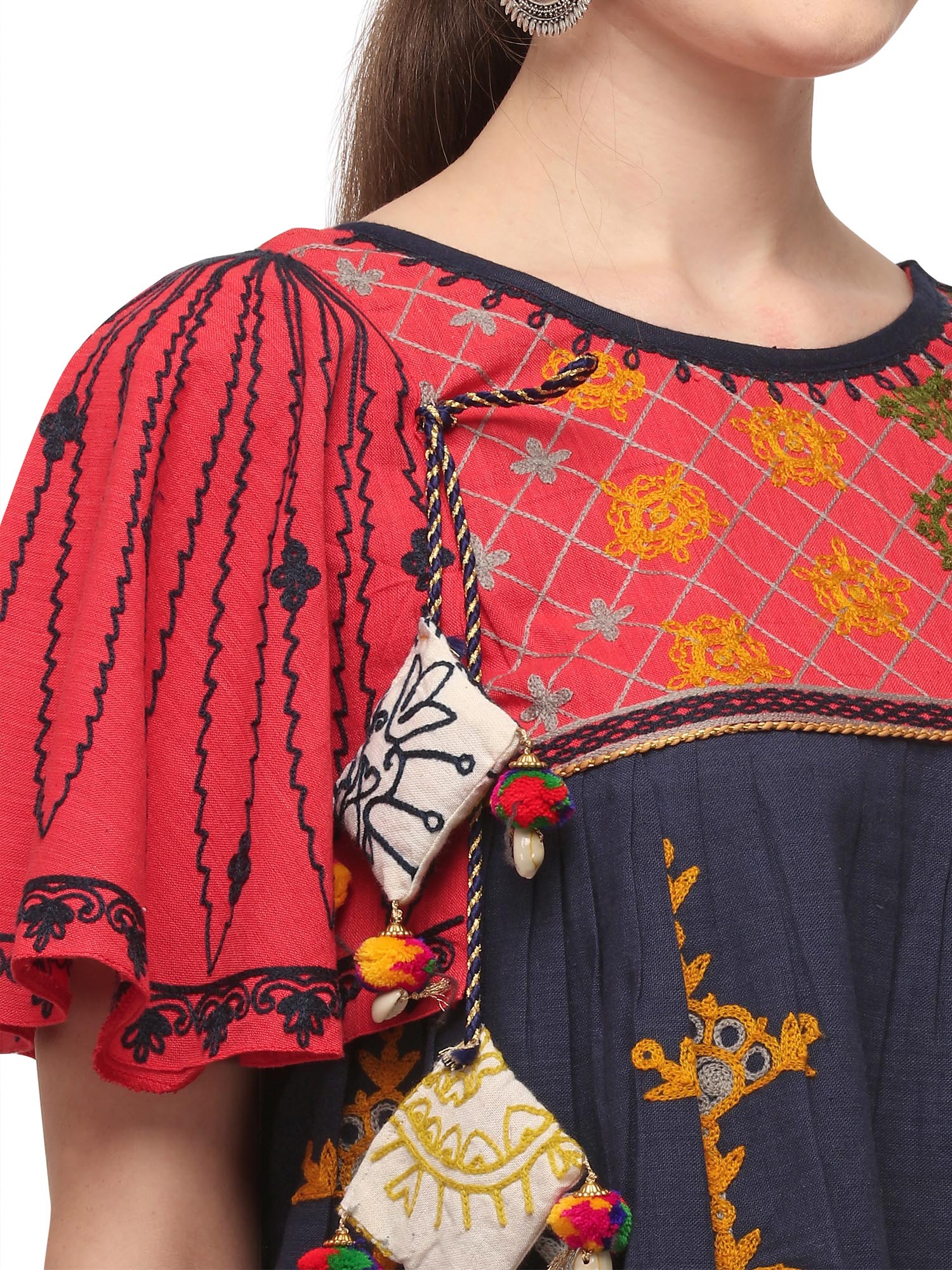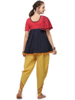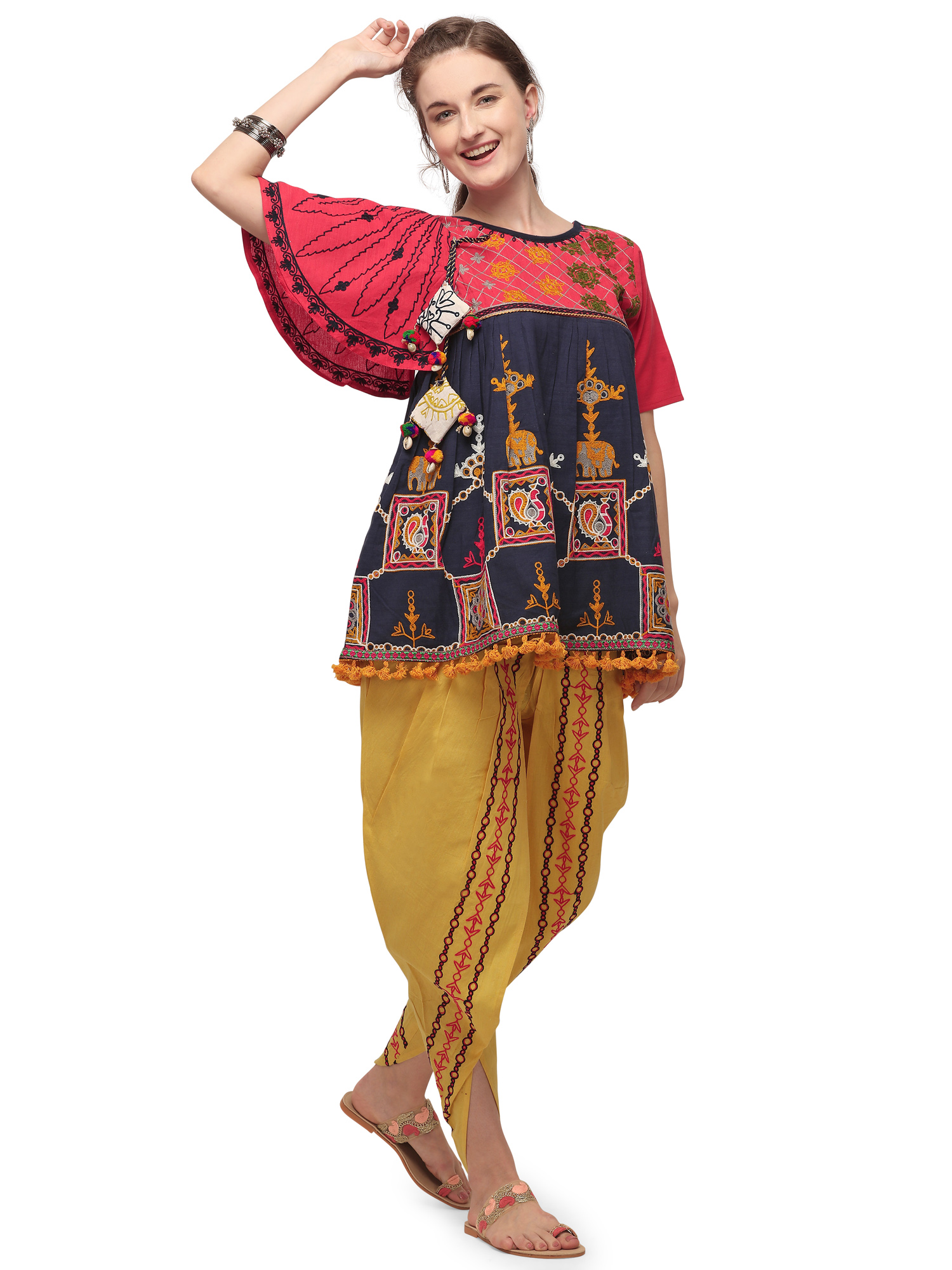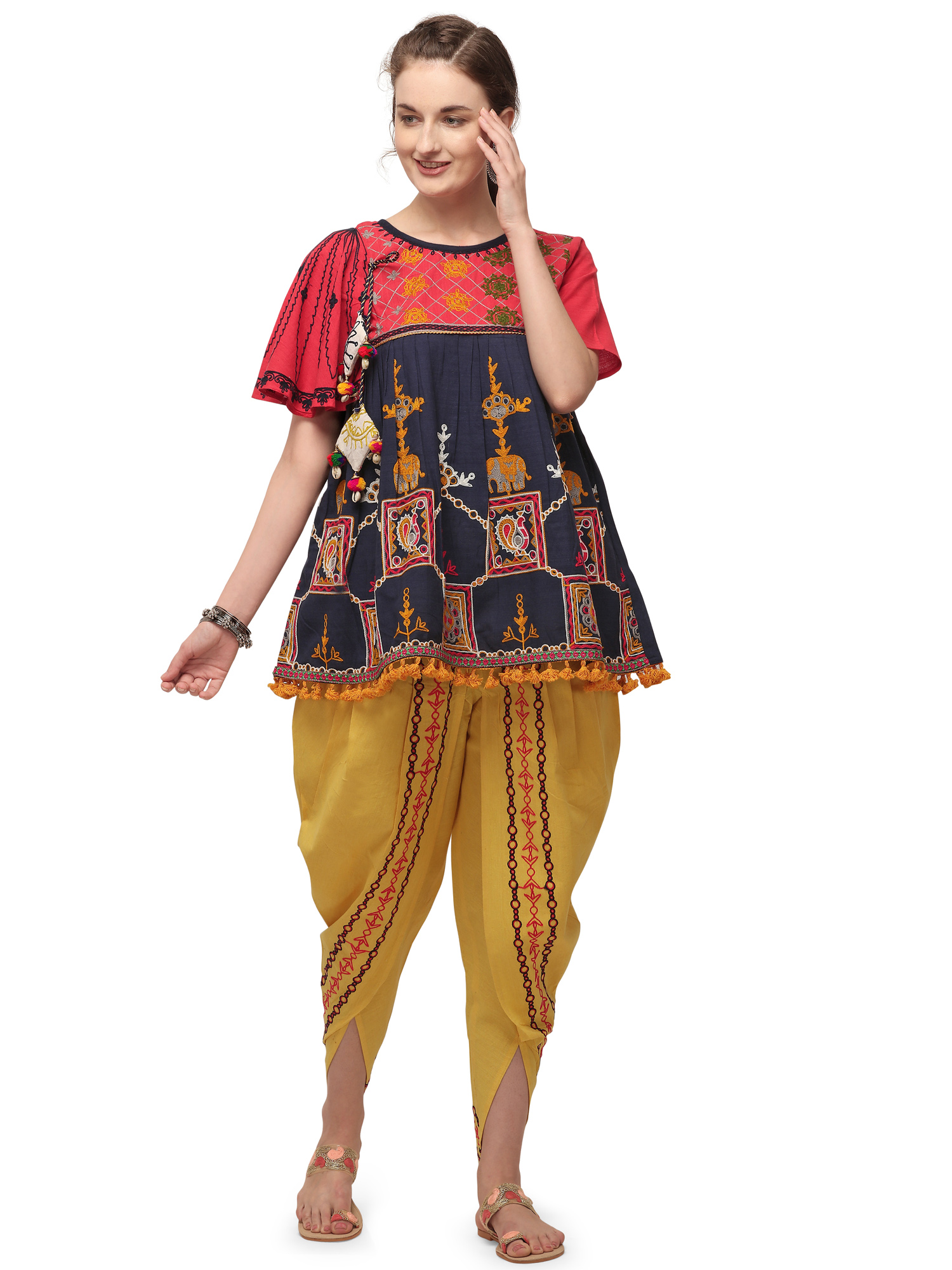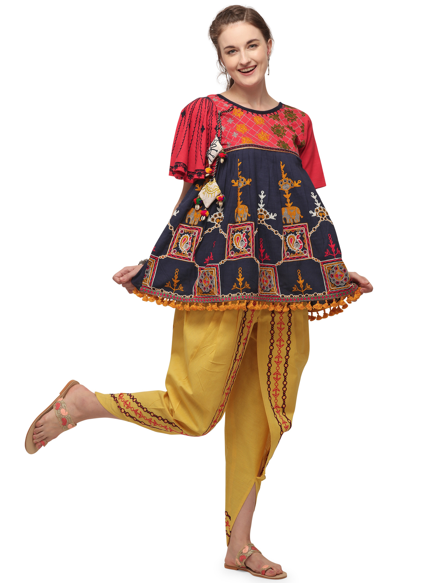 This tomato and navyblue kedia is crafted in organic khadi cotton. It is embroidered with minute aari work in different foke motifs. It has a round neck line and a umbrella sleeves on one side. It is Embellished with fancy cotton laces and hand made potli latkans attached with a string. The kedia is paired with a free size yellow tulip pant which has embroidery border in front. This beautiful outfit is perfect for navratri festivel and other festive occasions.