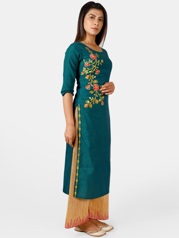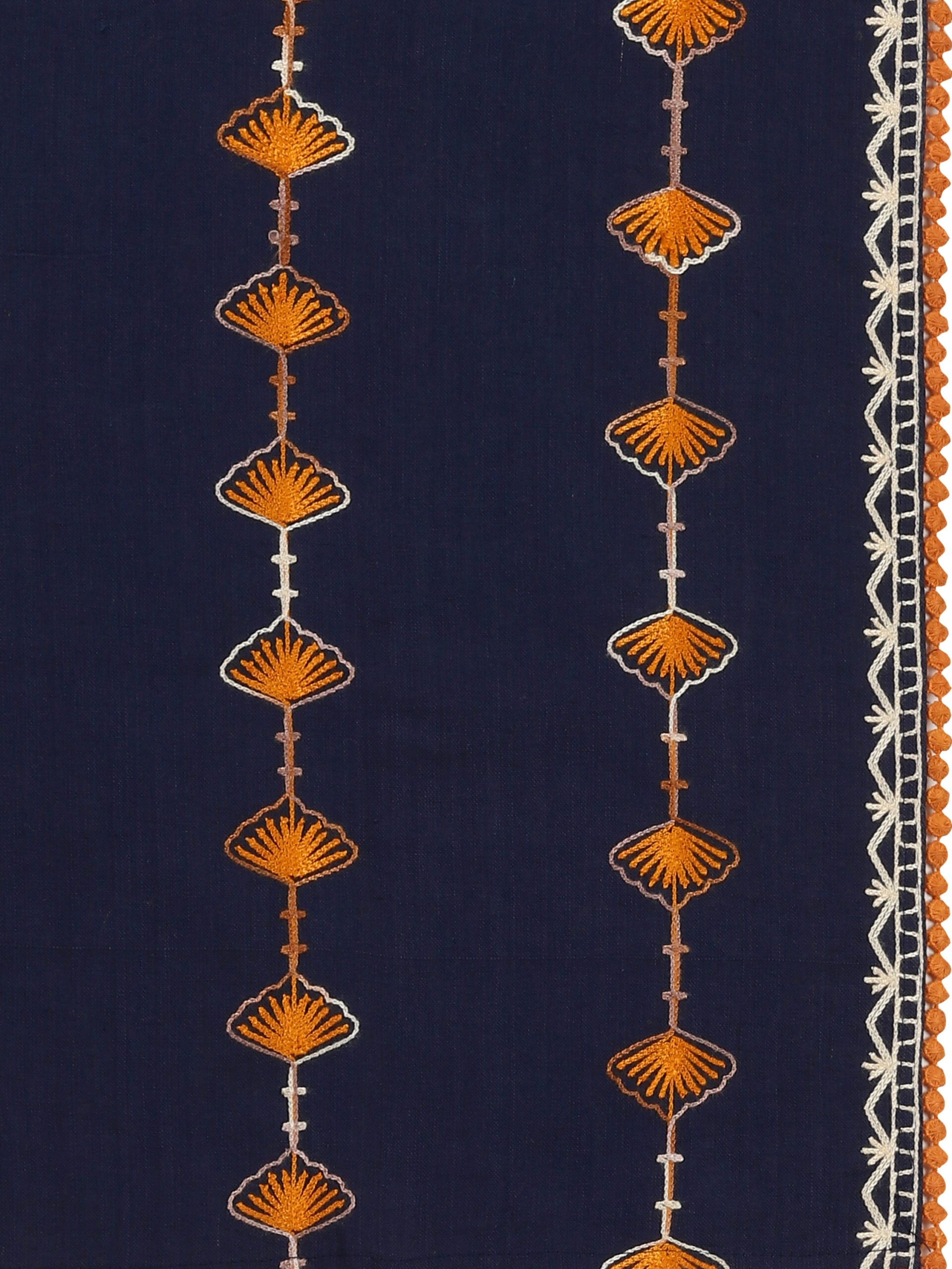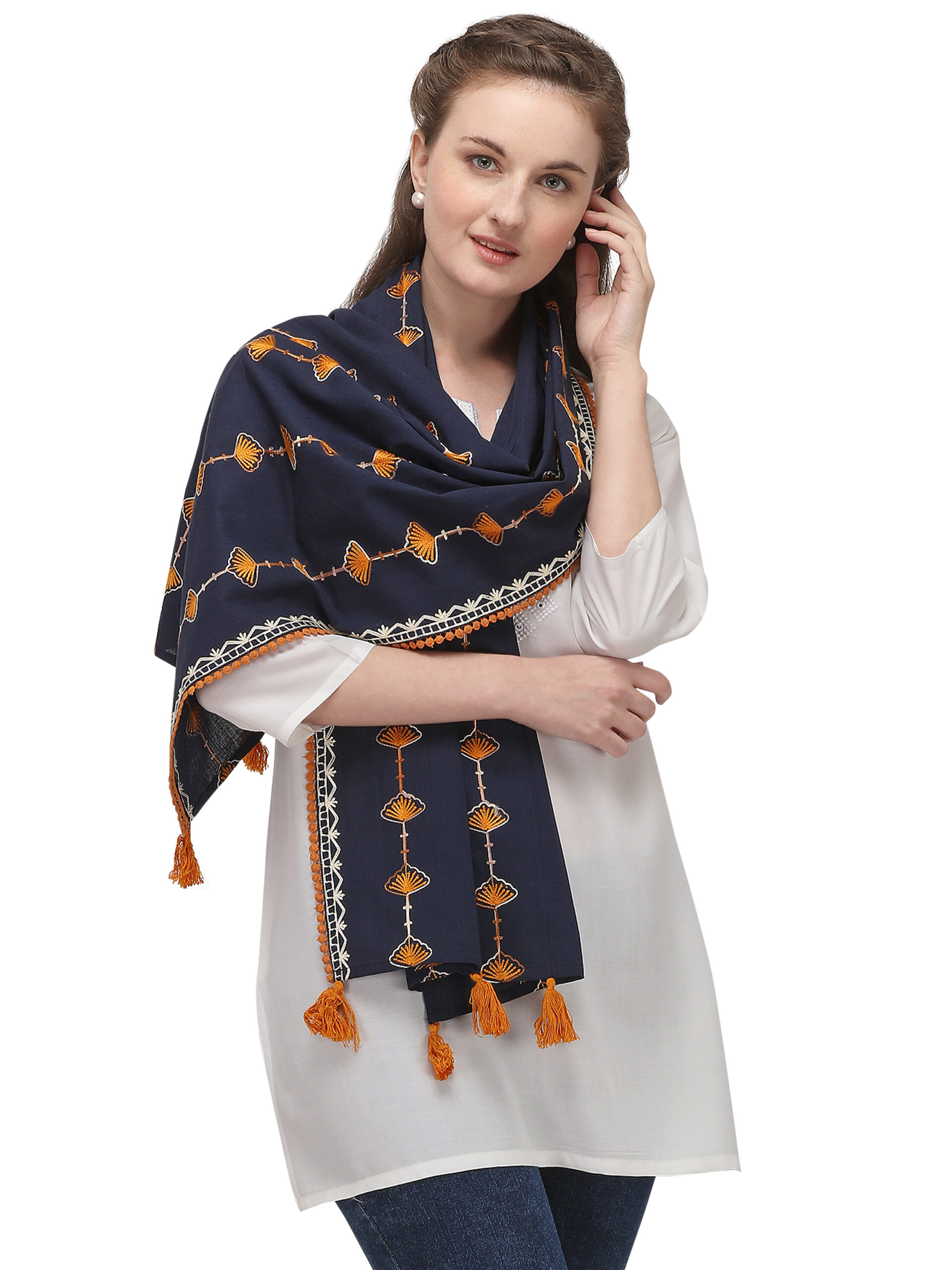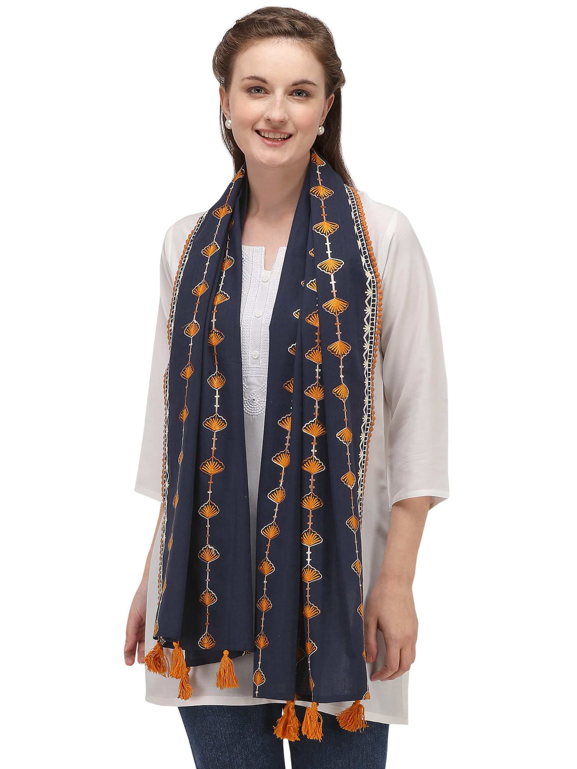 Navy blue khadi cotton stole/scarf embelished with marrigold flower pattern two tone thread arranged in a row in equal interwals. It is fenced from one side with contrast cotton dyed bundi lace. embelished with hand made tassels tucked on both the sides. The stole is perfect for your casual outfit. it can be wore in any seasons this makes it multi purpose stole for every season.