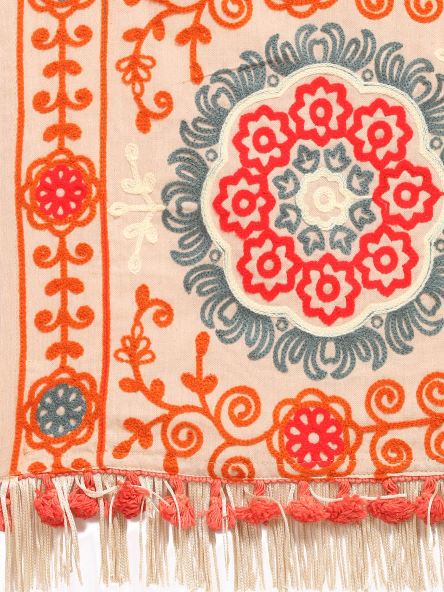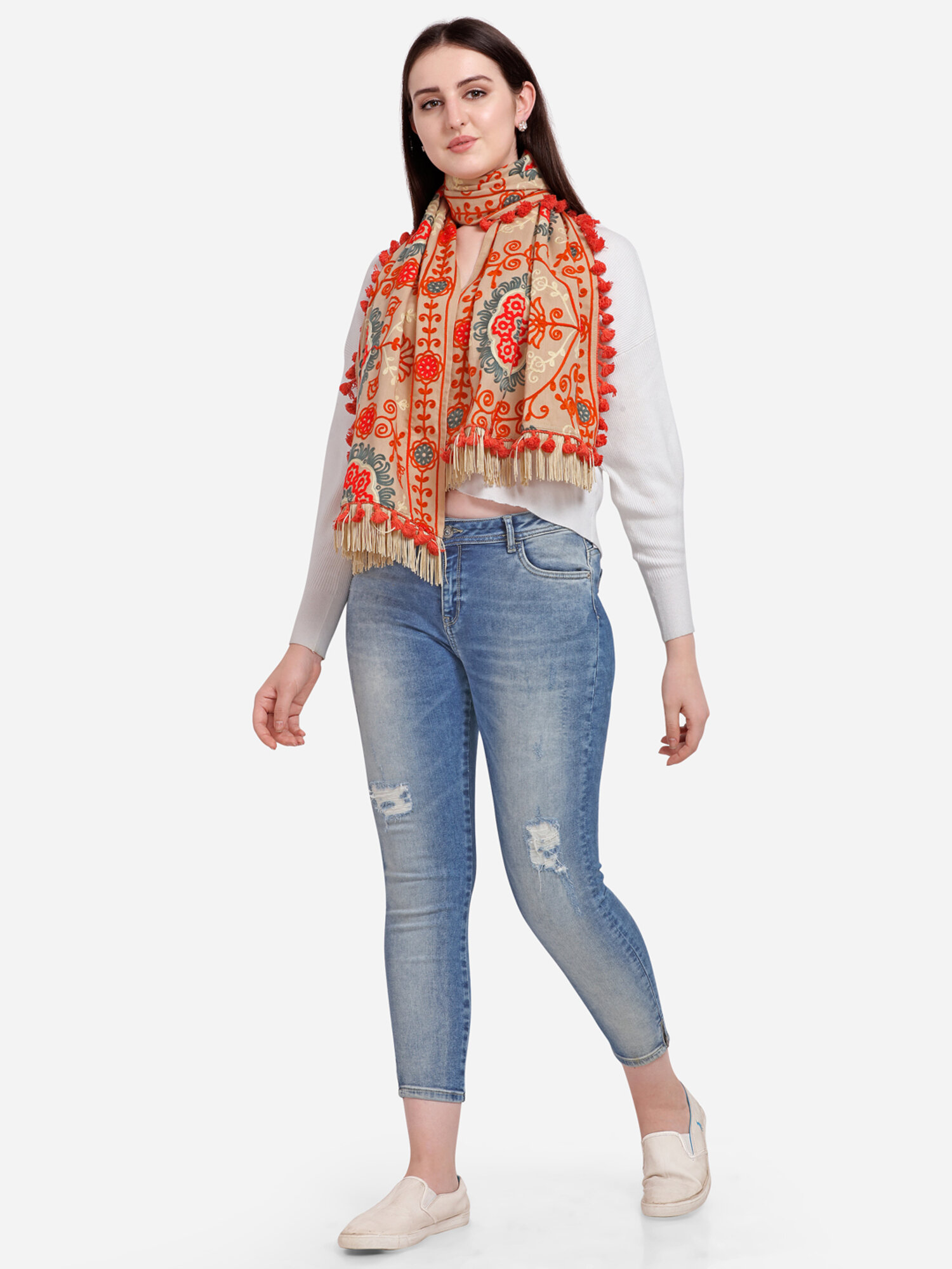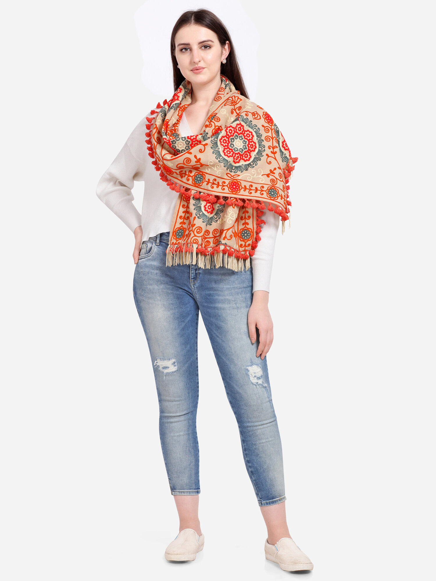 This Beige muffler is crafted in 100% khadi cotton fabric. It is fully embroidred with minute aari work in different floral motifs fenced with embroidered border. It is embellished with fancy fringe lace and dyed tassel lace. The muffler is Perfect for your casual outfit. its a multi seasonal stole can be wore in any season on any outfit. The khadi fabric gets softer after every wash this makes it special.