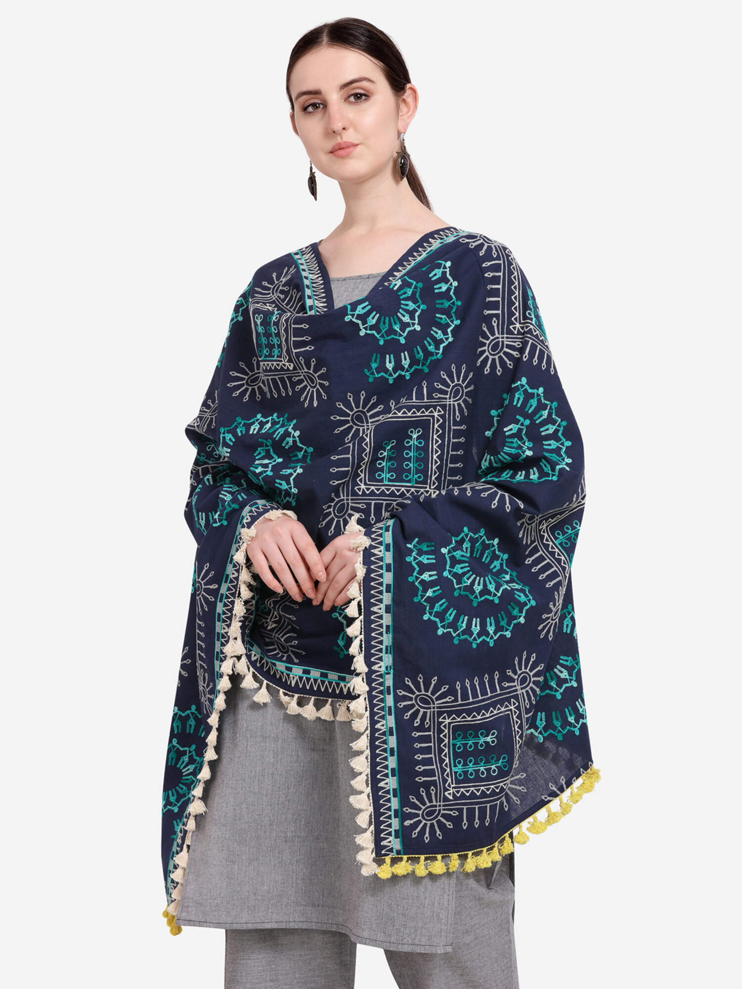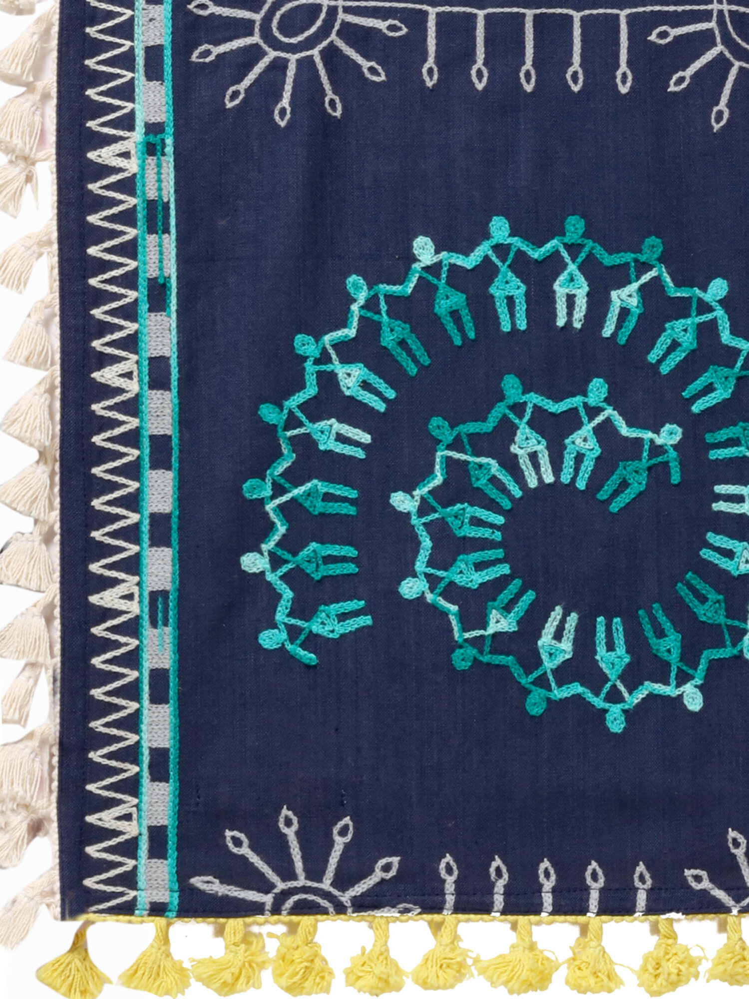 Navy Blue Warli Tribal Motif Aari Embroidered Khadi Shawl/Dupatta With Kaccha Tassel Lace