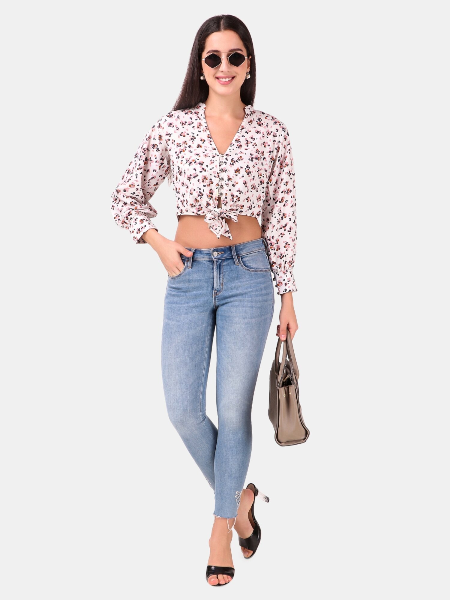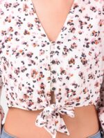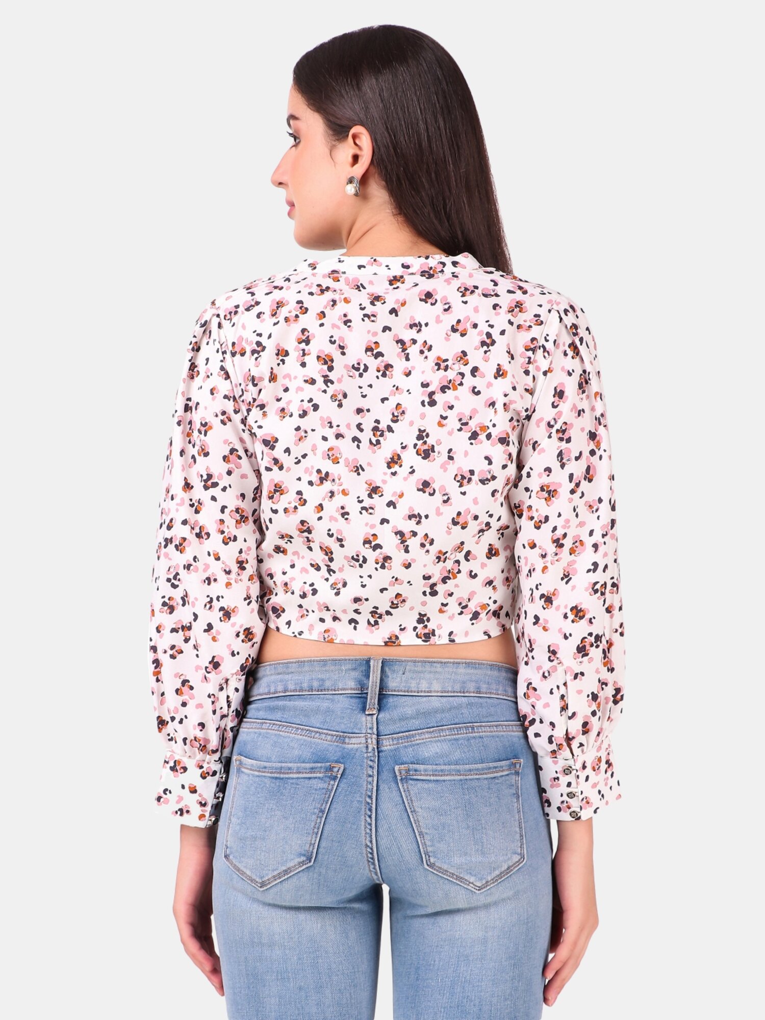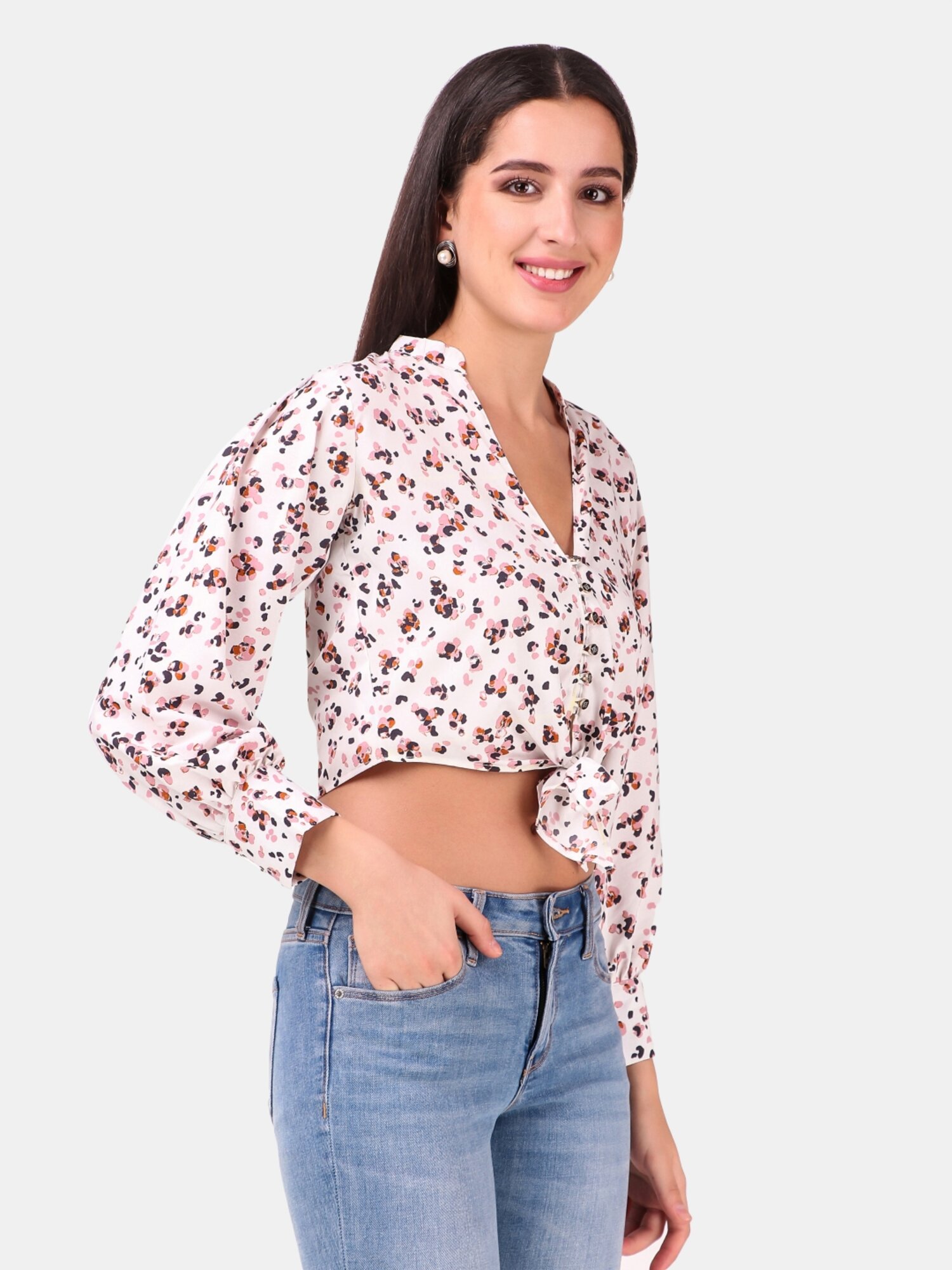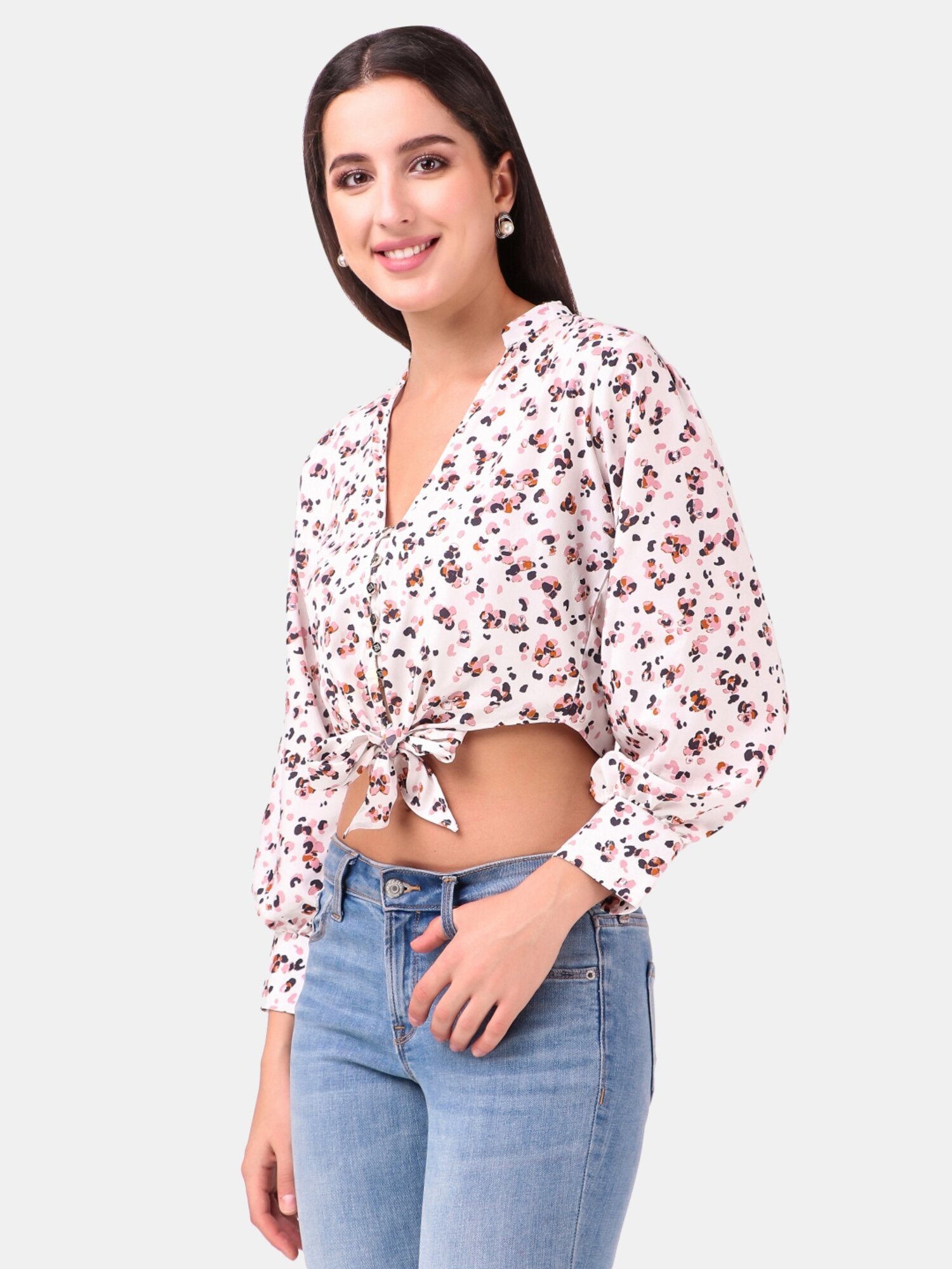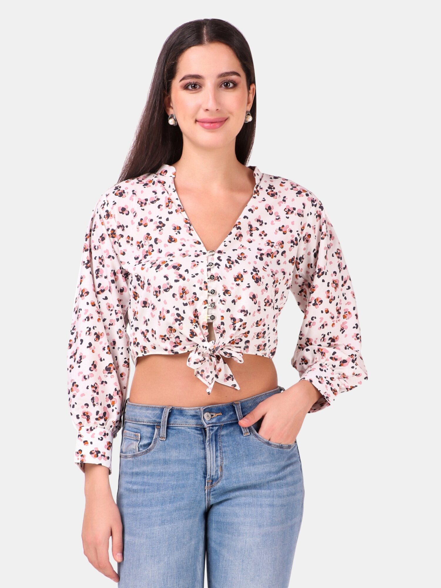 This off white animal printed top has front opening and a tie up pattern. it has v neck line and long full sleeves with button packing. A perfect top for sunday picnic.