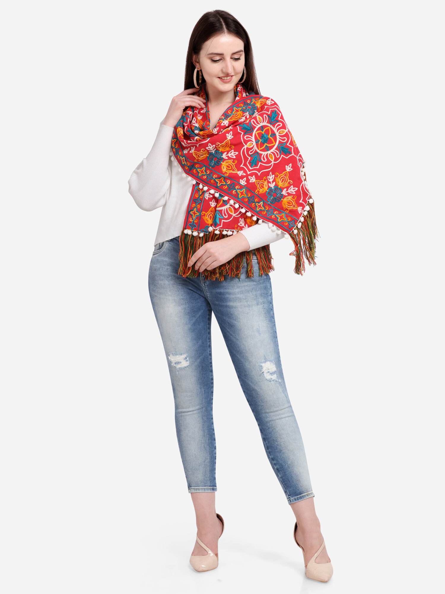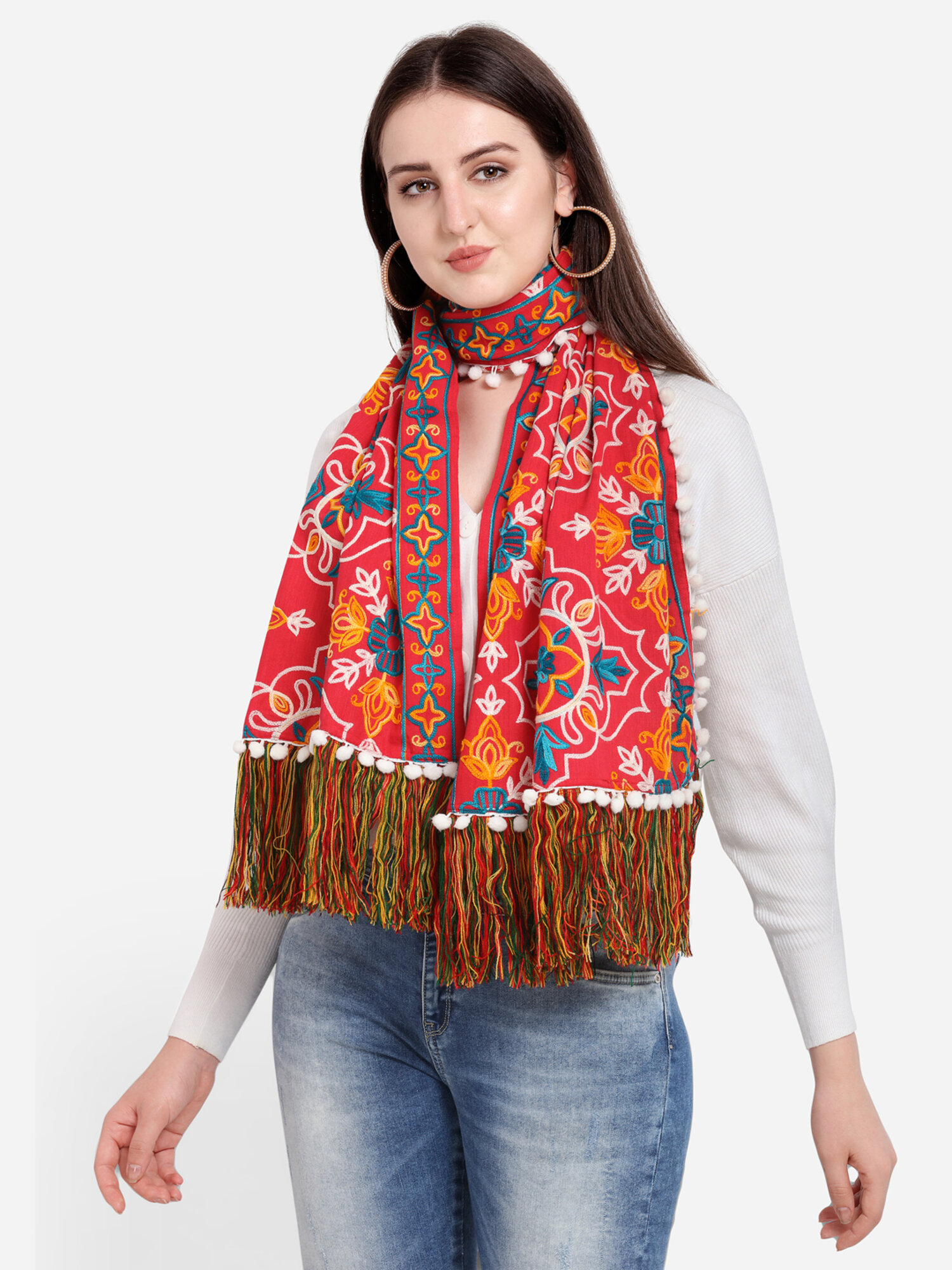 This Red muffler is crafted in 100% khadi cotton fabric. It is fully embroidred with minute aari work in different floral motifs with two tone woollen thread. It is embellished with fancy wollen long tassel lace and pom pom lace. The muffler is Perfect for your casual outfit. its a multi seasonal stole can be wore in any season on any outfit. The khadi fabric gets softer after every wash this makes it special.