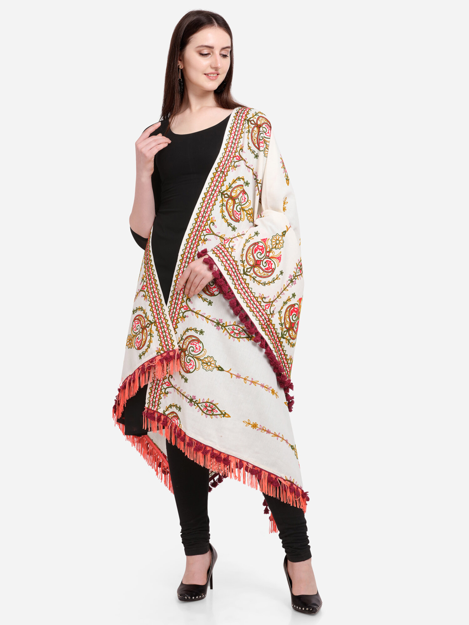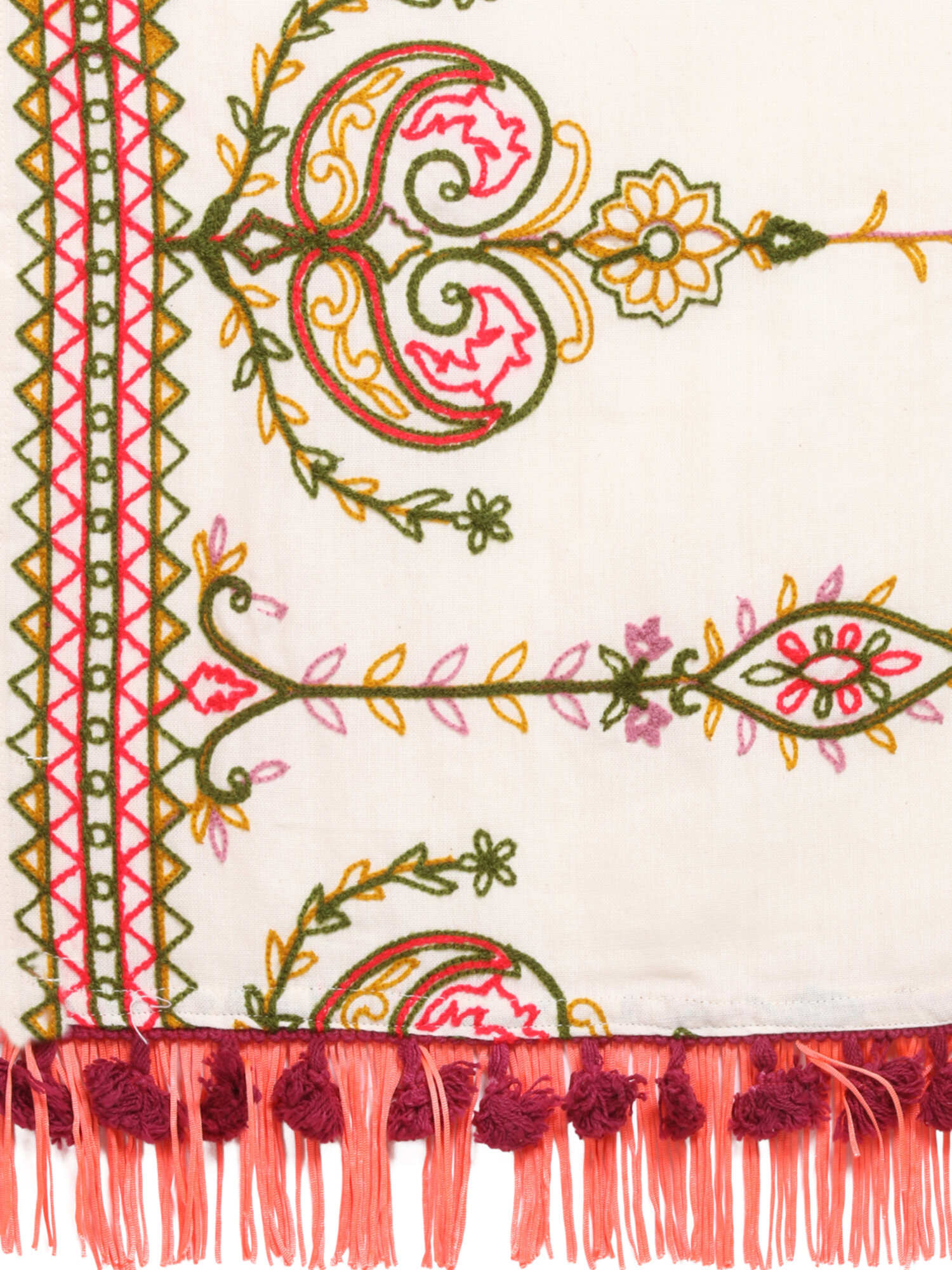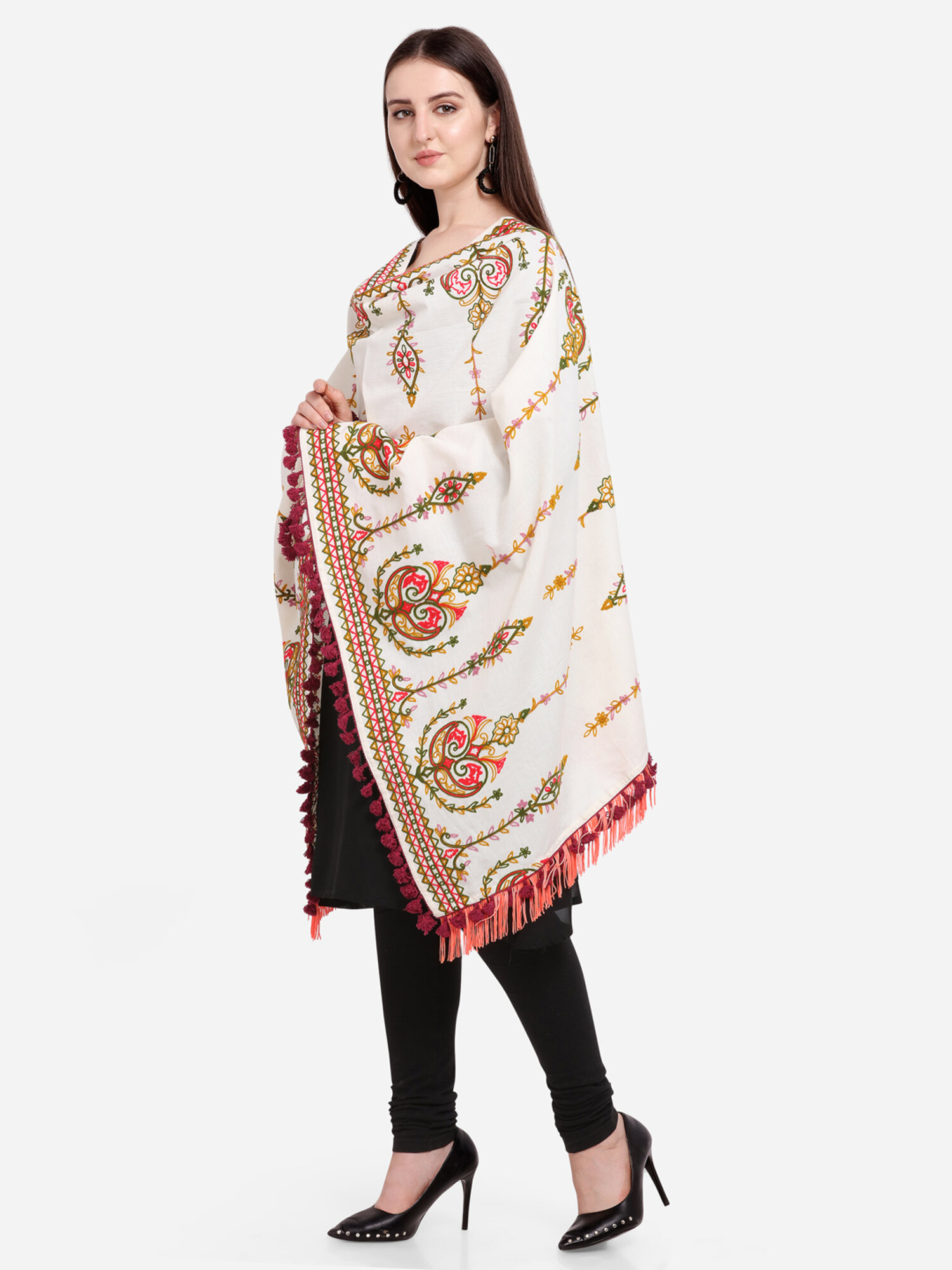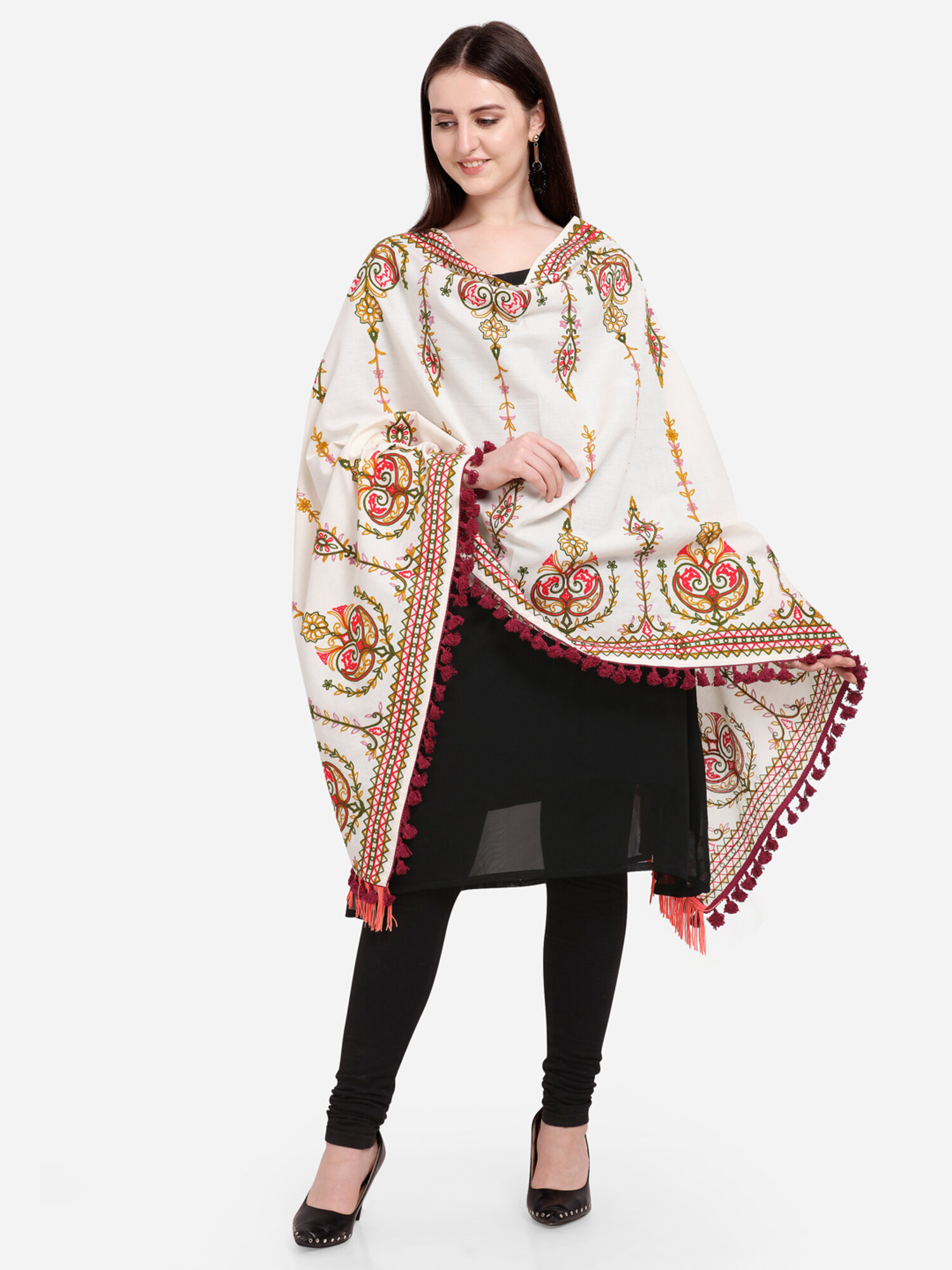 Be the first to review “Off-White Heavily Aari Embroidered Khadi Shawl/Dupatta With Wine Cotton Tassel” Cancel reply