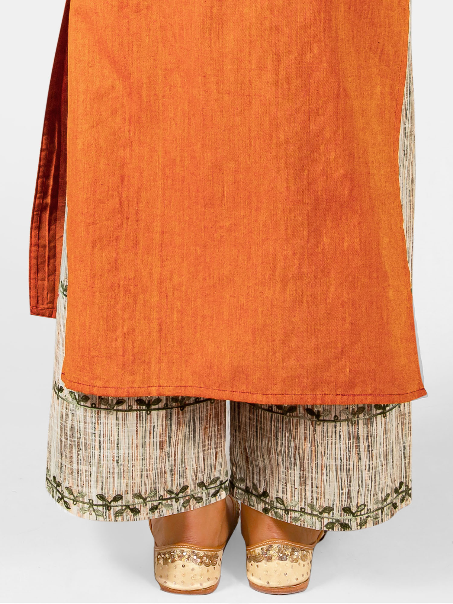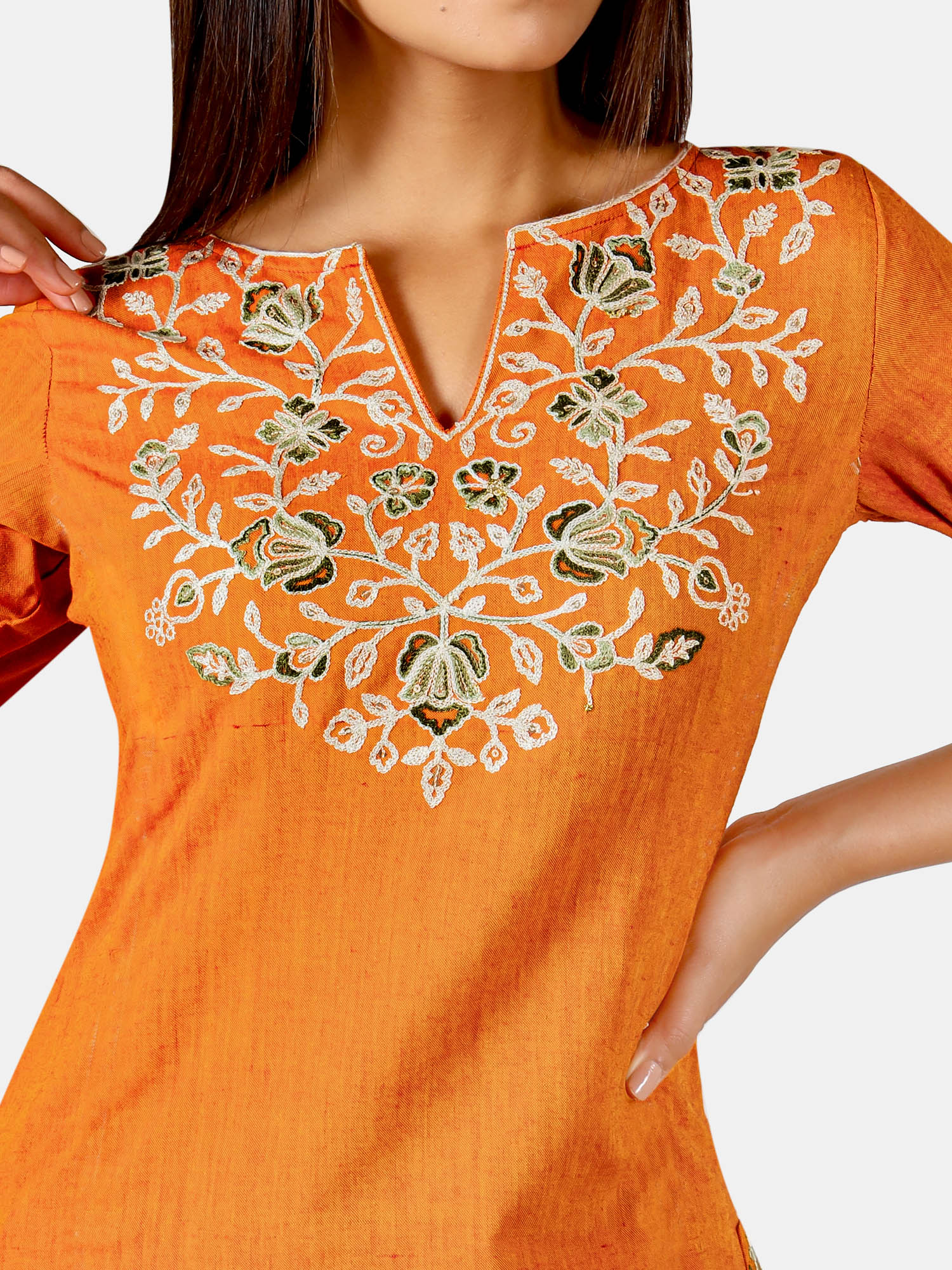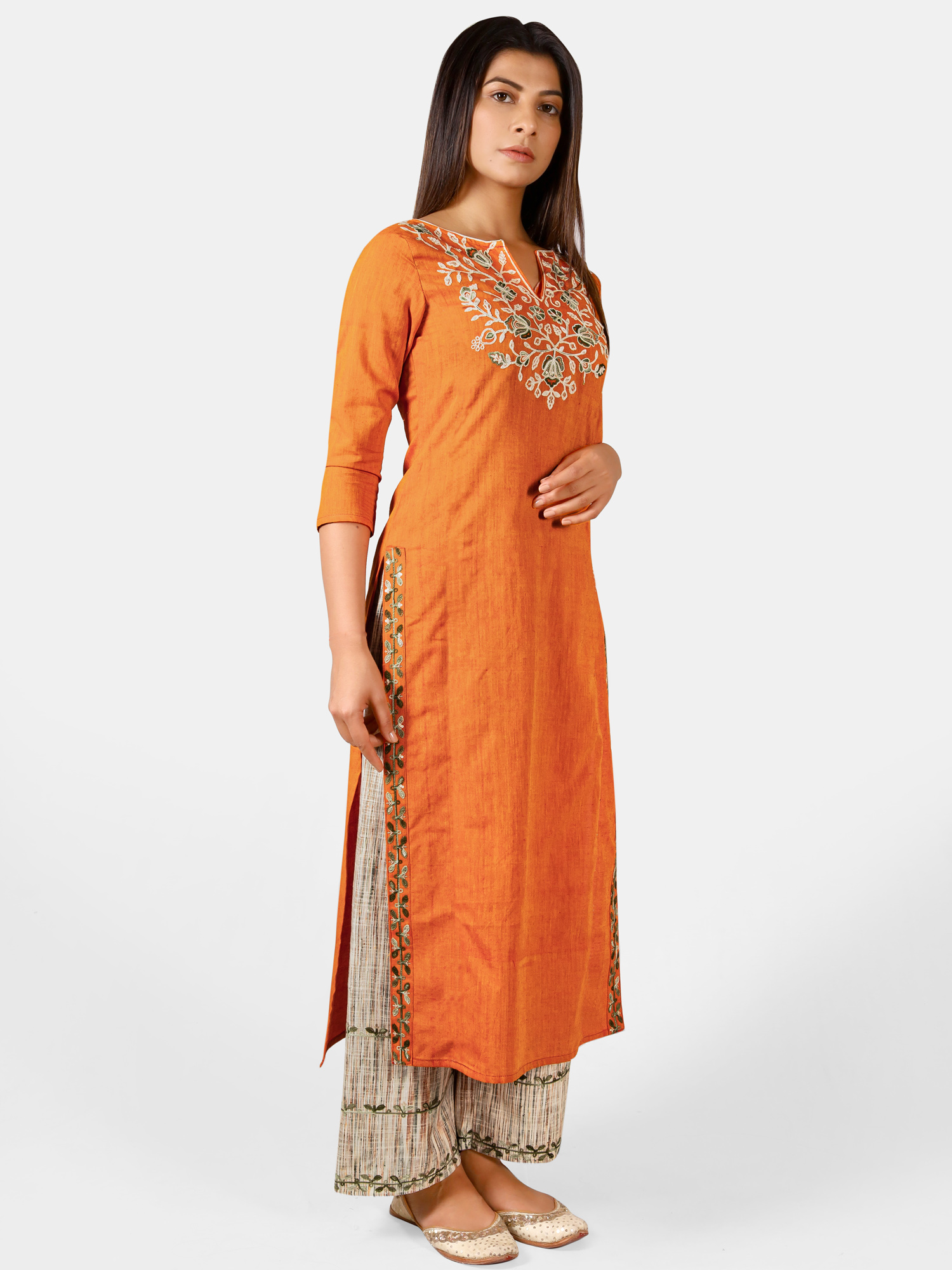 Orange long embroidered neck kurta with rust canvas palazzo pant