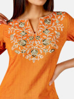 Orange long soft cotton kurti with floral embroidered neck line. It has a princess line pattern. It is featured with round neck line with V- cut at the front with 3/4th sleeves. This princes cut kurti has side slit cut which is embillished with minute embroidered lace. This beautiful kurti is paired with canvas slub palazzo pant which has embroidery at the bottom. The pant has all over elastic at the waist. The full pair makes a complete remarkable look for any lite occassion. The dress is as per the standard shoulder sizes. ( order one size bigger recommended)