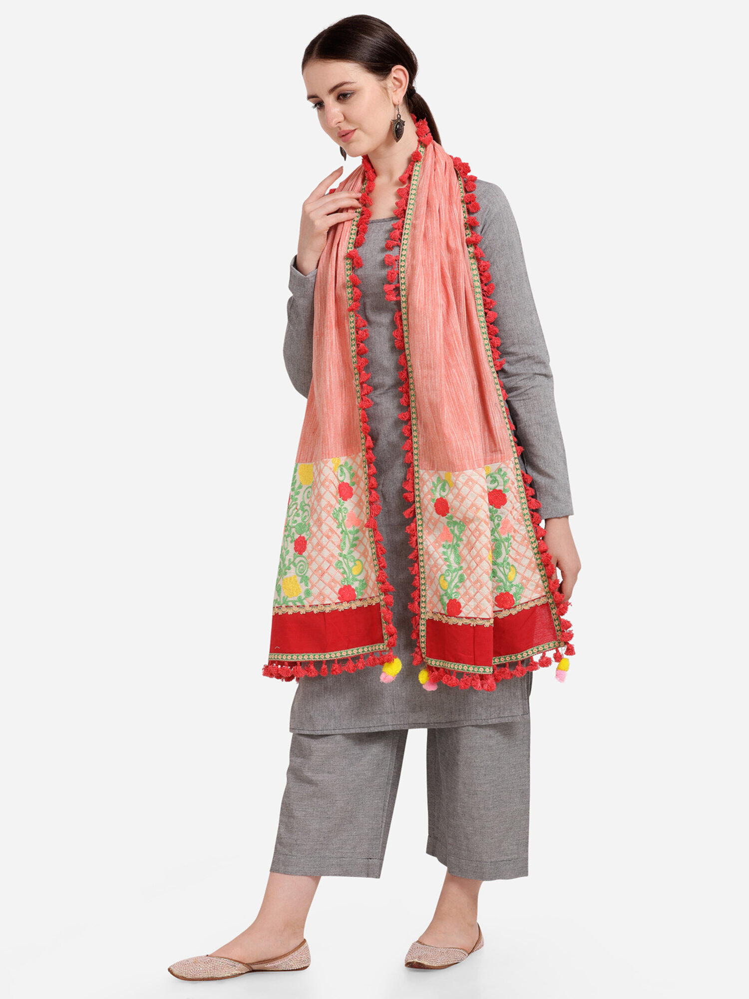This peach and white dupatta is crafted in organic khadi cotton. It is embroidered with floral motif. This dupatta is attached with panels on both the sides. It is embellished with fancy laces and tassel laces.This vibrant dupatta is perfect for your festive occassion.