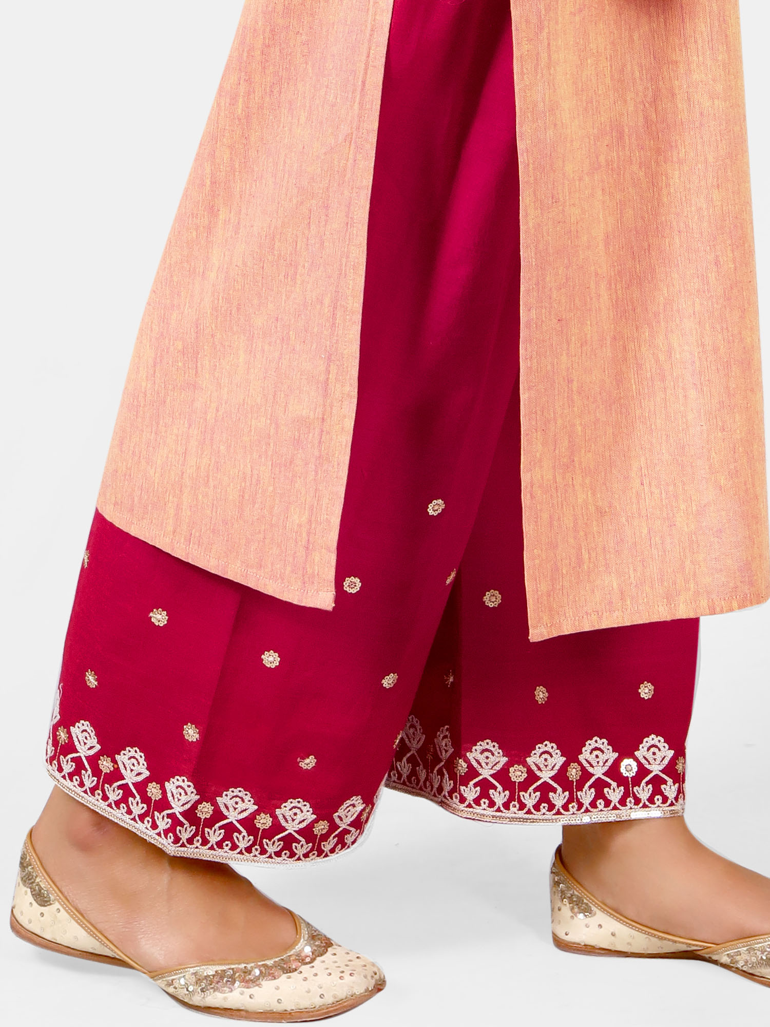 Peach long princess line long kurta with embroidered palazzo pant