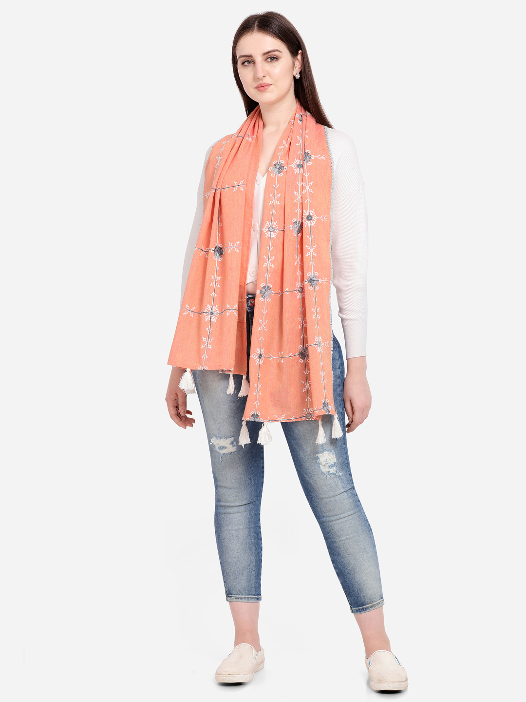 Be the first to review “Peach Snowflake Embroidered rich khadi scarf/stole” Cancel reply