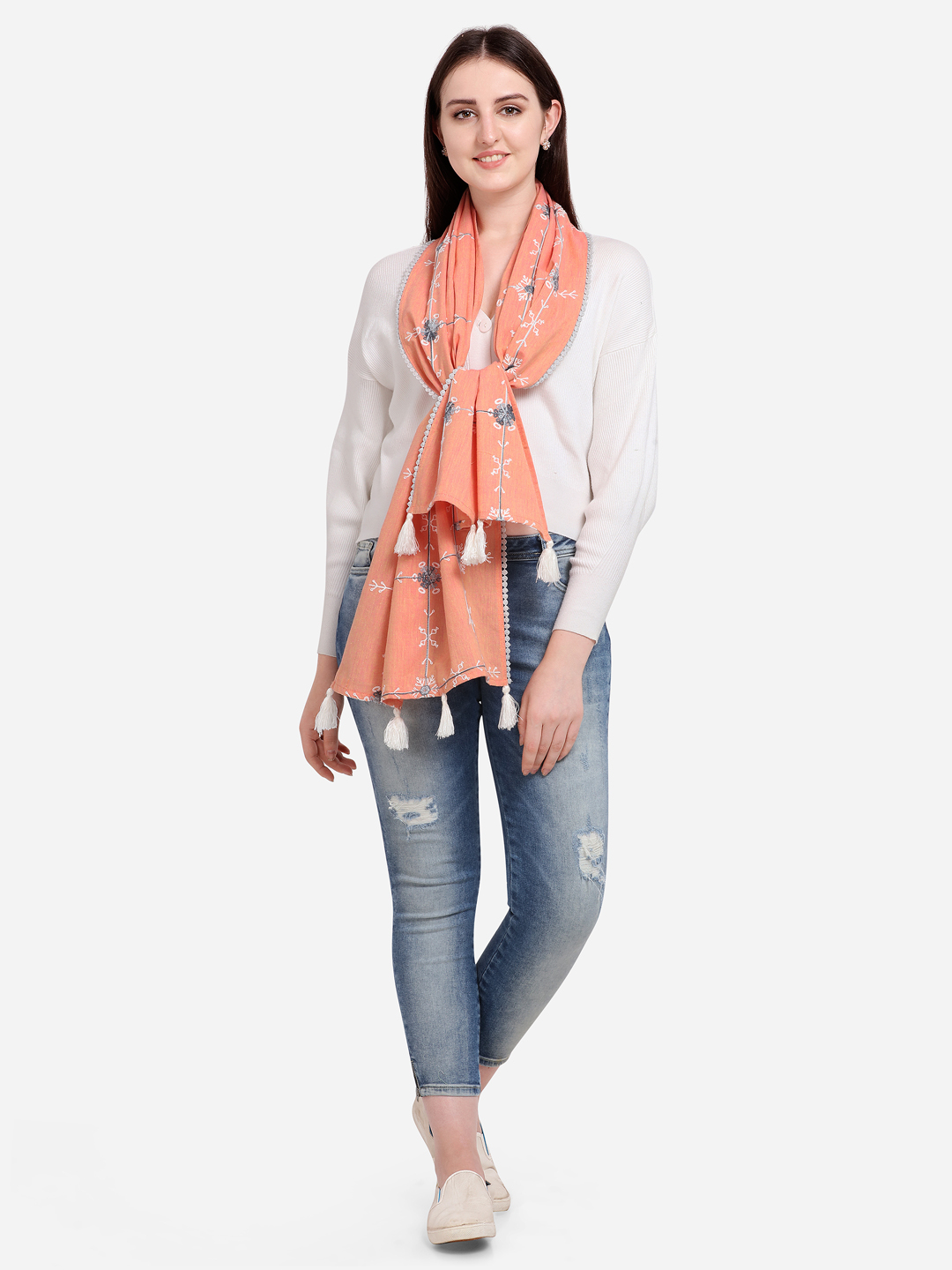Embelished with hand made tassels tucked on both the sides. The stole is perfect for your casual outfit. it can be wore in any seasons this makes it multi purpose stole for every season.