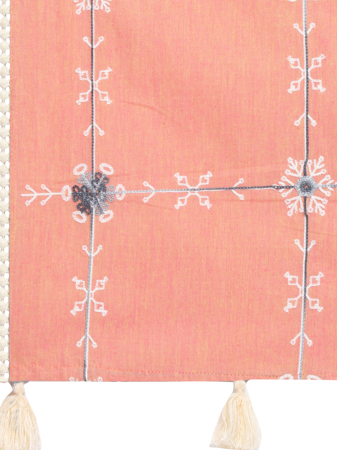 Peach two tone khadi cotton stole/scarf is embroidred with snow flakes motif placed in chex pattern . It is fenced from one side with cotton dyed bundi lace.