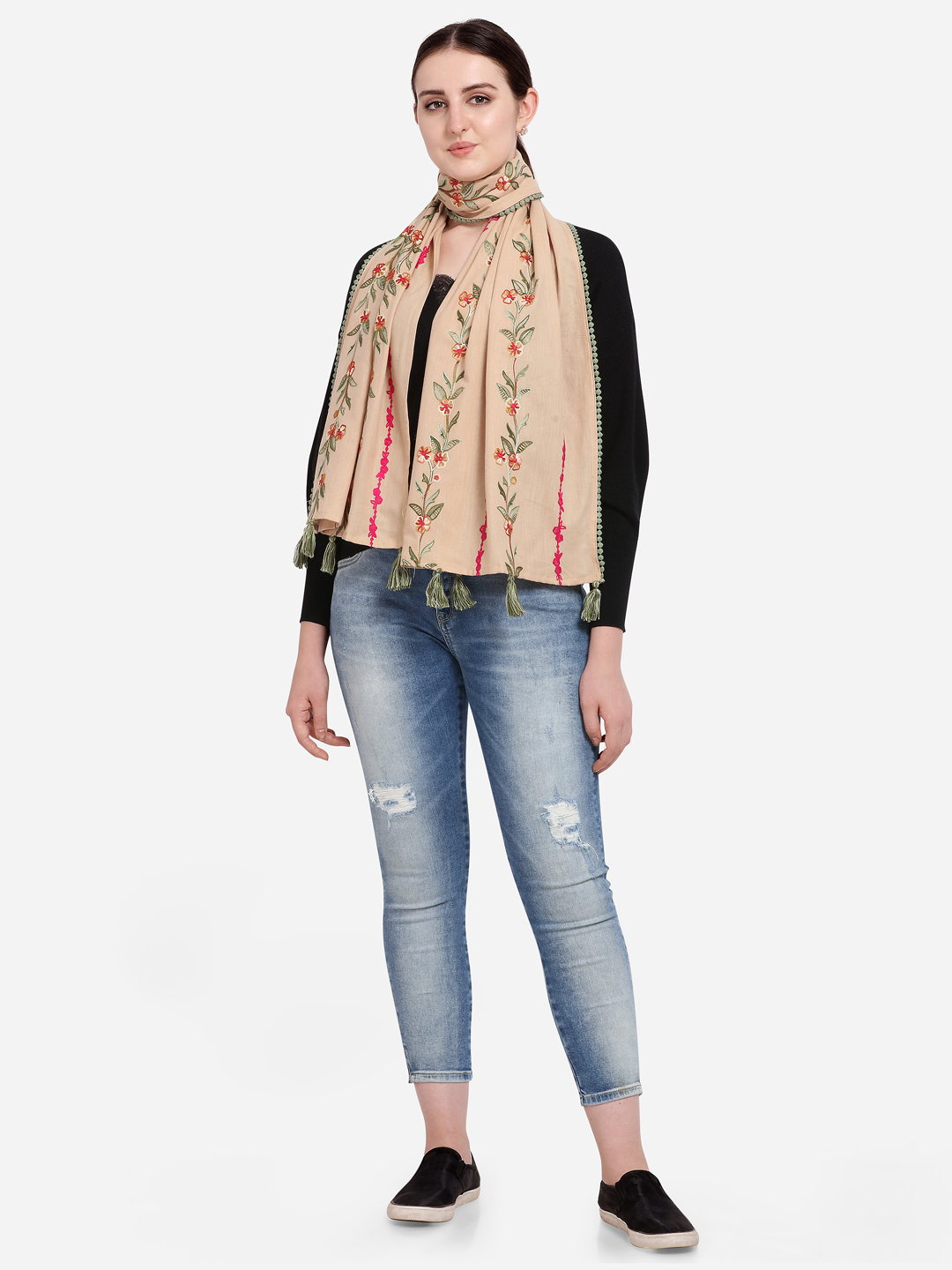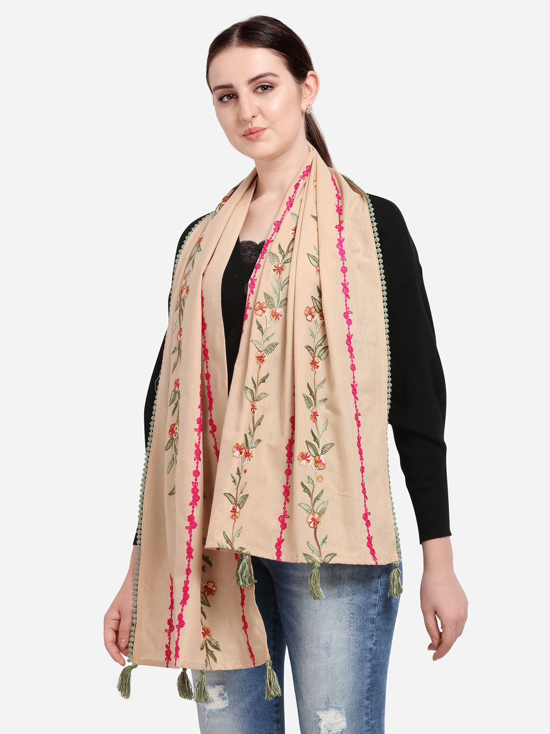 embelished with hand made tassels tucked on both the sides. The stole is perfect for your casual outfit. it can be wore in any seasons this makes it multi purpose stole for every season.