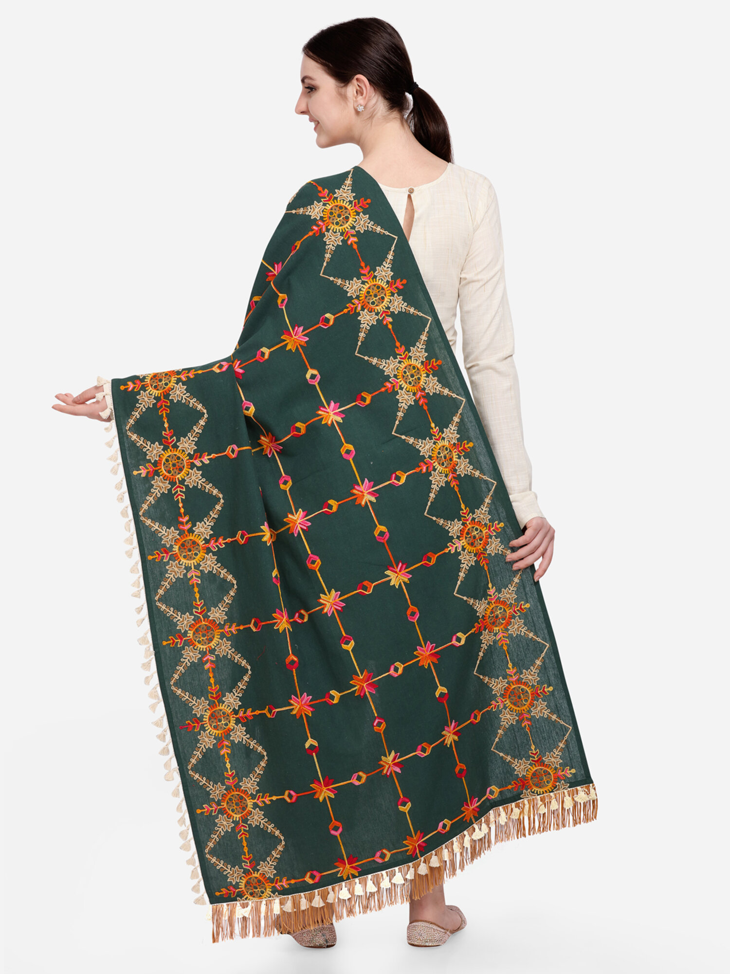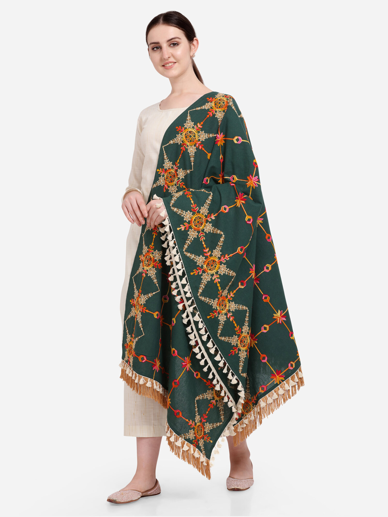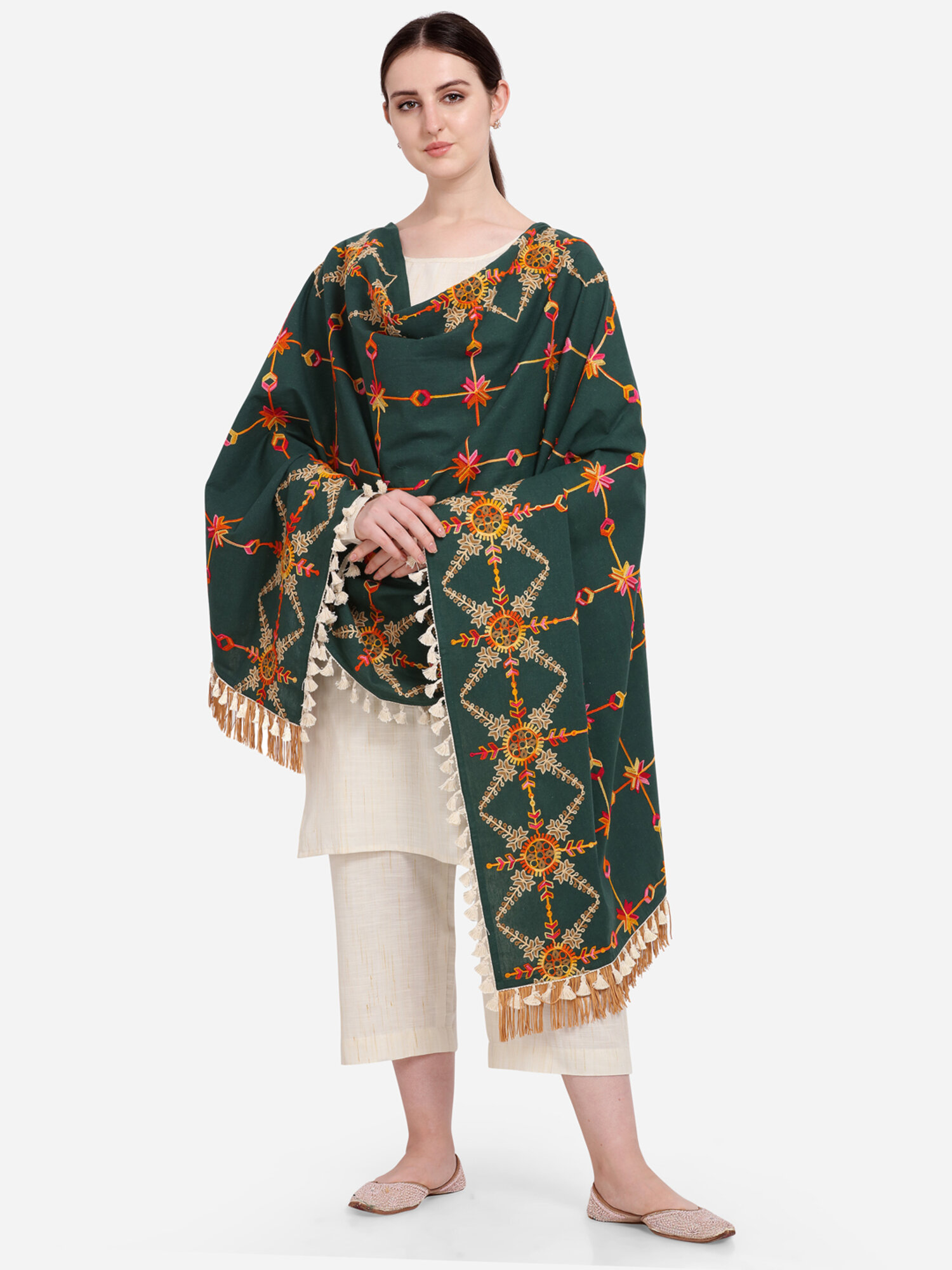 Poison Green Heavily Aari Embroidered Khadi Shawl/Dupatta with Kaccha Tassel Lace