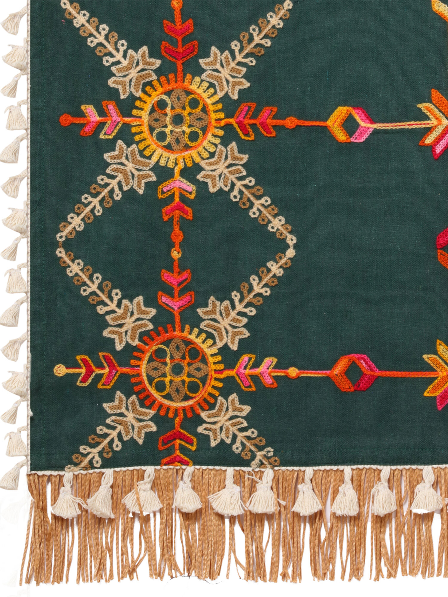This poison green shawl/dupatta is crafted in organic khadi cotton fabric. It is Heavily aari Embroidered with different star motif attached with chex pattern. It is fenced with cotton tassel lace and fringe lace on both the ends. For winters it is perfect as a fancy shawl and for festive it is perfect to carry on your fancy outifit.