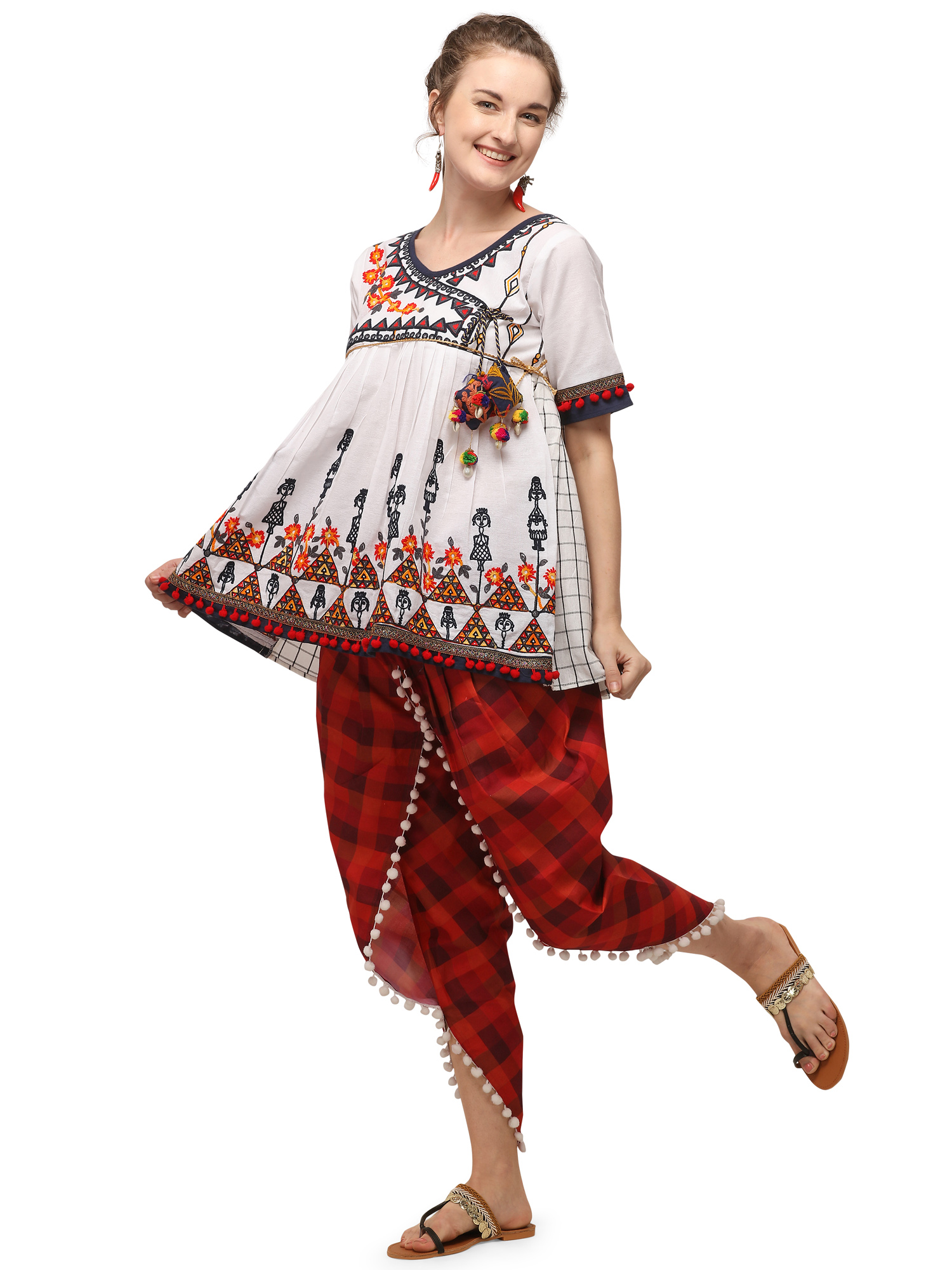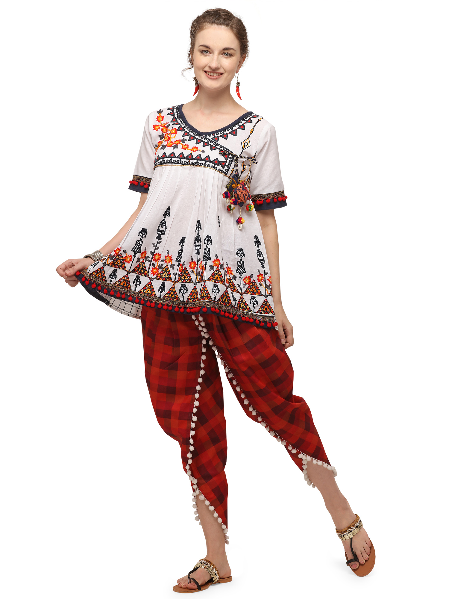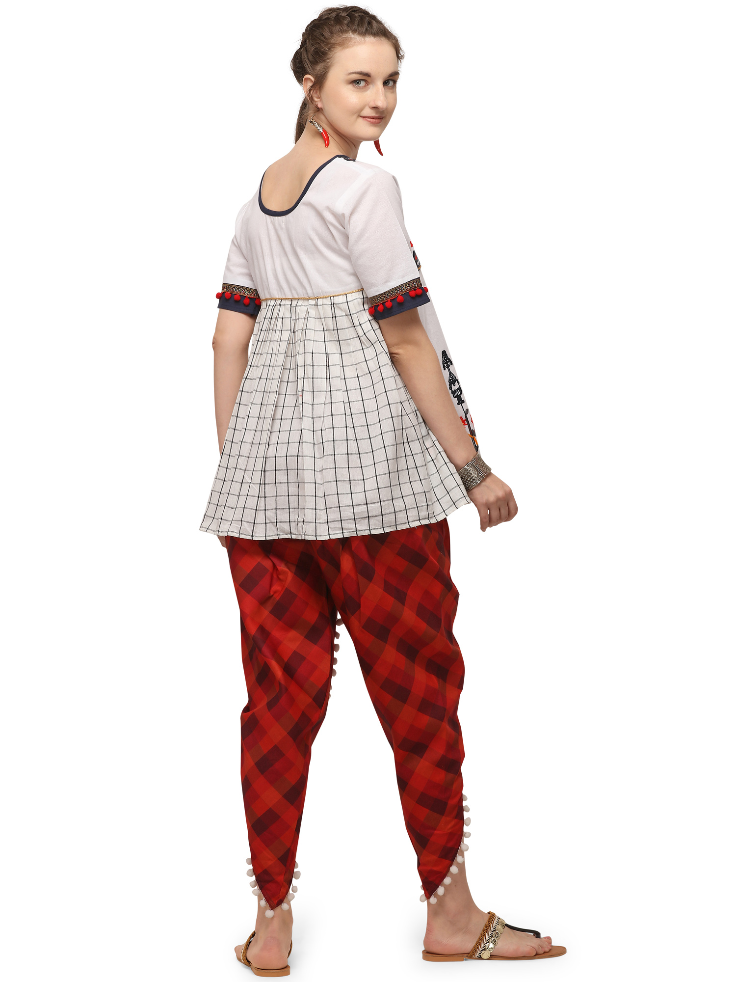 This pure white angrakha kedia is crafted in organic khadi cotton. It is embroidered with minute aari work in hanging doll foke motif. It has a angarakha neck line fully fenced with embroidered border with 10″ sleeves. It is embellished with fancy golder lace and dyed pom pom lace. Hand made potli latkans are attached in a yoke with a fancy string. This kedia is paired with rust chex tulip pant fenced with white pompom lace. This lovely outfit is perfect for your navratri festival and other festive occassions.