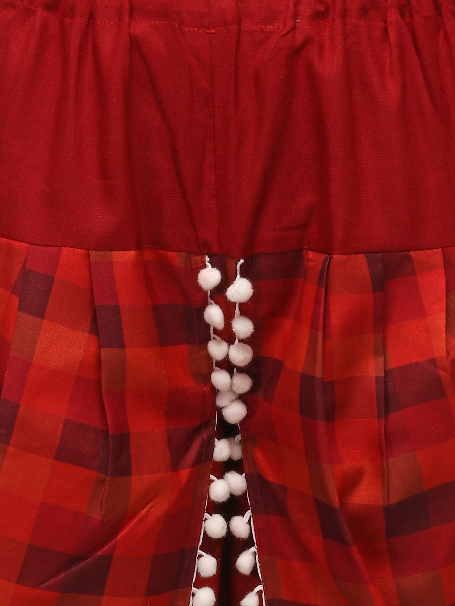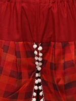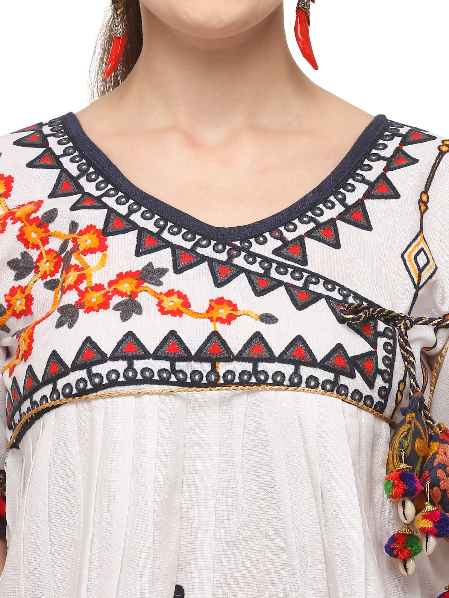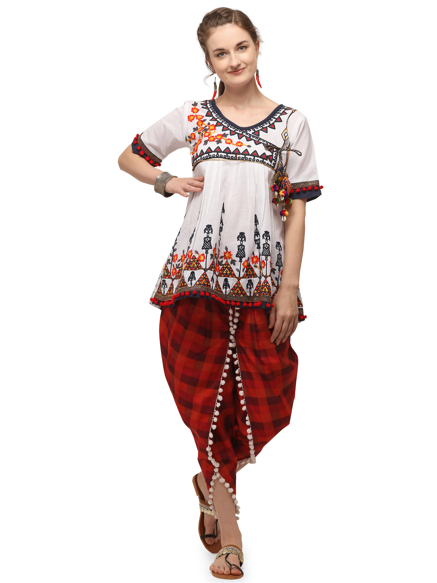 This pure white angrakha kedia is crafted in organic khadi cotton. It is embroidered with minute aari work in hanging doll foke motif. It has a angarakha neck line fully fenced with embroidered border with 10″ sleeves. It is embellished with fancy golder lace and dyed pom pom lace. Hand made potli latkans are attached in a yoke with a fancy string. This kedia is paired with rust chex tulip pant fenced with white pompom lace. This lovely outfit is perfect for your navratri festival and other festive occassions.