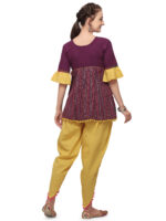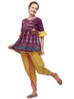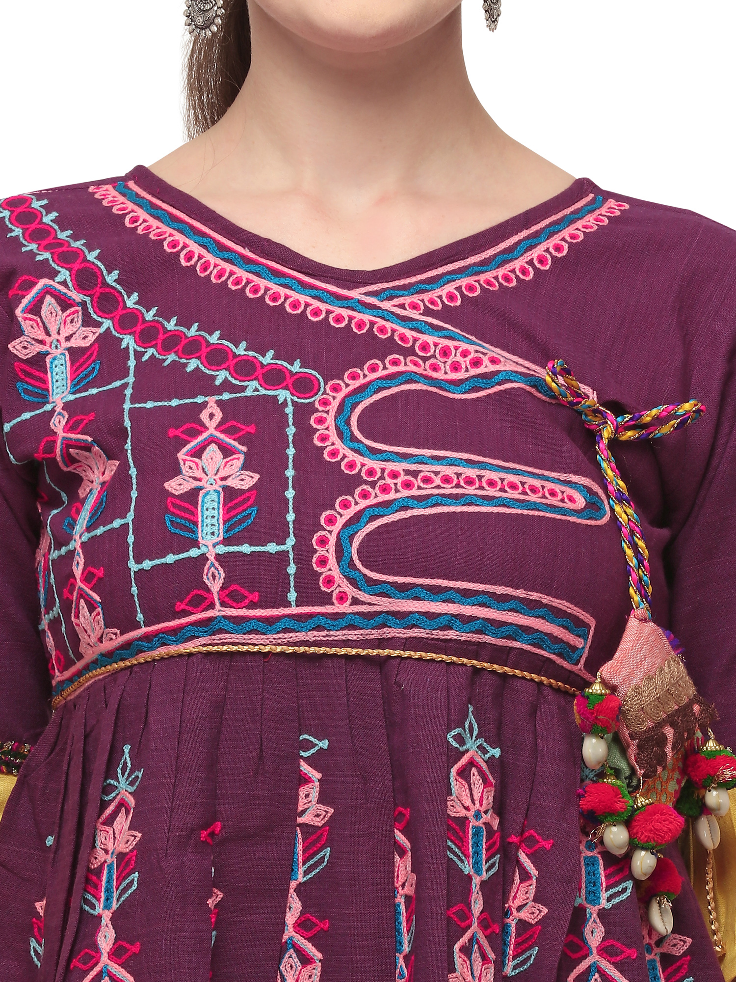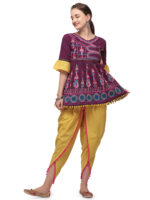 This deep purple kedia is crafted in organic khadi cotton. It is embroidered with minute aari work in diffrent foke motifs. It has a angrakha yoke patern with round neck line with 10″ sleeves attached with yellow frill. It is embellished with hand made potli latkans attached with multi color fancy string and dyed pom pom laces. It is paired with lemon yollow tulip pant which is fenced with tomato dyed pom pom lace. This vibrant outfit is perfect for your navratri and other festive occassions