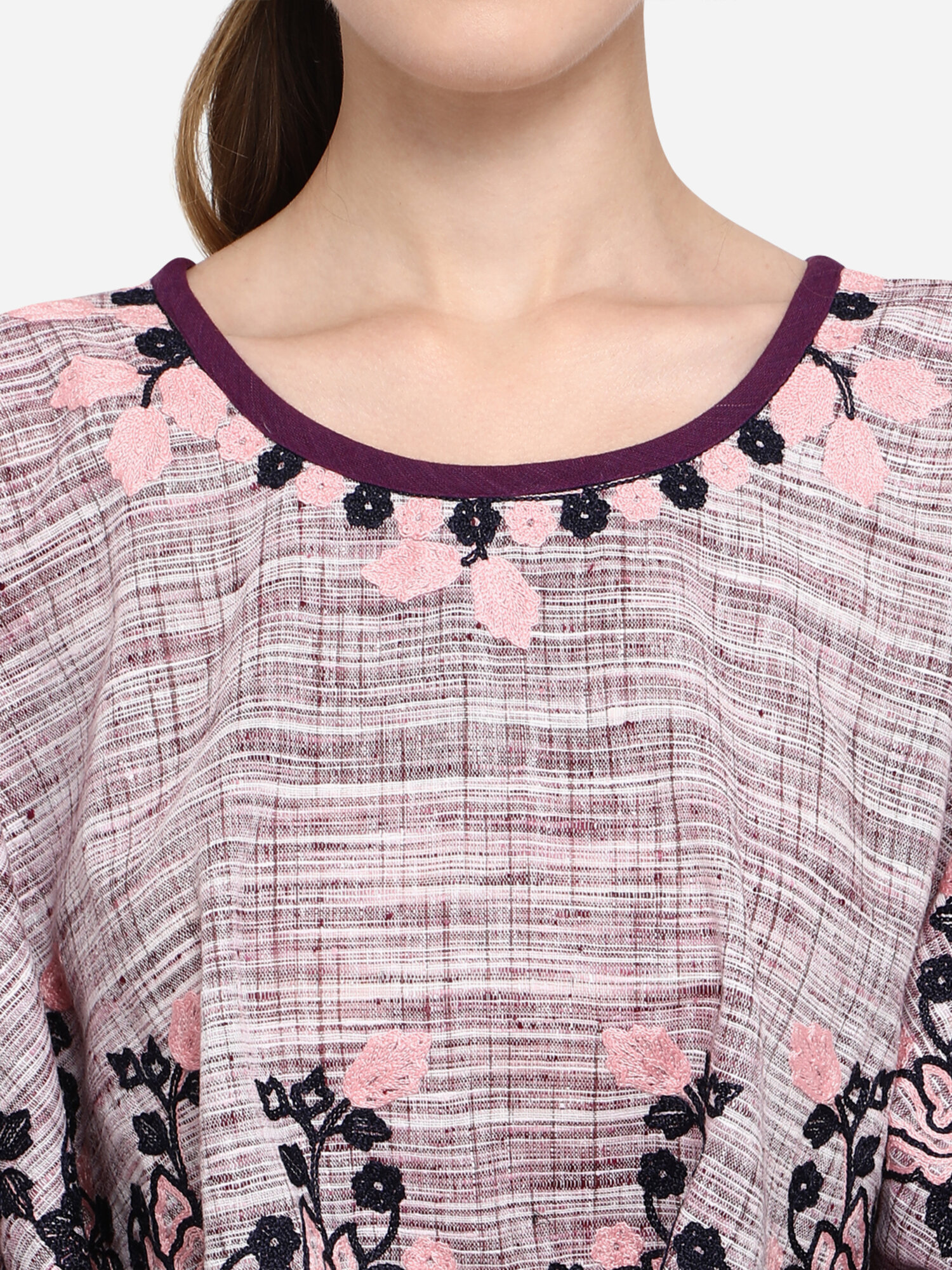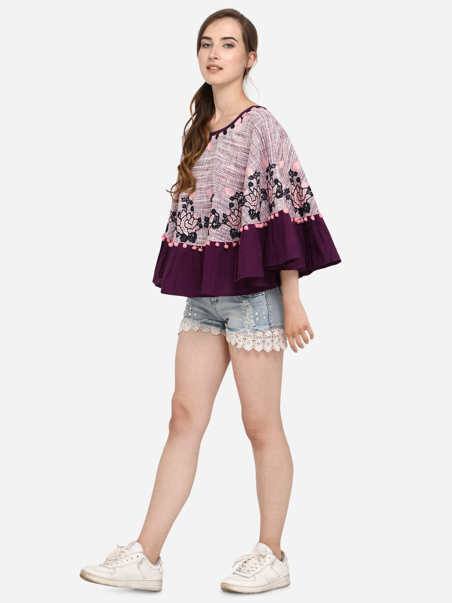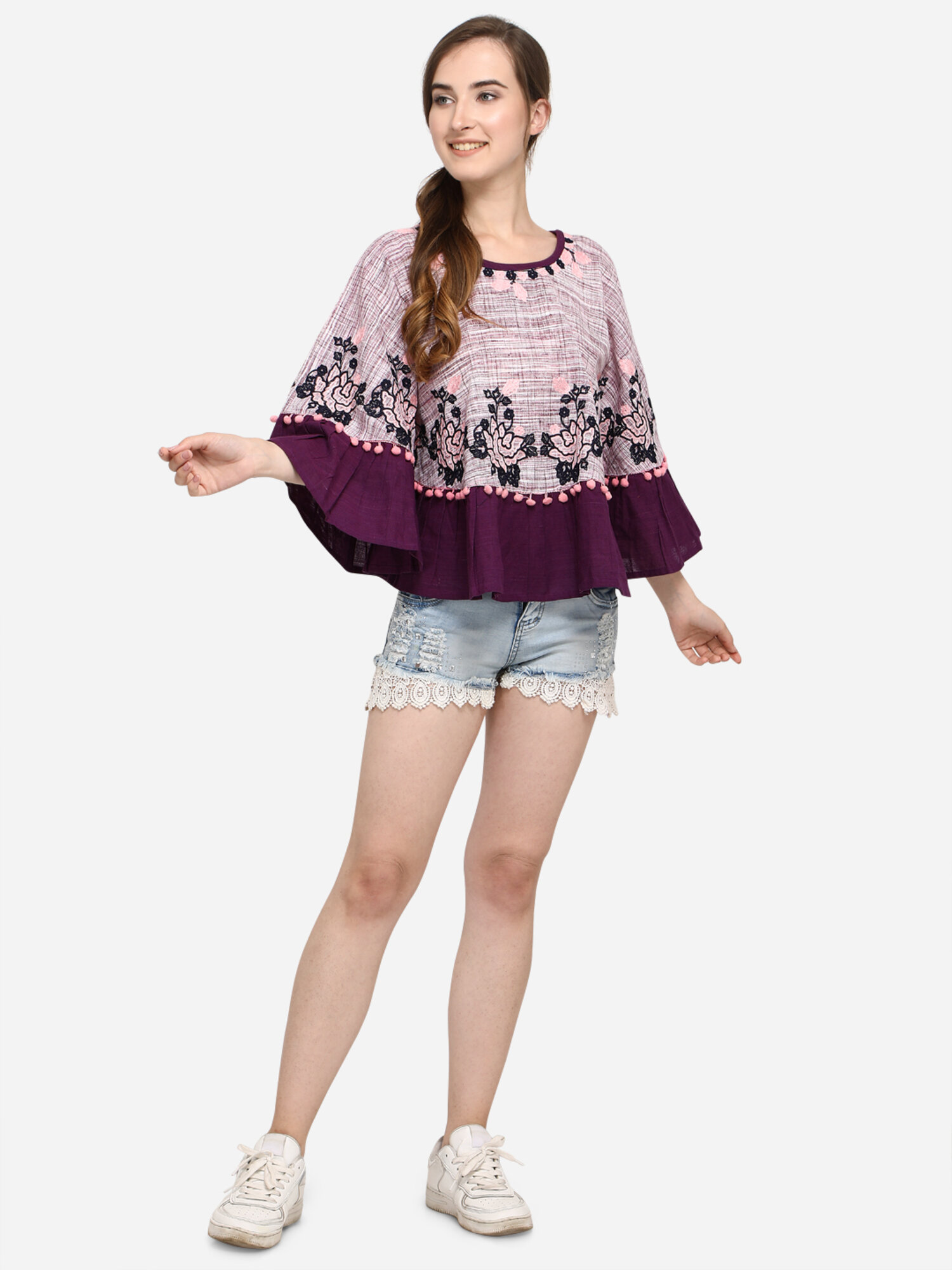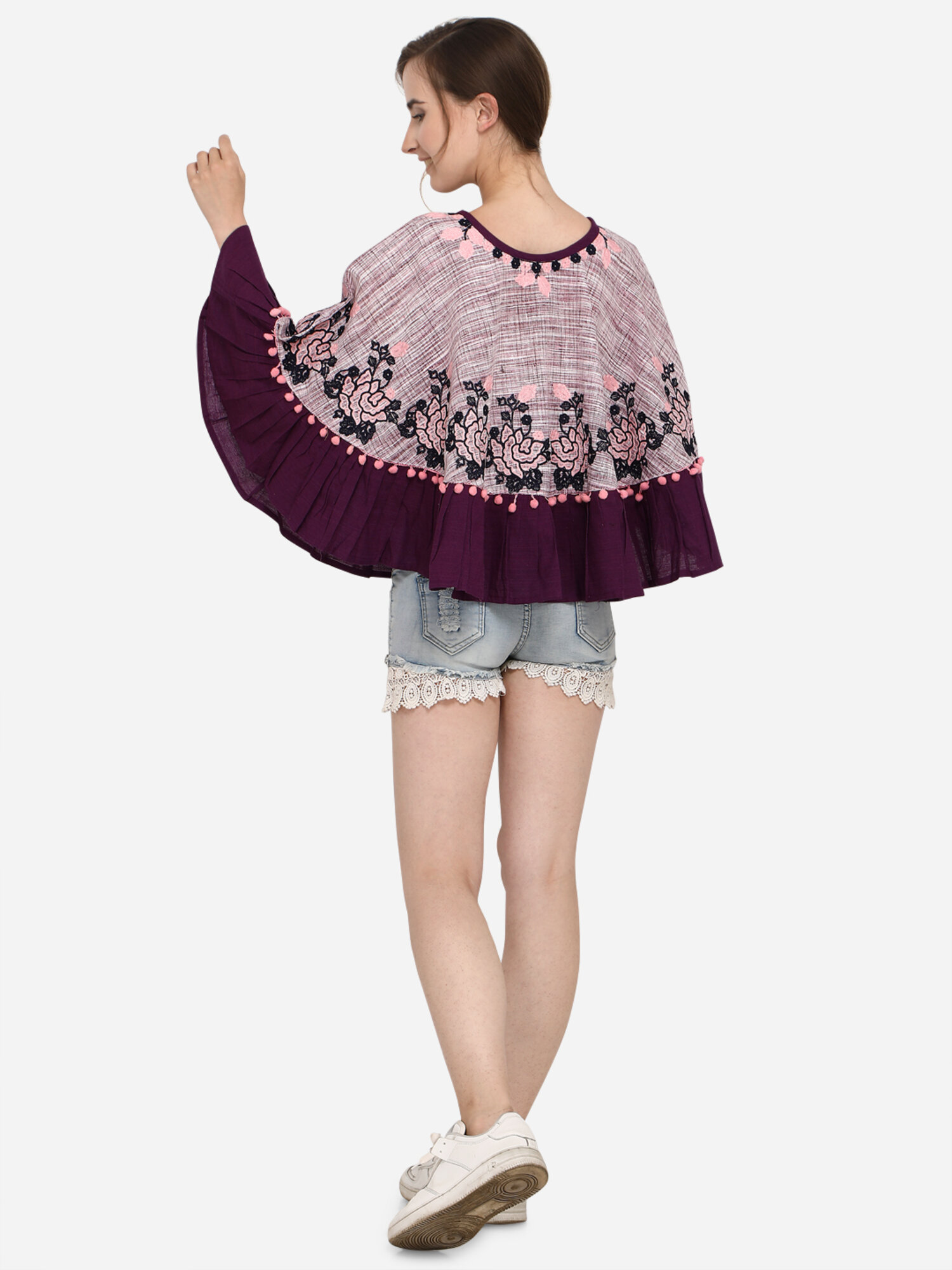 SLub Khadi Circular Embroidered Poncho has Front And Back Embroidery. Pure Khadi Fabric Poncho Has Zig-Zag Lace On Neckline. Purple Frill Is Pleated All Over The Edge To Make A Graceful Silhouette. Khadi Has A Unique Quality To Stay Warm In Winters And Cool In Summers. Making It Multi-Seasonal.?Circular in shape fits to all sizes